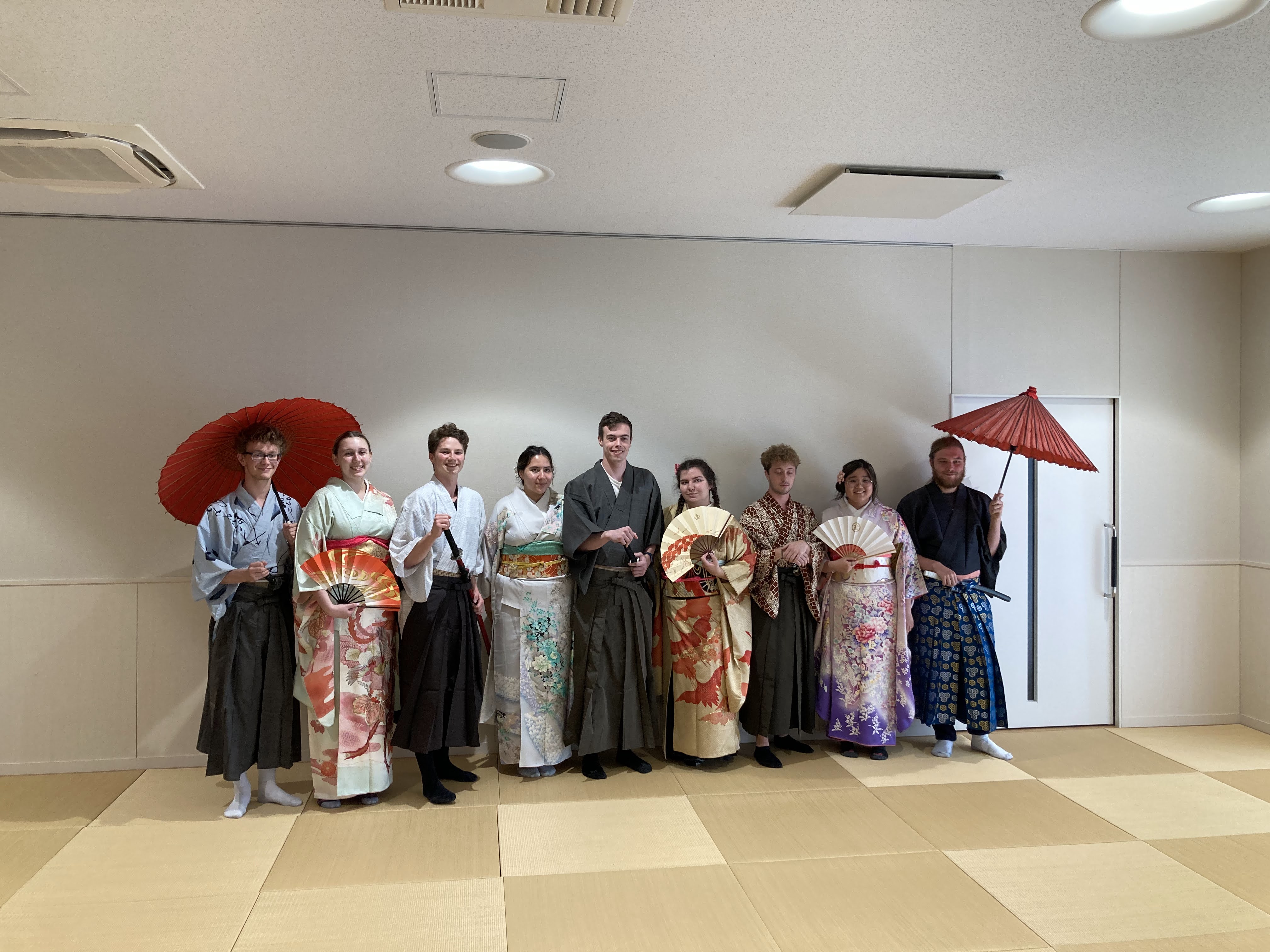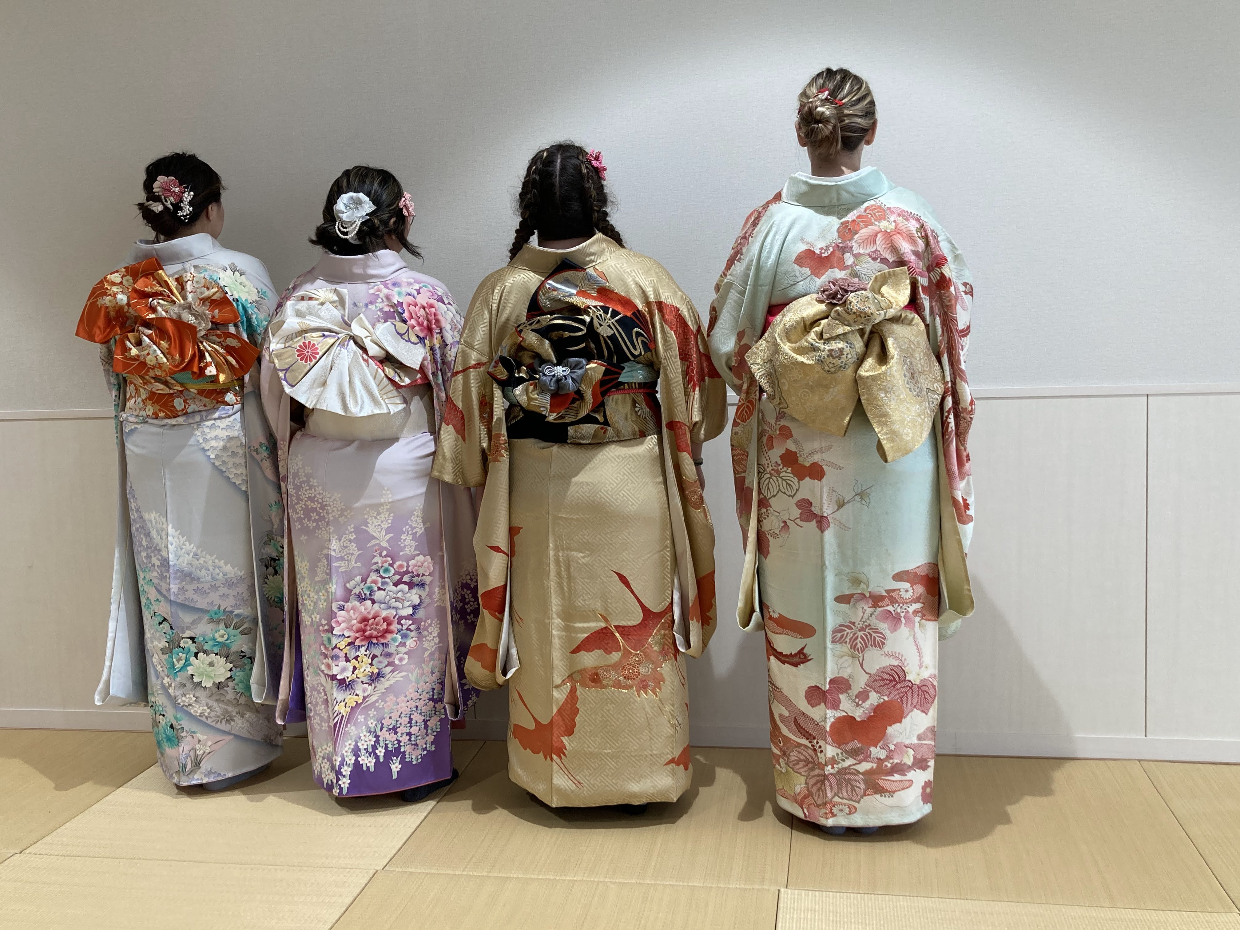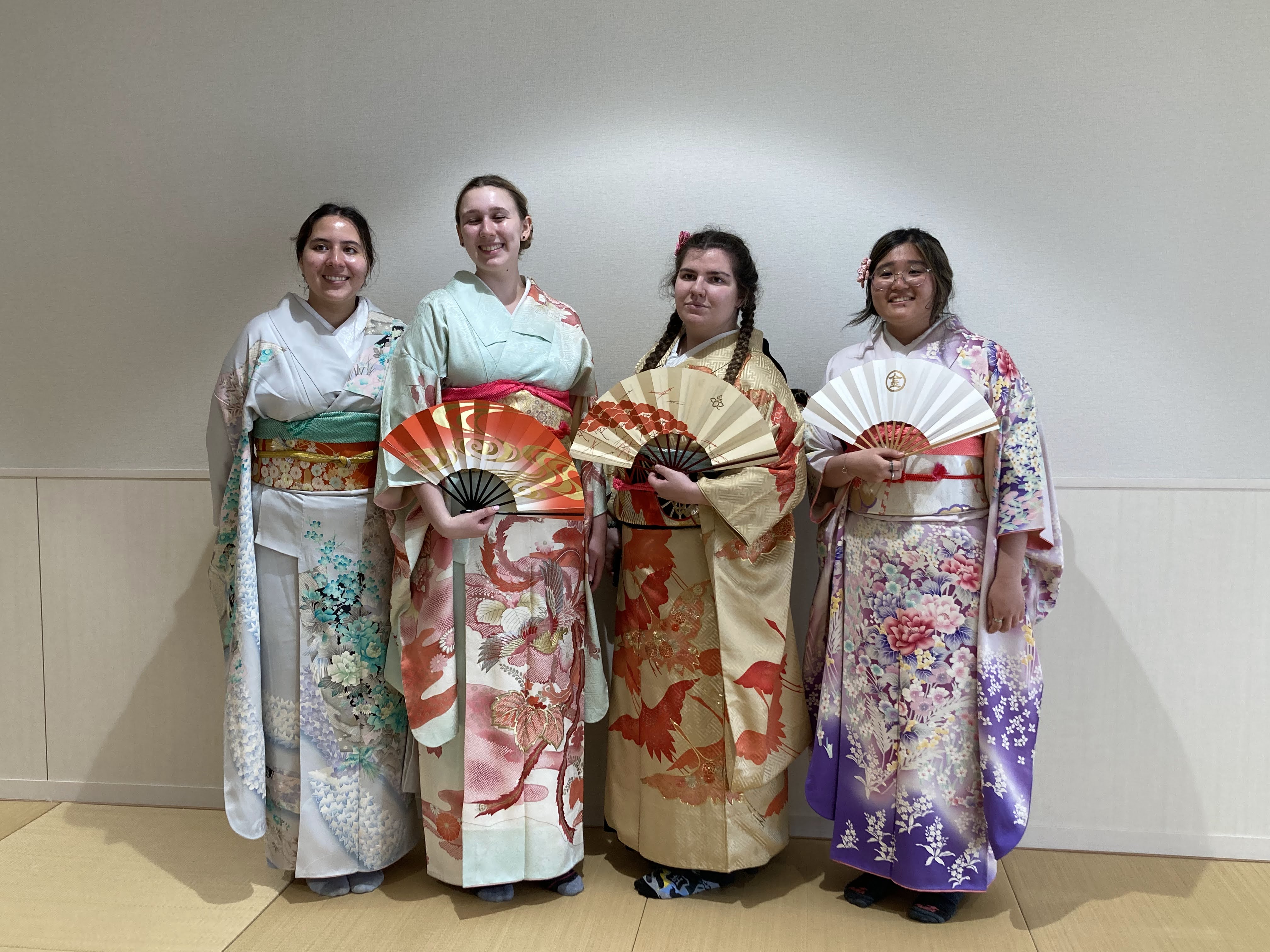 留学中、日本語レベルも格段に進歩しており、日本語しか話せない着付け師の方とも、日本語を介してコミュニケーションを行う姿が素敵でした。引率教員のホゼ先生も留学生も、皆さん本当に着物がお似合いでした!