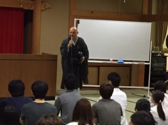 最初の座禅の後、大広間へ戻ってきて和尚様の講話です。新入生たちは無駄なお喋りもせず、講話に聴き入っていました。
