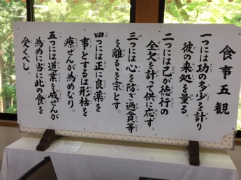 次は食事の時間です。食事も修行の一つだそうです。食事五観を唱え、この食べ物がどのようにできたかを考え、この食事が調うまでの多くの人々の協力に感謝をしながらいただきます。