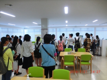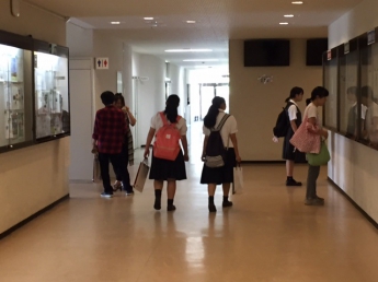 模擬授業が終わって校舎見学。グループに分かれて特別教室を周り、授業で使っている教材などを確認しました。皆さん興味深げに各教室や掲示板に見入っていました。