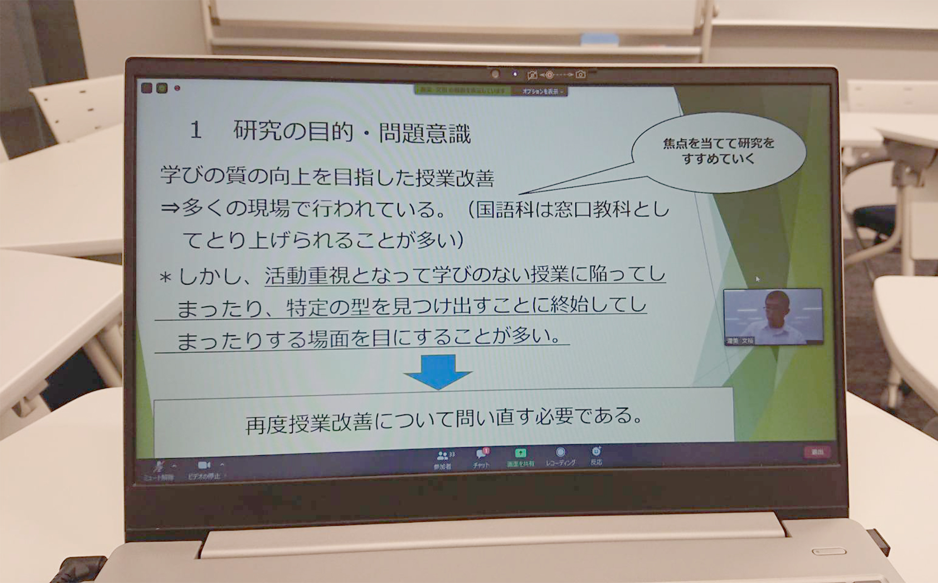 - 7月4日(水)に課題研究についての中間発表が行われました。 現職教員院生10人が、現時点までの研究の進捗状況を発表しました。