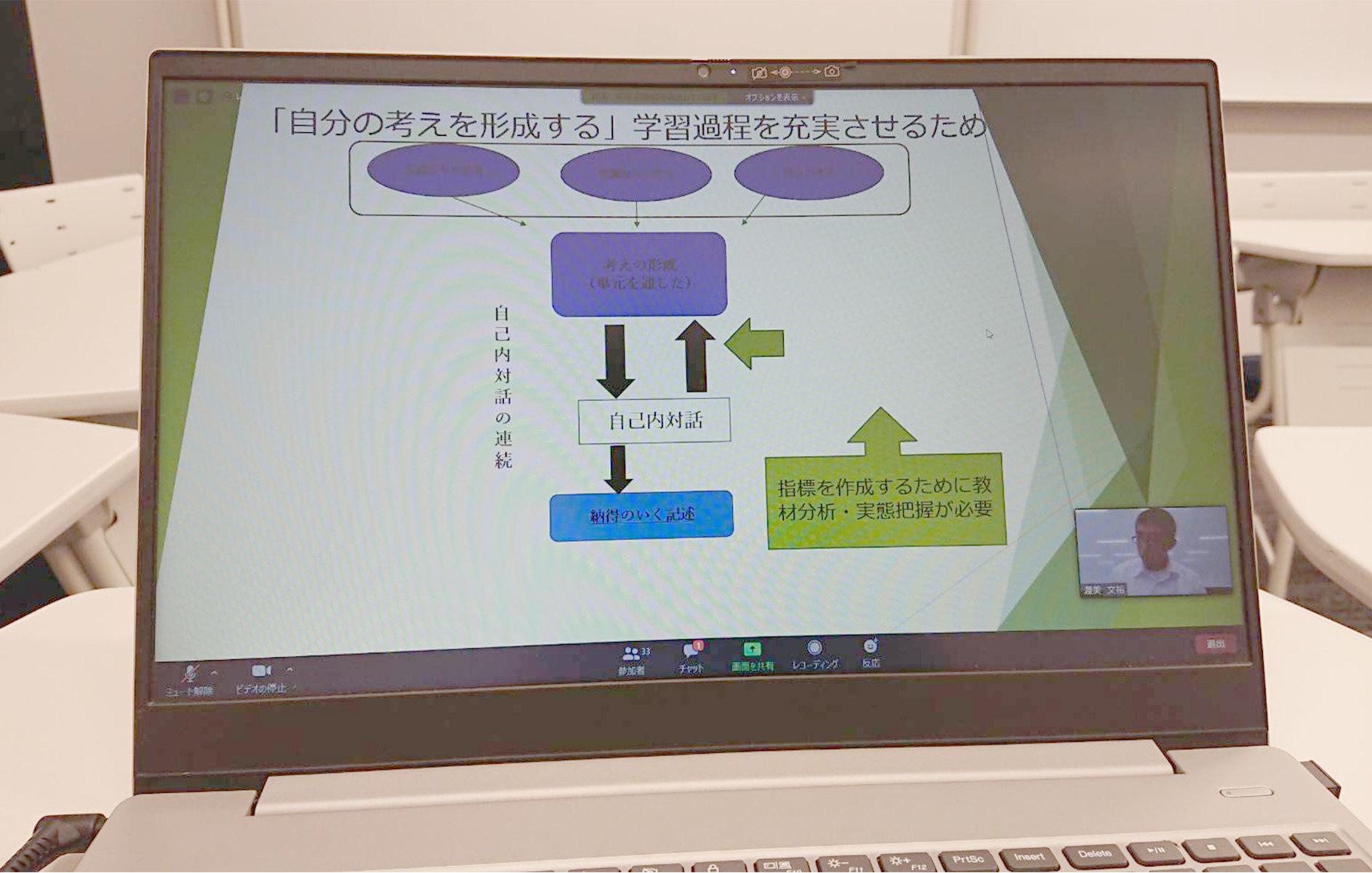 7月1日に現職院生による課題研究中間発表会が行われました。当日、静岡県では6月1か月間の平均雨量に匹敵する、梅雨明け間近の大雨に見舞われました。このため、大学内での対面による発表を避け、急遽、Zoomを利用してオンラインで発表会を行うこととなりました。教室での発表を想定して準備を続けてきましたが、これまでのオンライン授業の経験が生き、大きな混乱がなく、無事開催することができました。