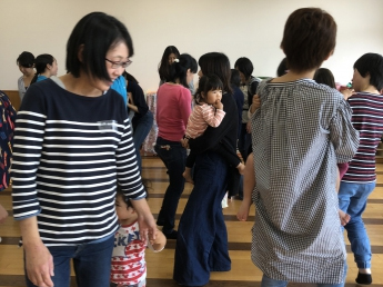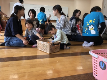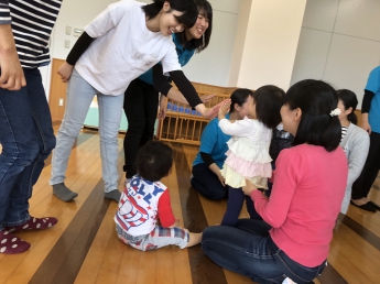 1~2歳児17名(0歳児2名)と保護者18名、本学こども健康学科で学ぶ学生19名が集い、自己紹介ゲームやわらべうた遊びで楽しく過ごしました。