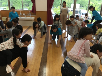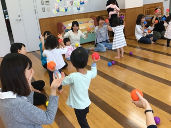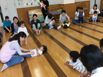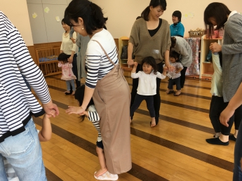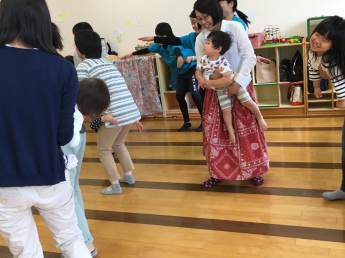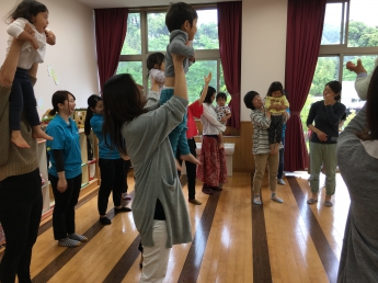 講師はピアニストの加藤先生。終始うたや音楽に溢れ、体を動かすのが心地いい時間でした。お母様たちは、我が子を抱っこでしゃがんだり立ったり背中に乗せたり…と楽しそうでした。音楽は体を軽くする力もあるのかしら・・・。