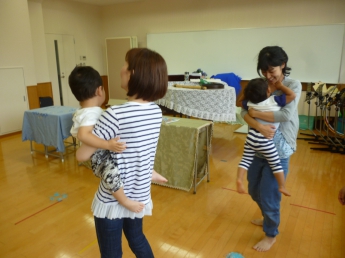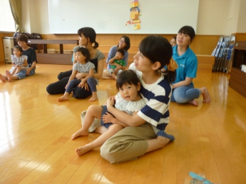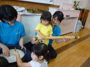 とっても楽しい歌、音、声にあふれたポッケ。子どもたちもお母様たちも自ら歌い、生き生きと声を出していました。改めて発見したこと…それは、楽器の音色も人の声も振動だということ、そして、小さな子どもたちはそれらを全身で『聴く』力があるということです。グロッケンや太鼓と豆で雨粒の音、レインスティックで波の音、カエルギロや洗濯板のギロでカエルの声などなど、様々な楽器の音に、子どもたちはとても新鮮な驚きの反応を示していました。