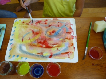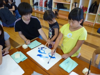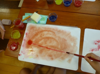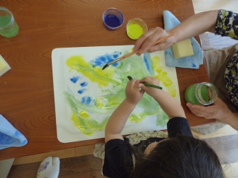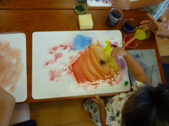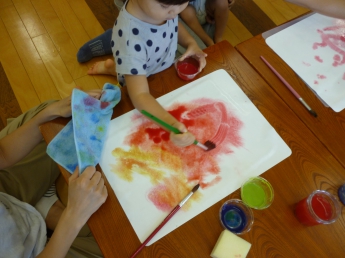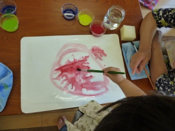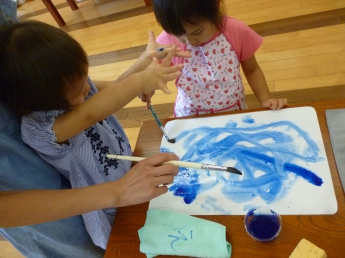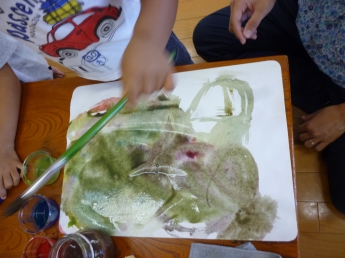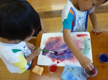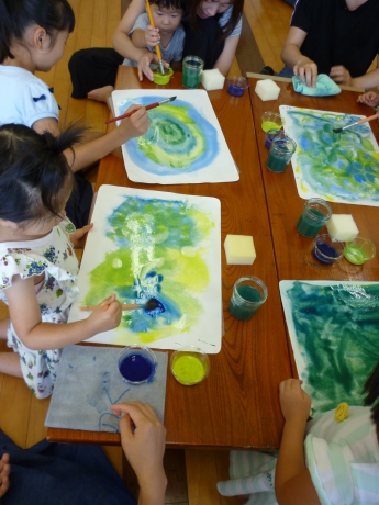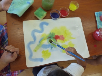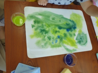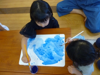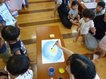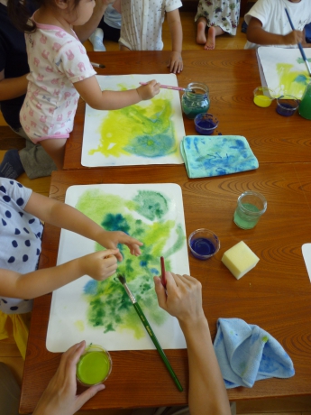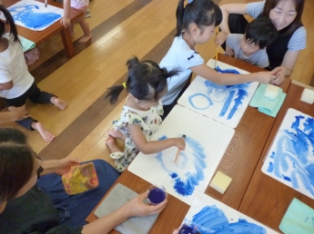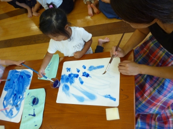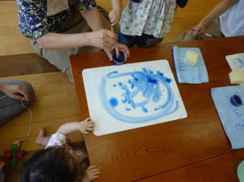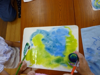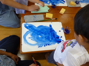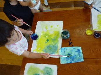 夏休みを経て久々の再開。子どもたちの成長ぶりとご家族(まだ夏休み中の兄弟姉妹数人が付き添いました。)の元気な姿に出会い、お互いに喜び会うところからのスタートとなりました。今回は堀田先生の担当でポッケでは初の「絵の具あそび」です。「青」のみの世界を楽しんだ後は、「黄」「赤」の色を思い思いに乗せて遊びました。色がにじみ混ざることでまた違ったイメージを広げているのが伝わってきました。「色」の濃淡や広がり、「色」が混じり合い刻々と様子が移ろう変化…「にじみ絵」の楽しさや奥深さを改めて感じました。