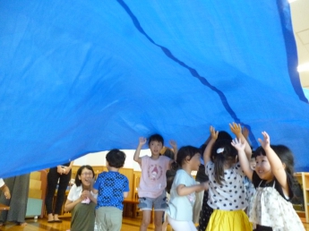 その下に入ってハシャぎ出す子どもたち。海の中みたい。