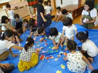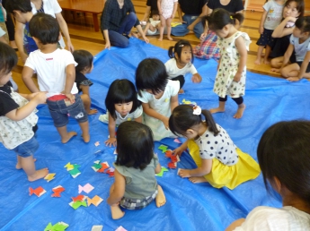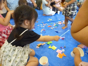 色紙で作った釣竿を使った「魚釣り」に夢中。