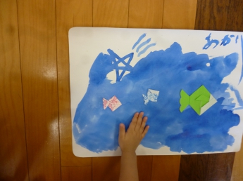 自分で選んだ魚を「青」い水に泳がせ(貼り)ました。