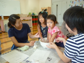 加えて混ぜます。お母様たちが工程を確かめる会話を