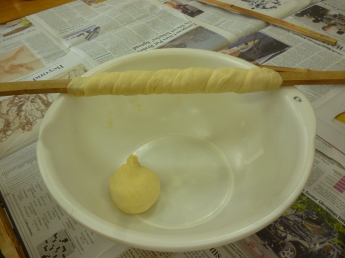「耳たぶくらいの柔らかさになったら、生地を上から叩きつける。