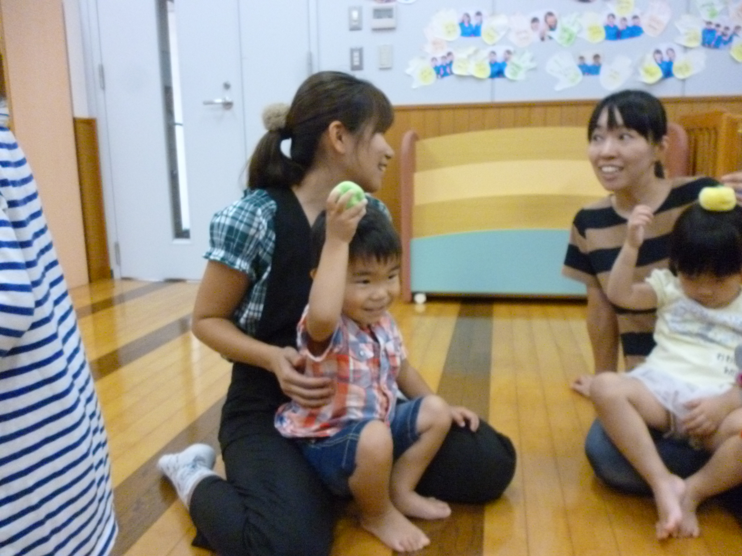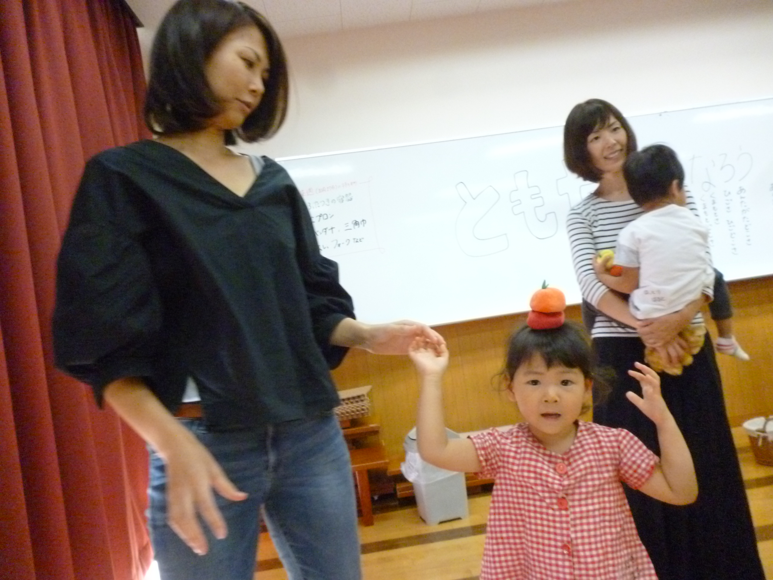 秋のくだものを連想する「おてだま」を頭に乗せ、♪こんにちは~♪・・・・この遊び、子どもたちは実に喜びます!