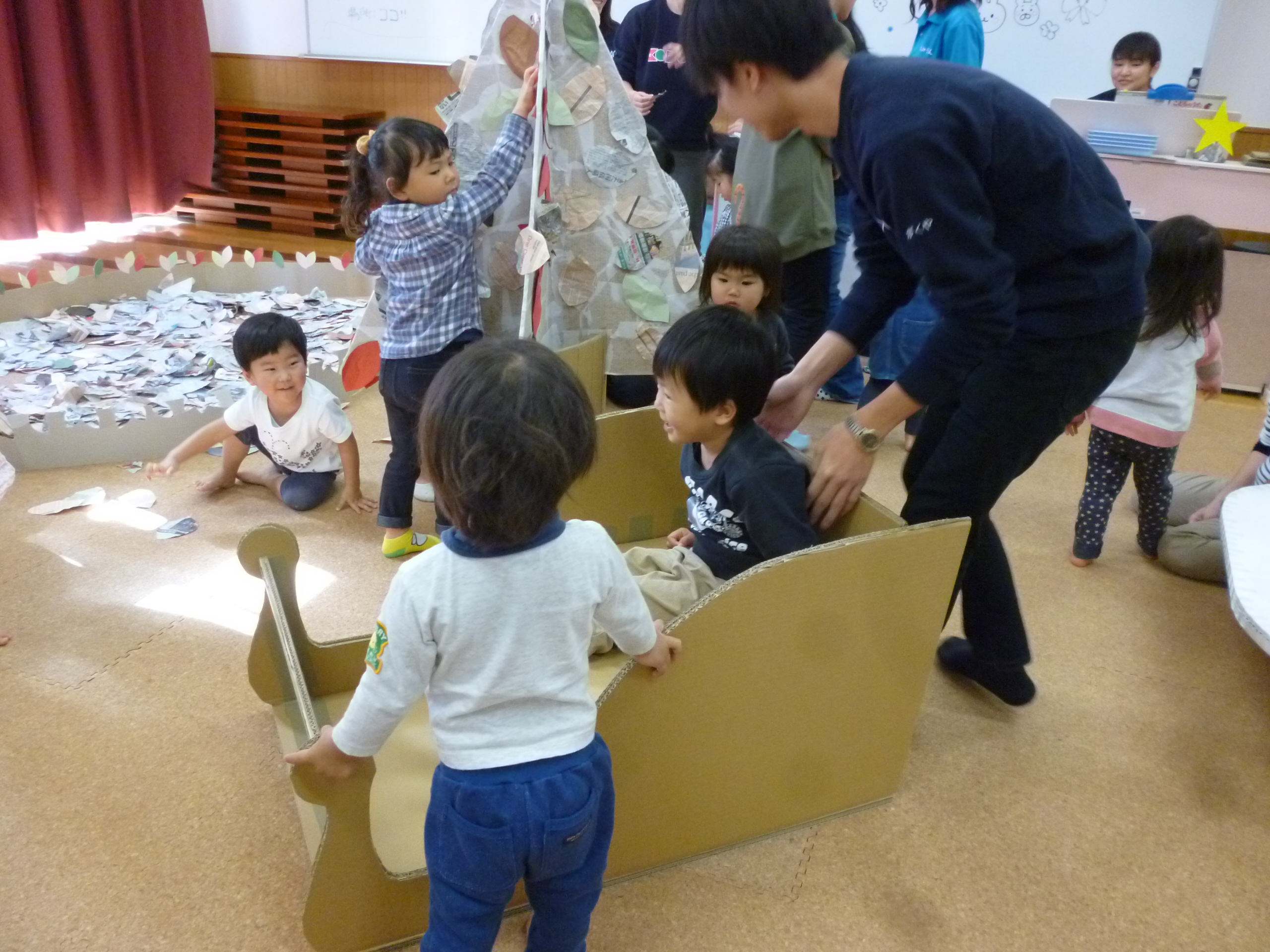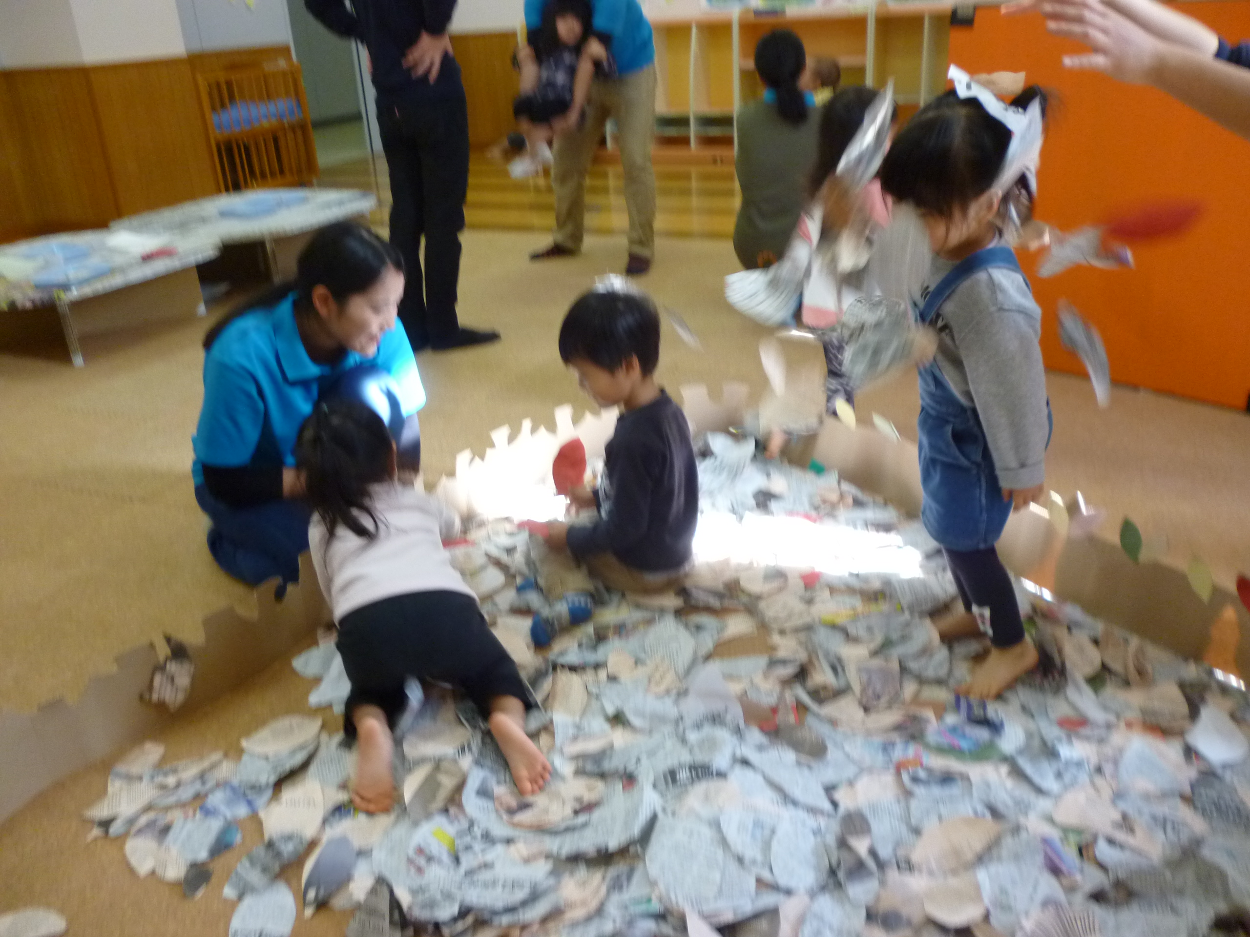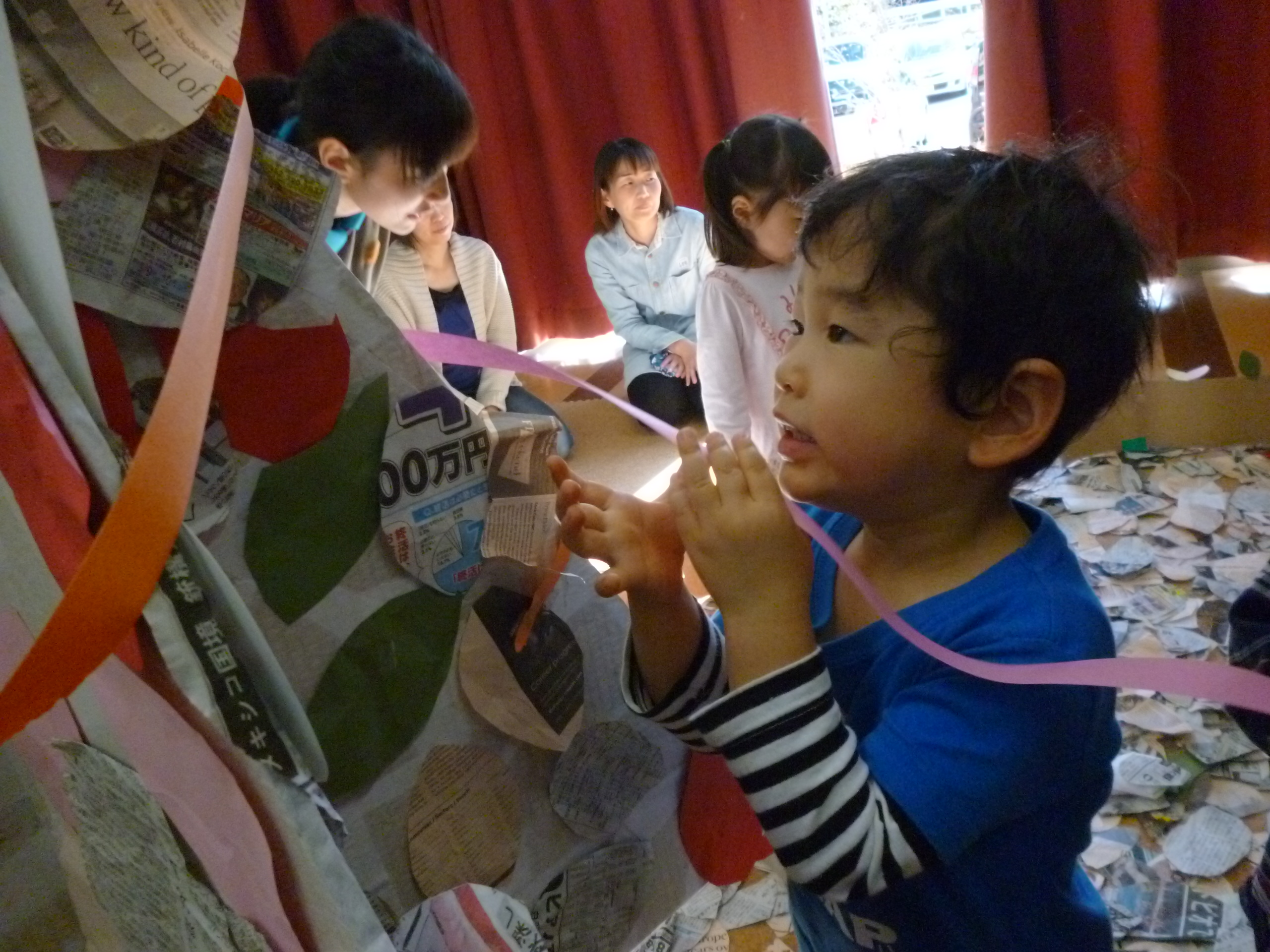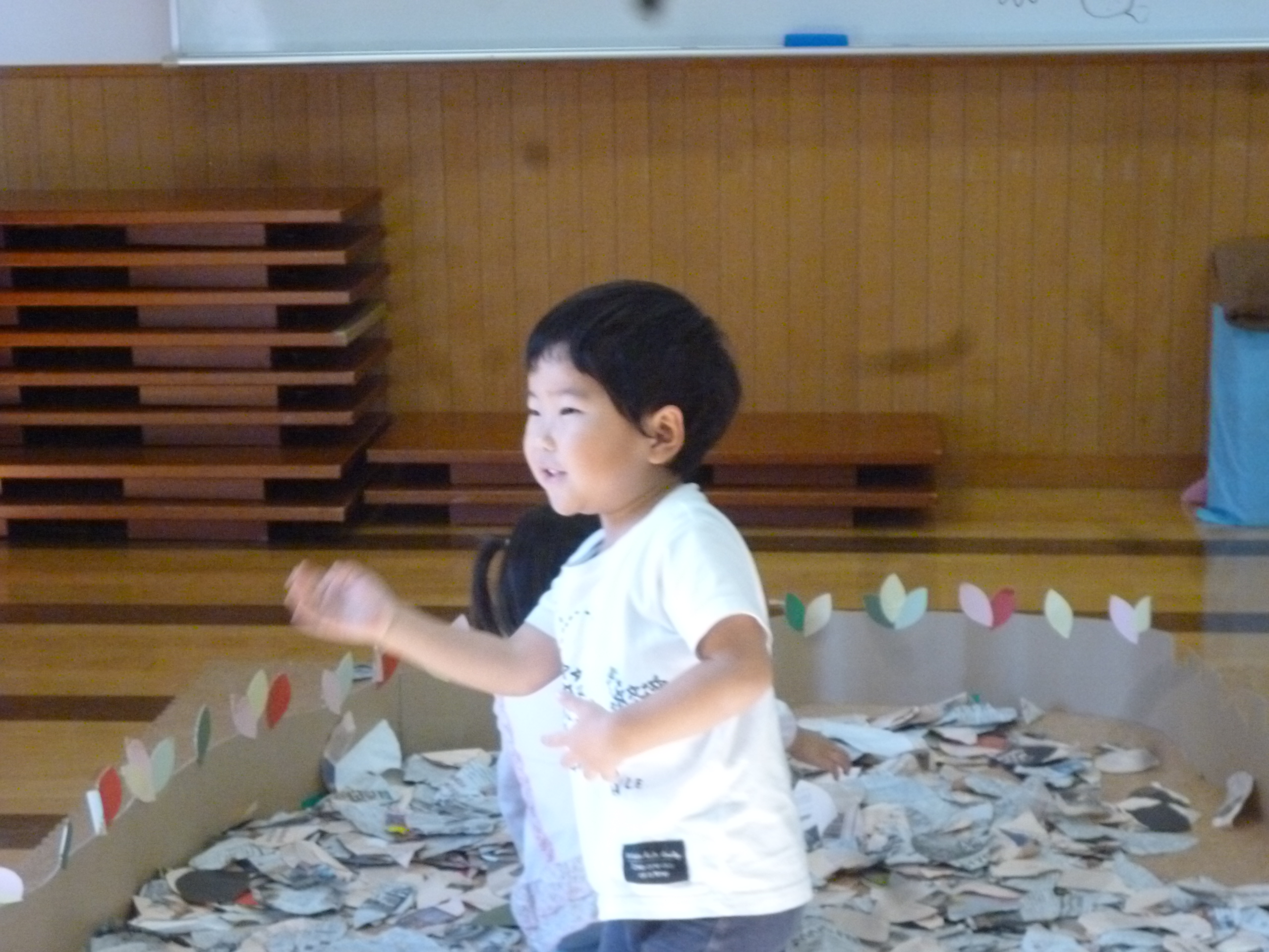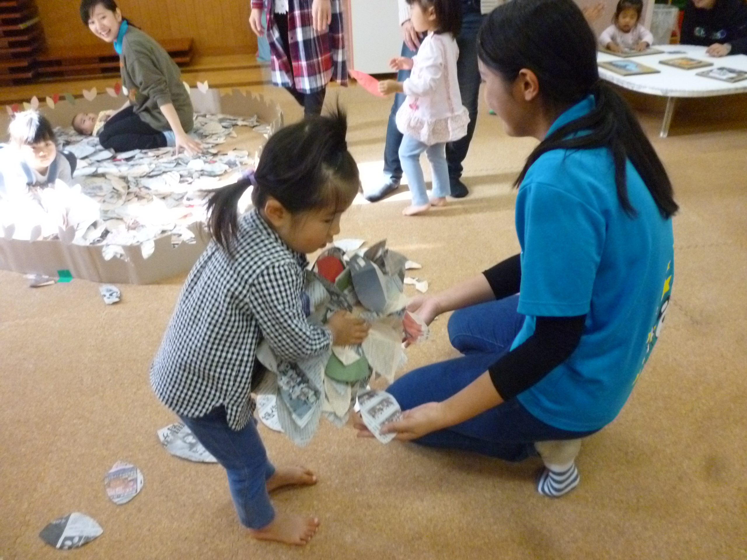 新聞紙の壁が外されると各々感じるままにそれぞれのコーナーで遊び始めます。ここは「葉っぱのプール」