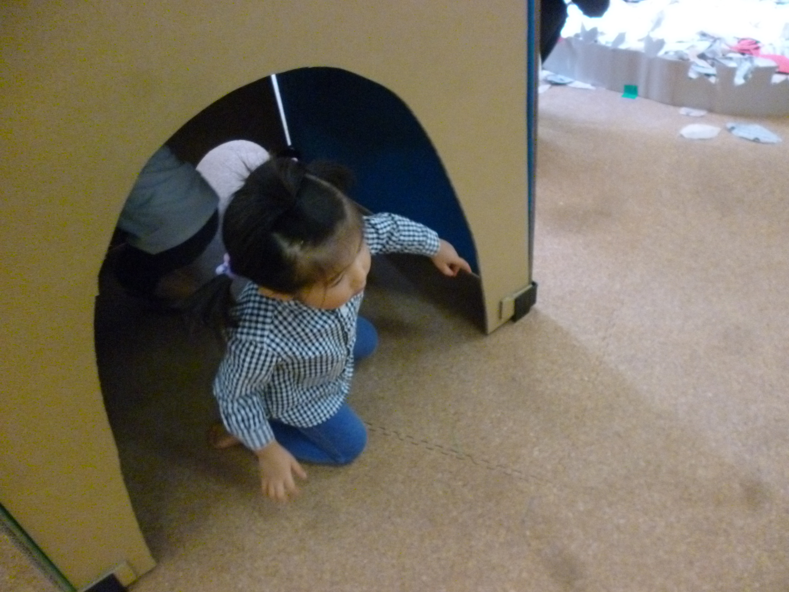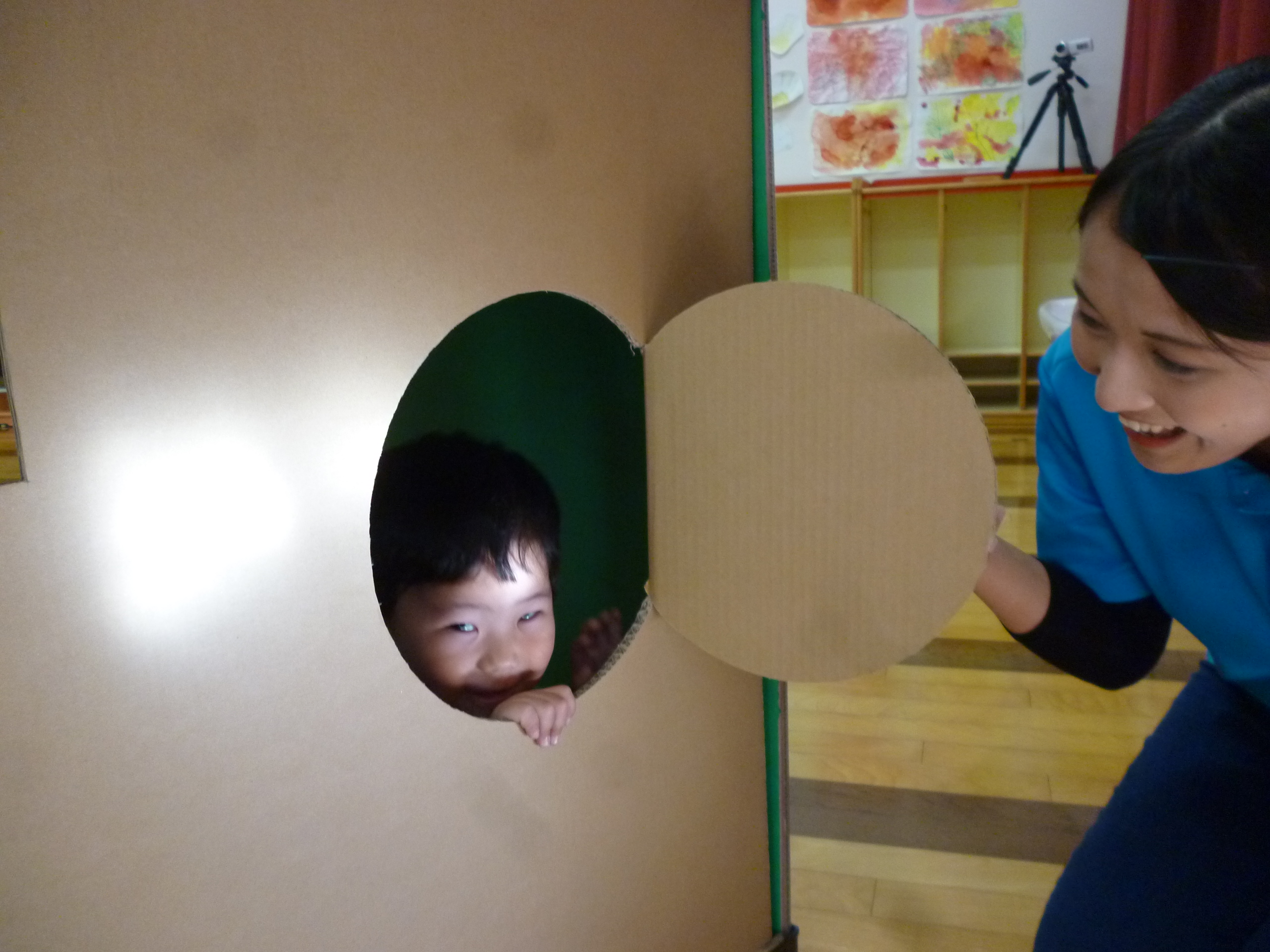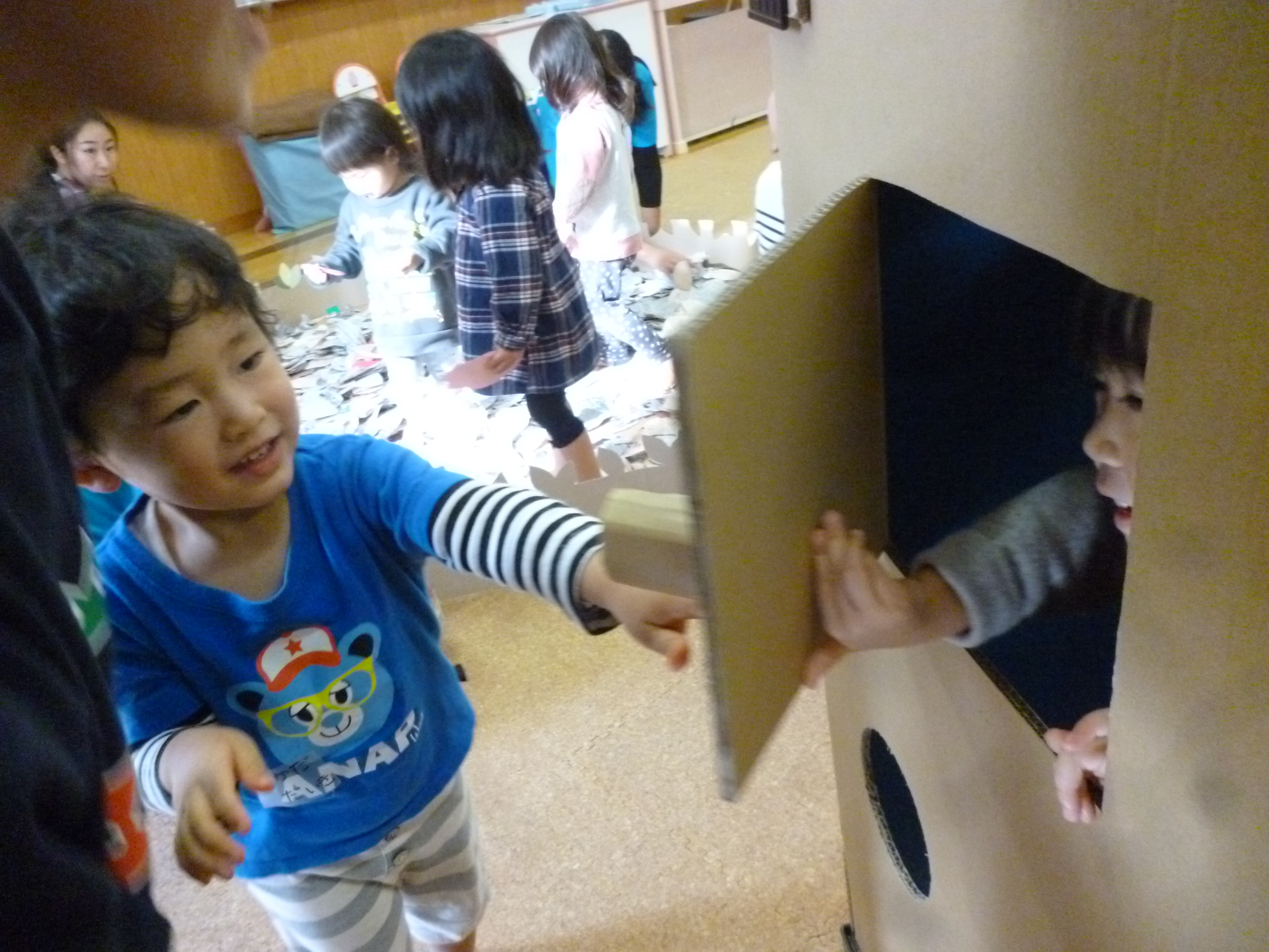 「わたしのおうち」。いろんな形や大きさの窓があるダンボールハウスです。