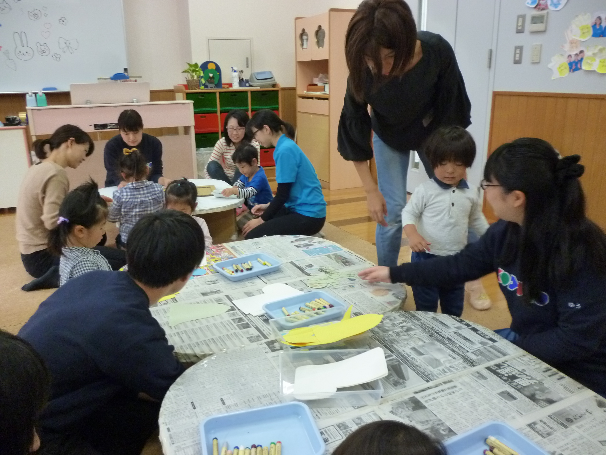 「ツリーのオーナメント作り」コーナー。お絵かきの好きな子は早速クレヨンを手に取り描き始めます。
