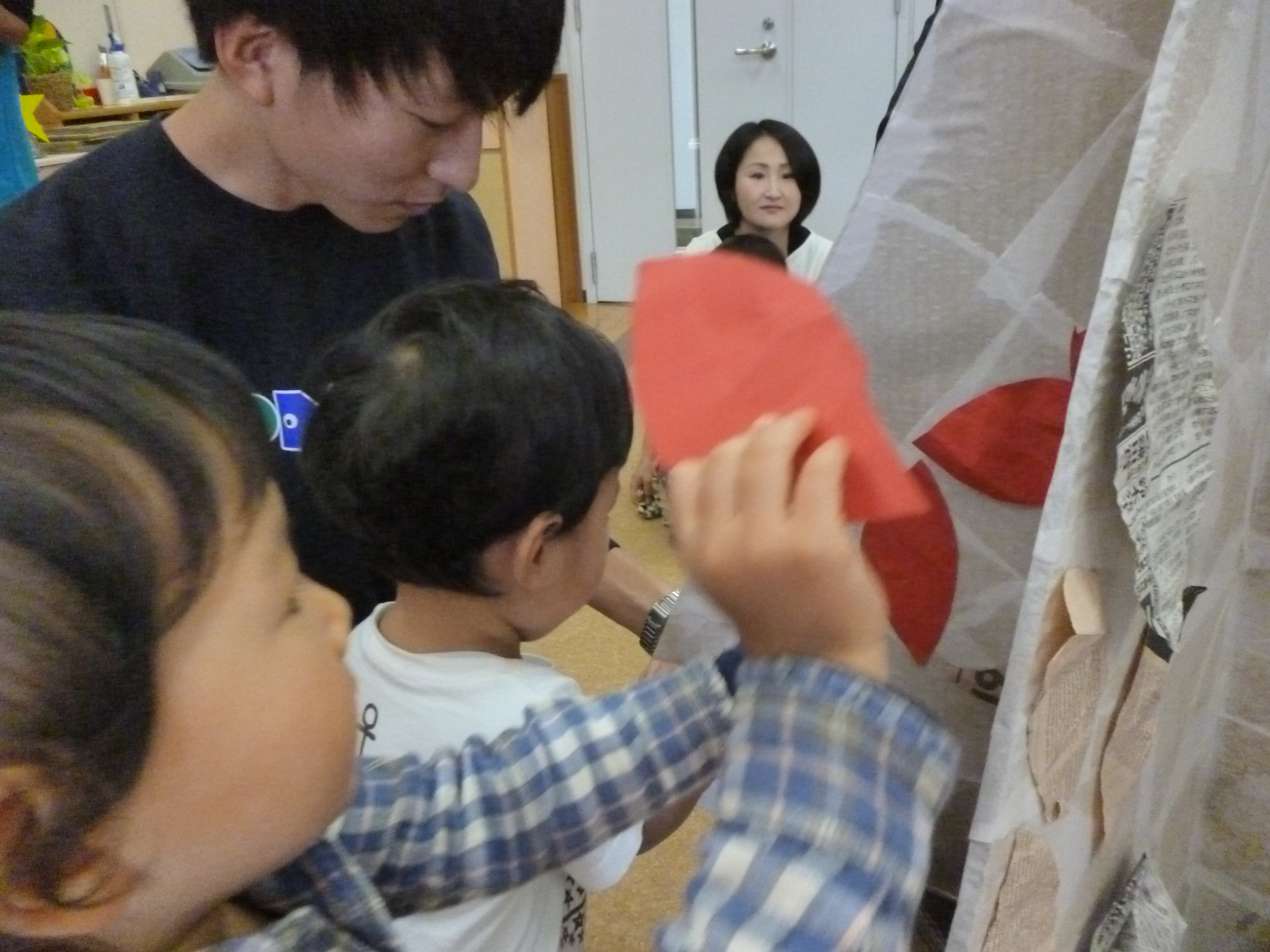 「これだれ?」と新聞紙の顔を見つけたり、写真の色を見つけたりして各々イメージが膨らみます。赤い色は「おいも」、茶色は「サトイモ!」「あ、雨降ってきたよ~」…♪