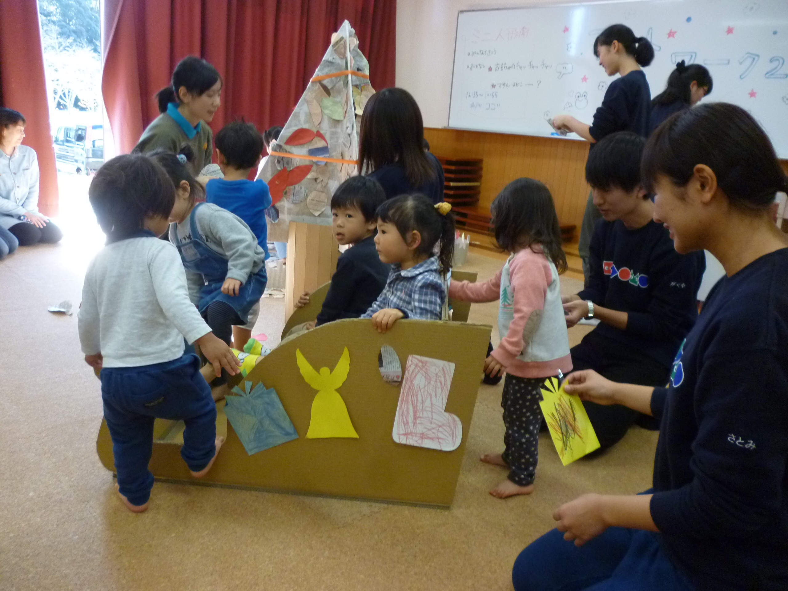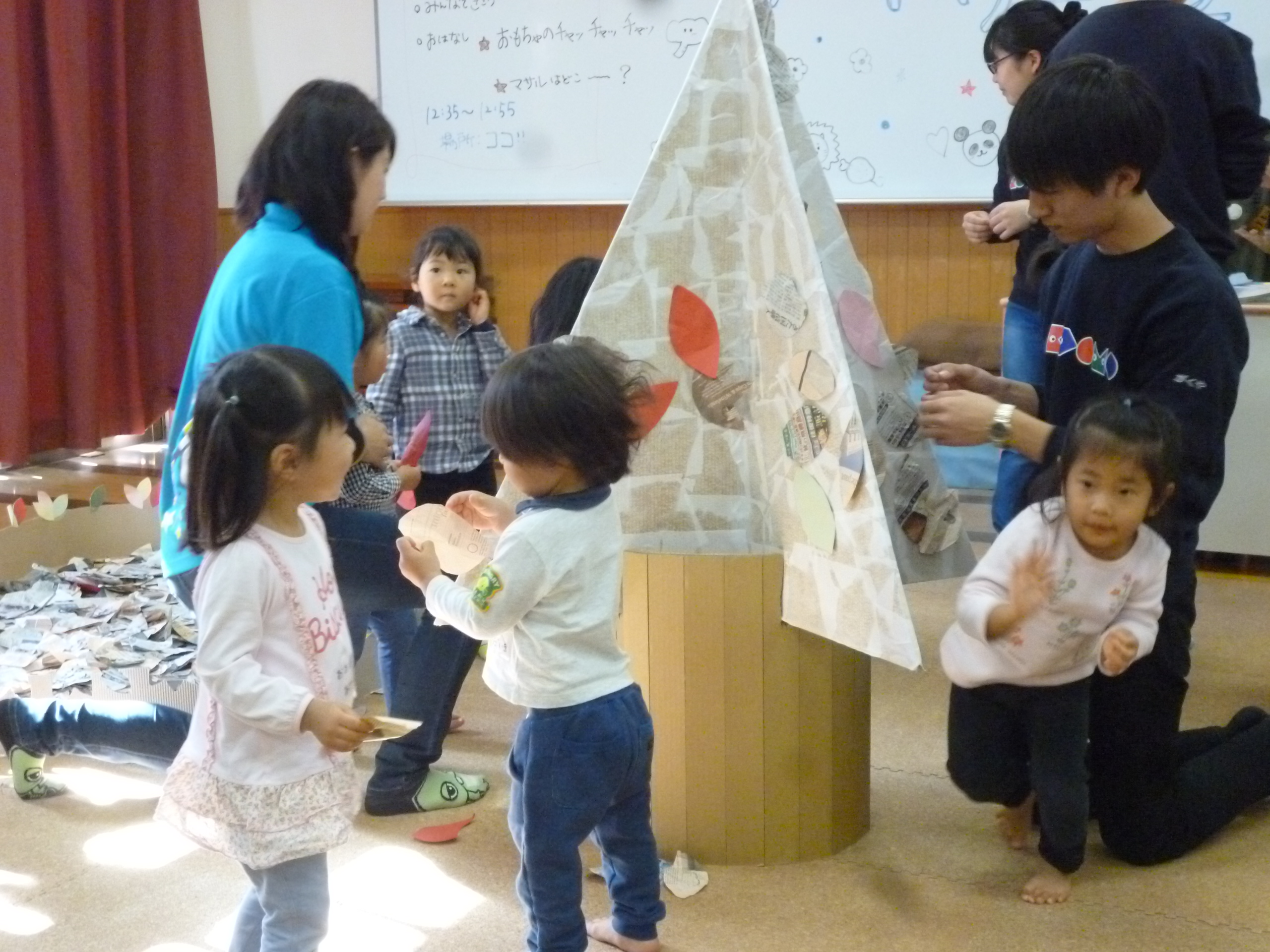お母さんたちと合流し休憩した後は、作ったオーナメントをツリーに飾ります。