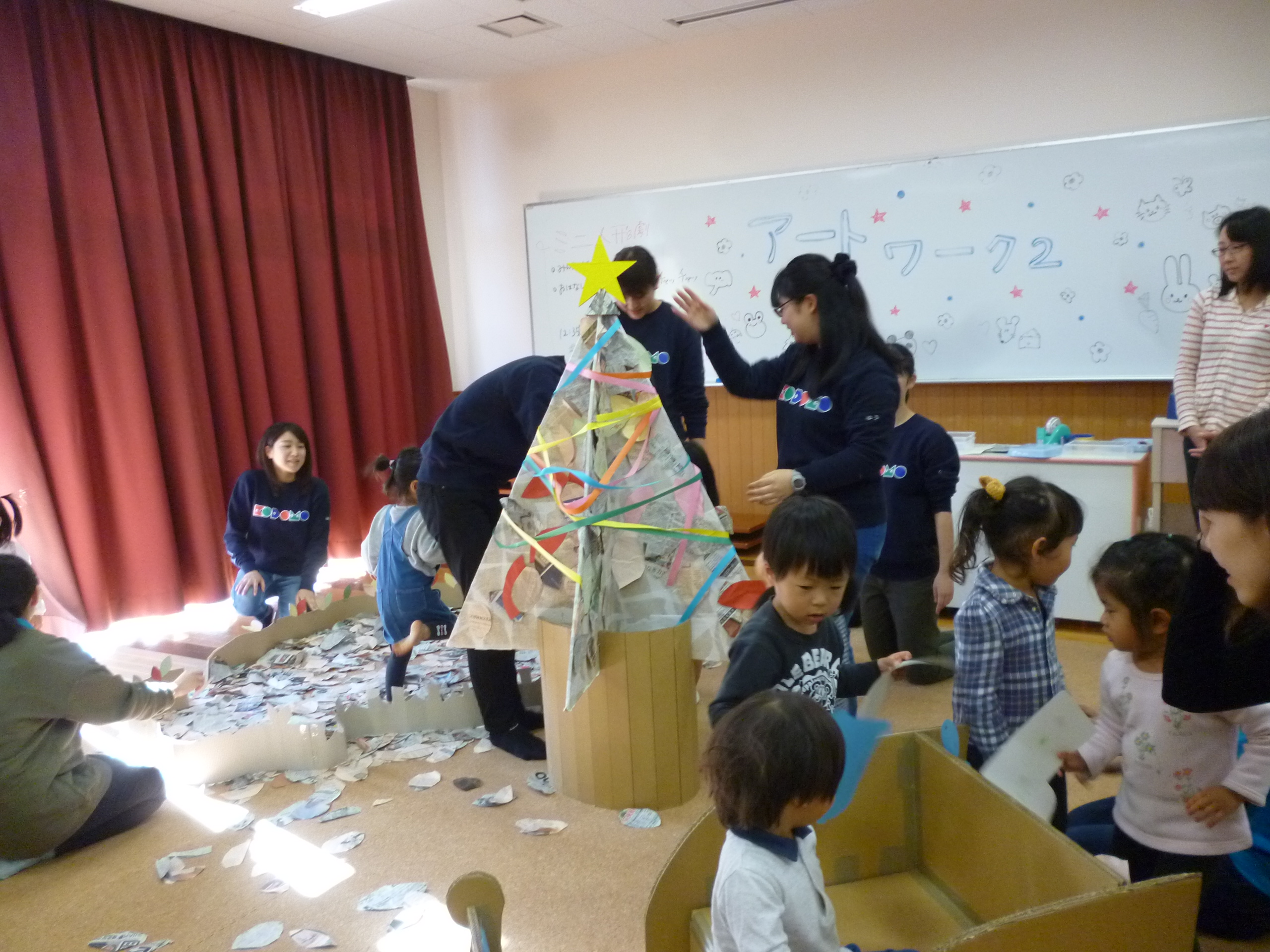 ツリーも紙テープで飾ります。