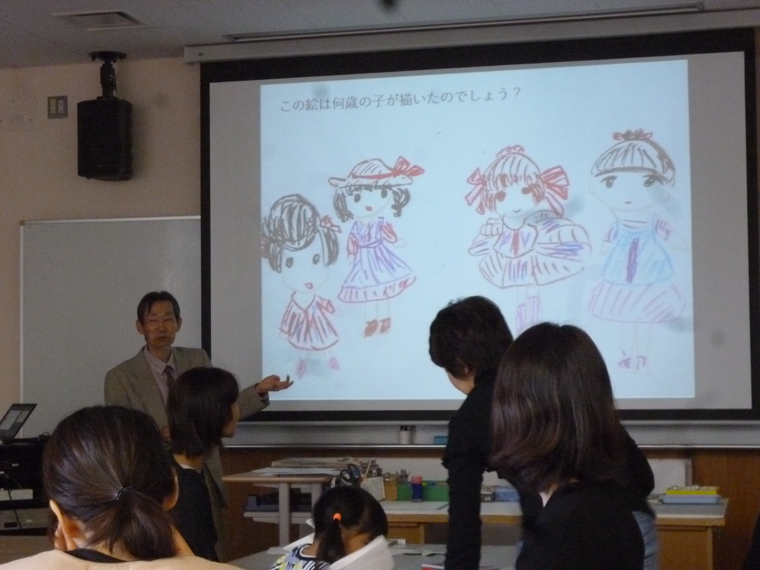 お母様たちの講座。時々甘えに来る子どもを自然に受け止めながらの参加です。子どもの絵って、成長とともにどう変わっていくのかしら?我が子のことを思い浮かべながら考えていきます。