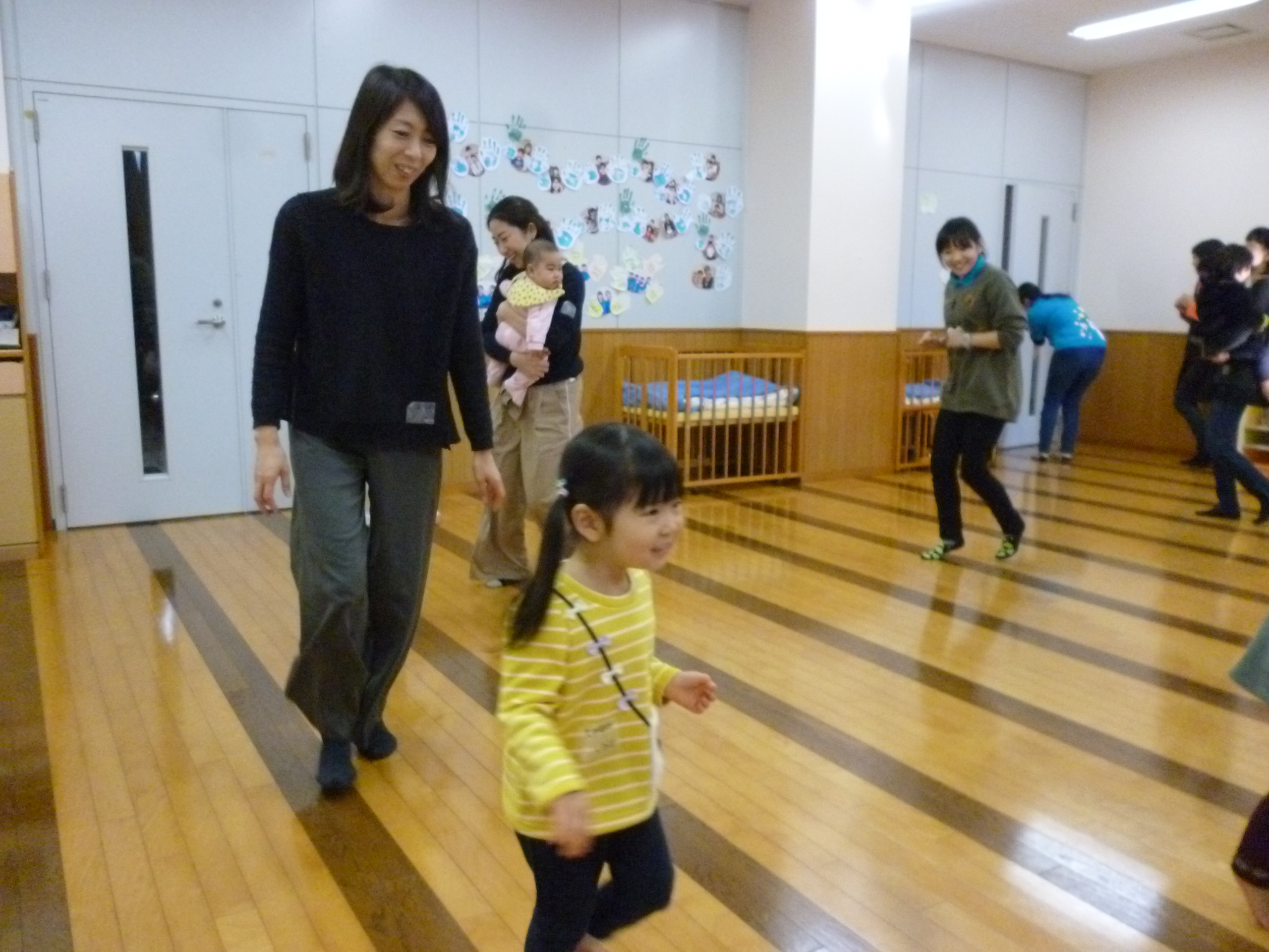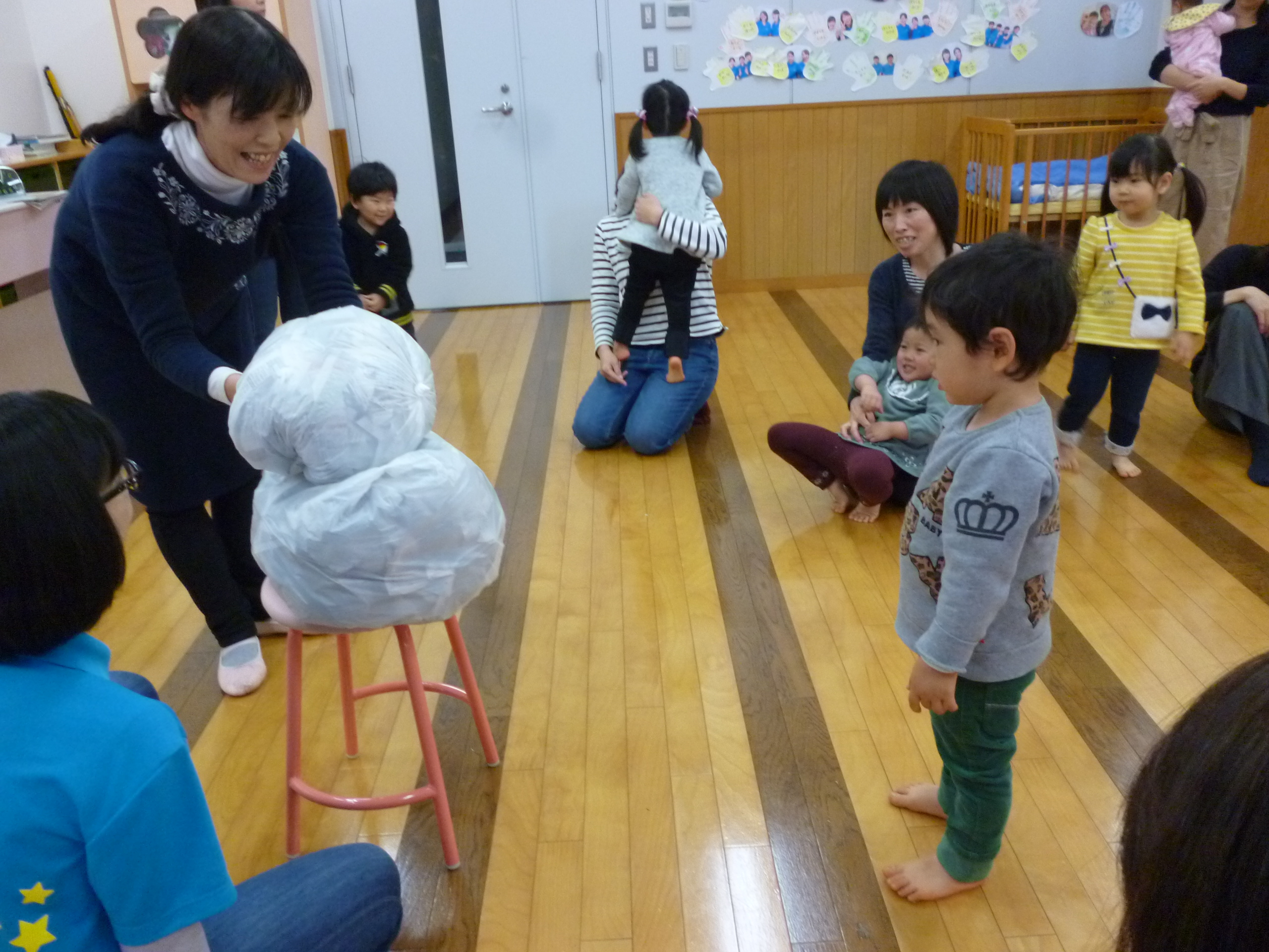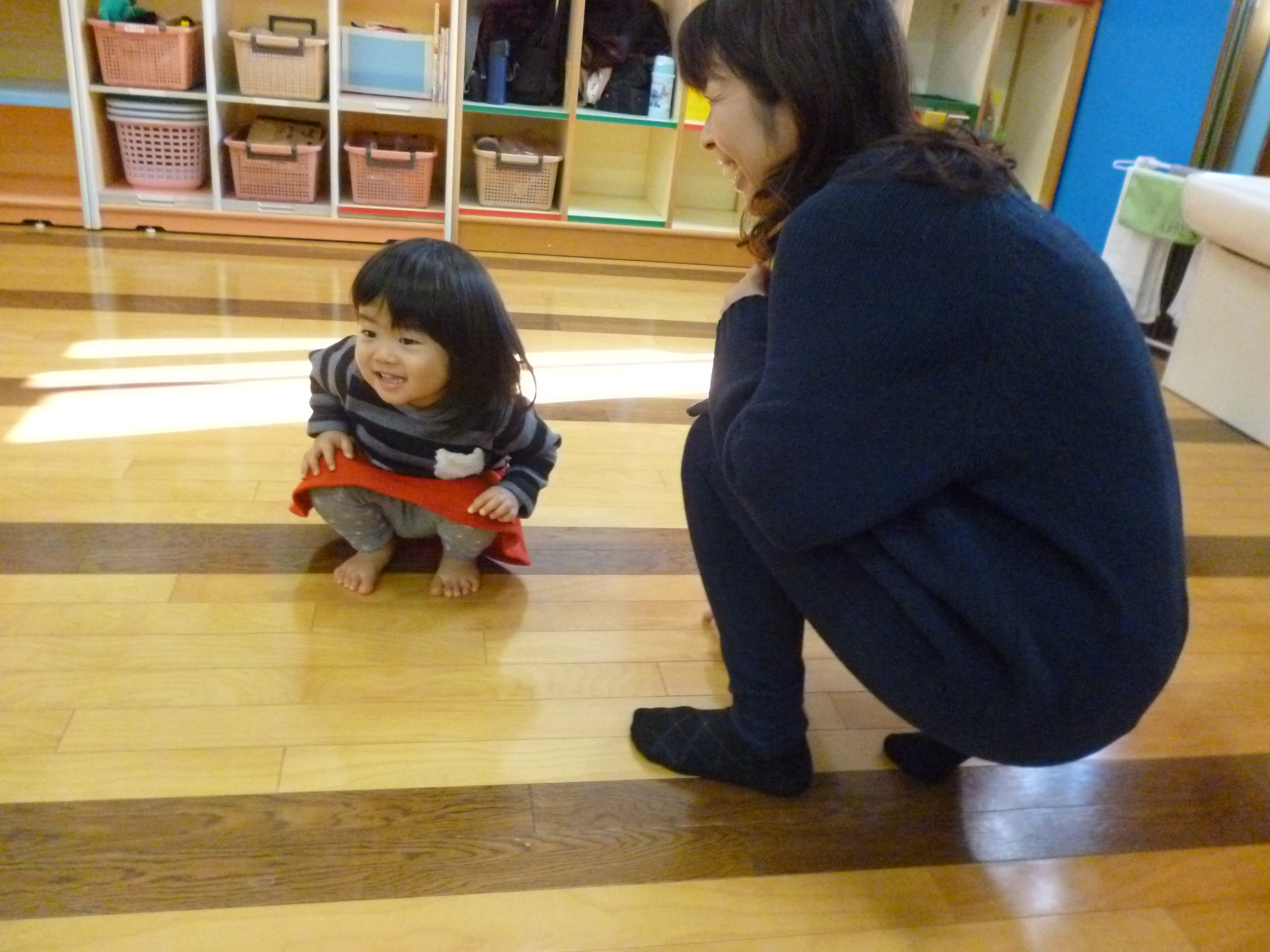 子どもたちが遊びを生み出していました!頭上に乗せた籠に、乳酸飲料の空容器を入れてはばら撒く遊びです。単純ですが実に楽しそうでした。容器が床に落ちる「音」も何だか心地よく感じました。