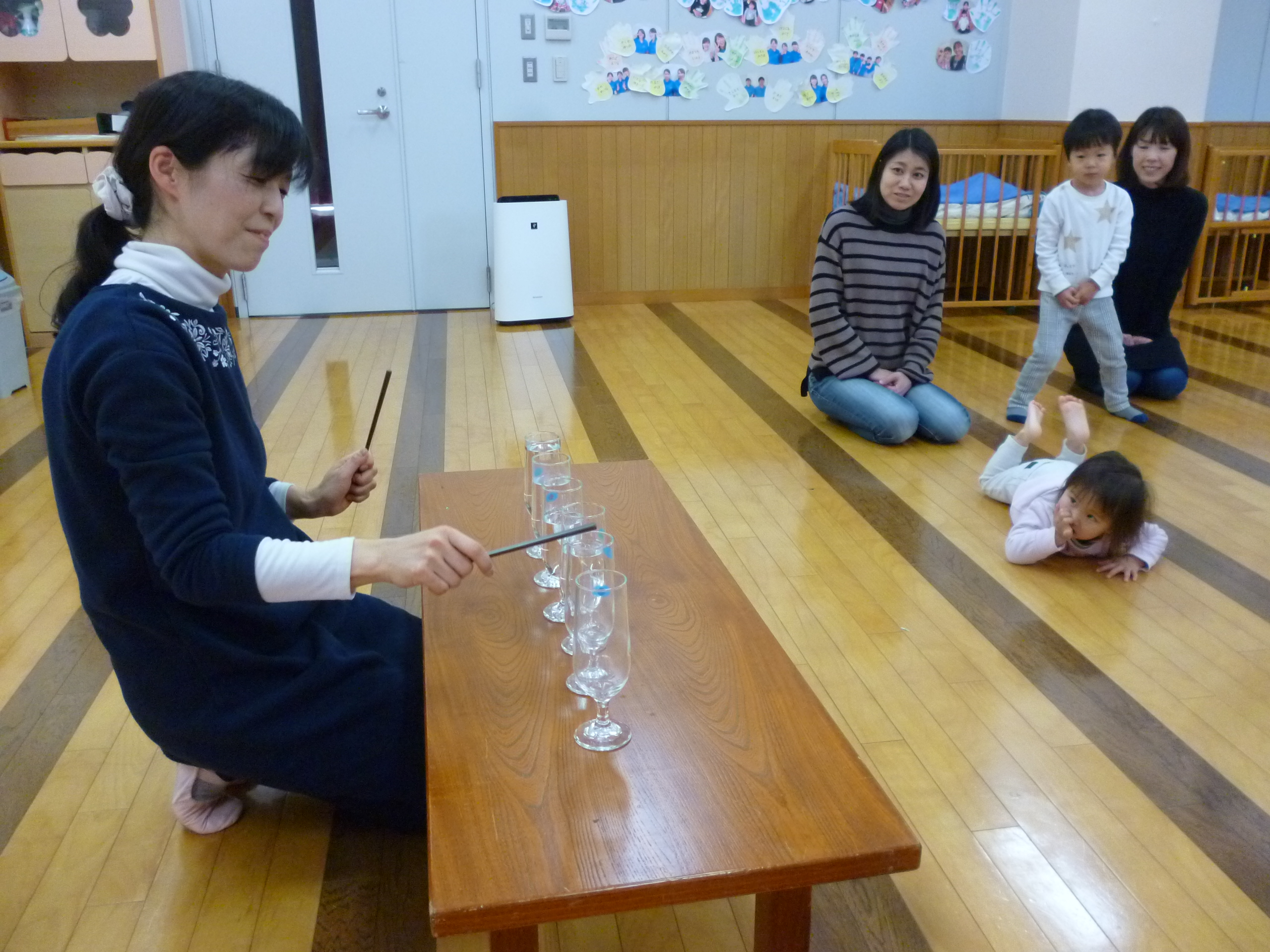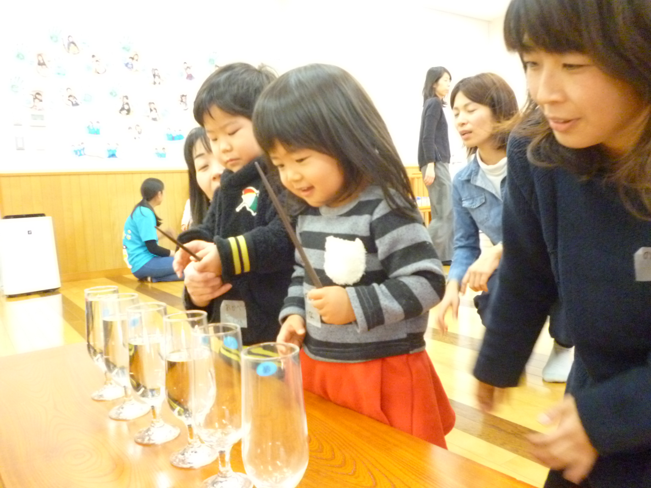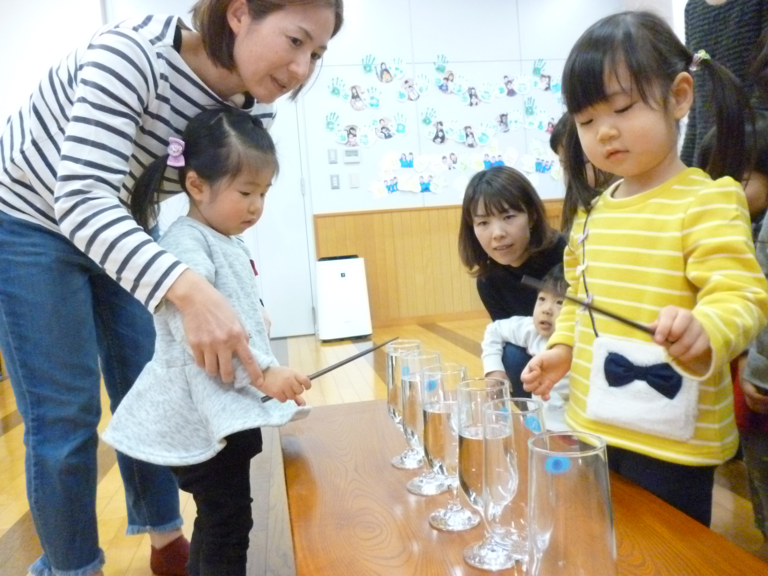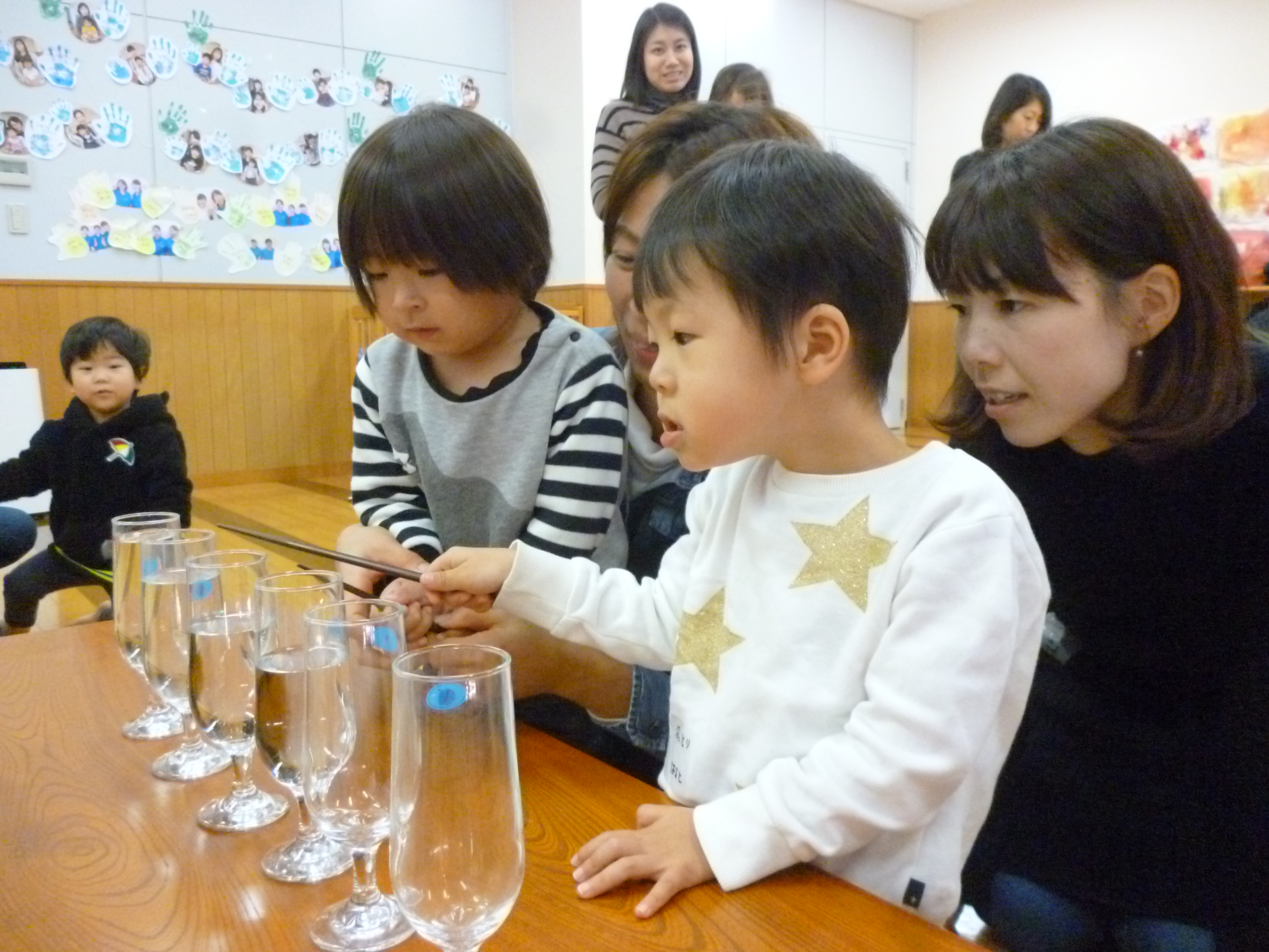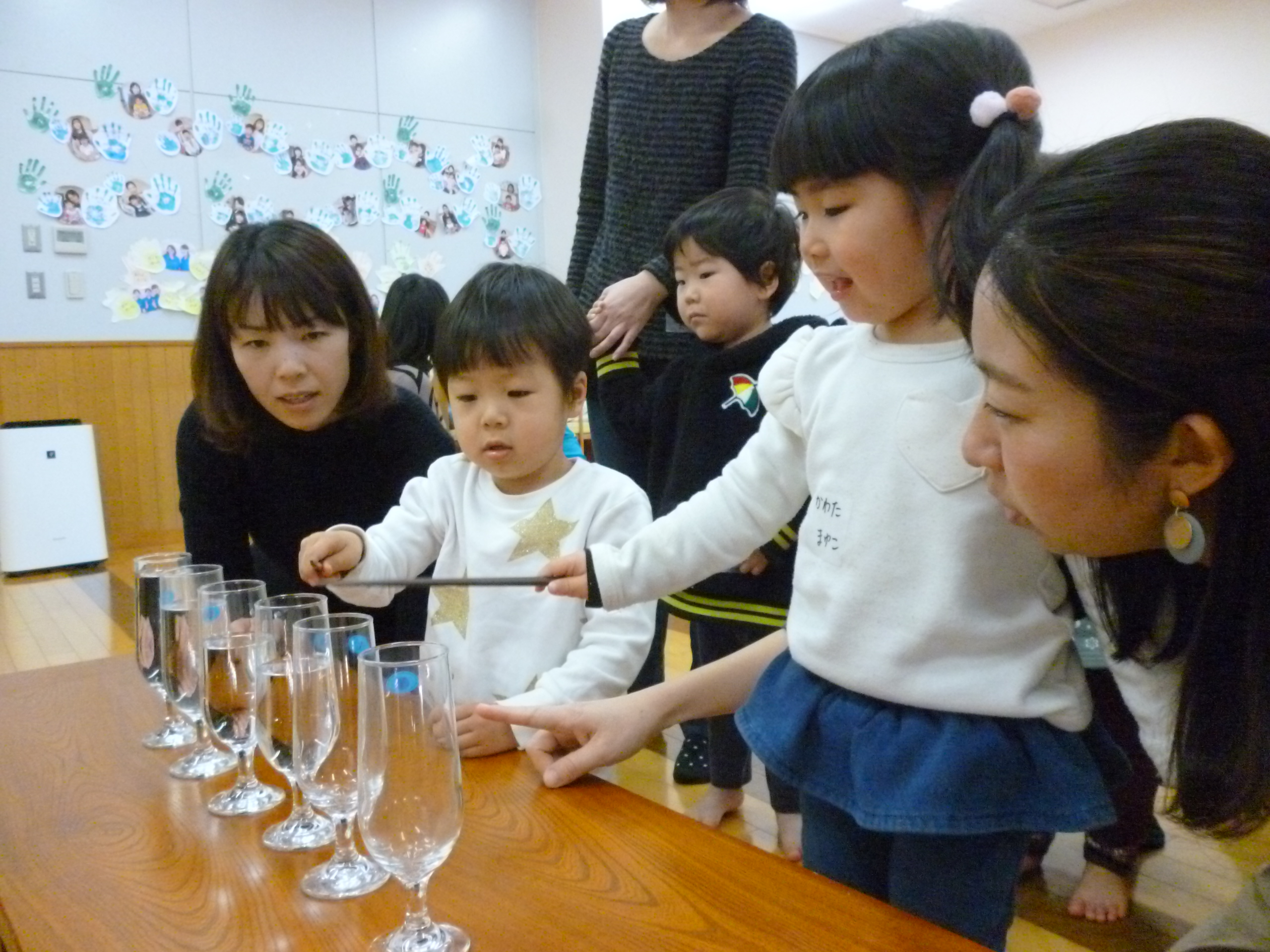 グラスに違う量の水を入れた楽器。♪キラキラ星~♪をじっくり聴いたあと・・・