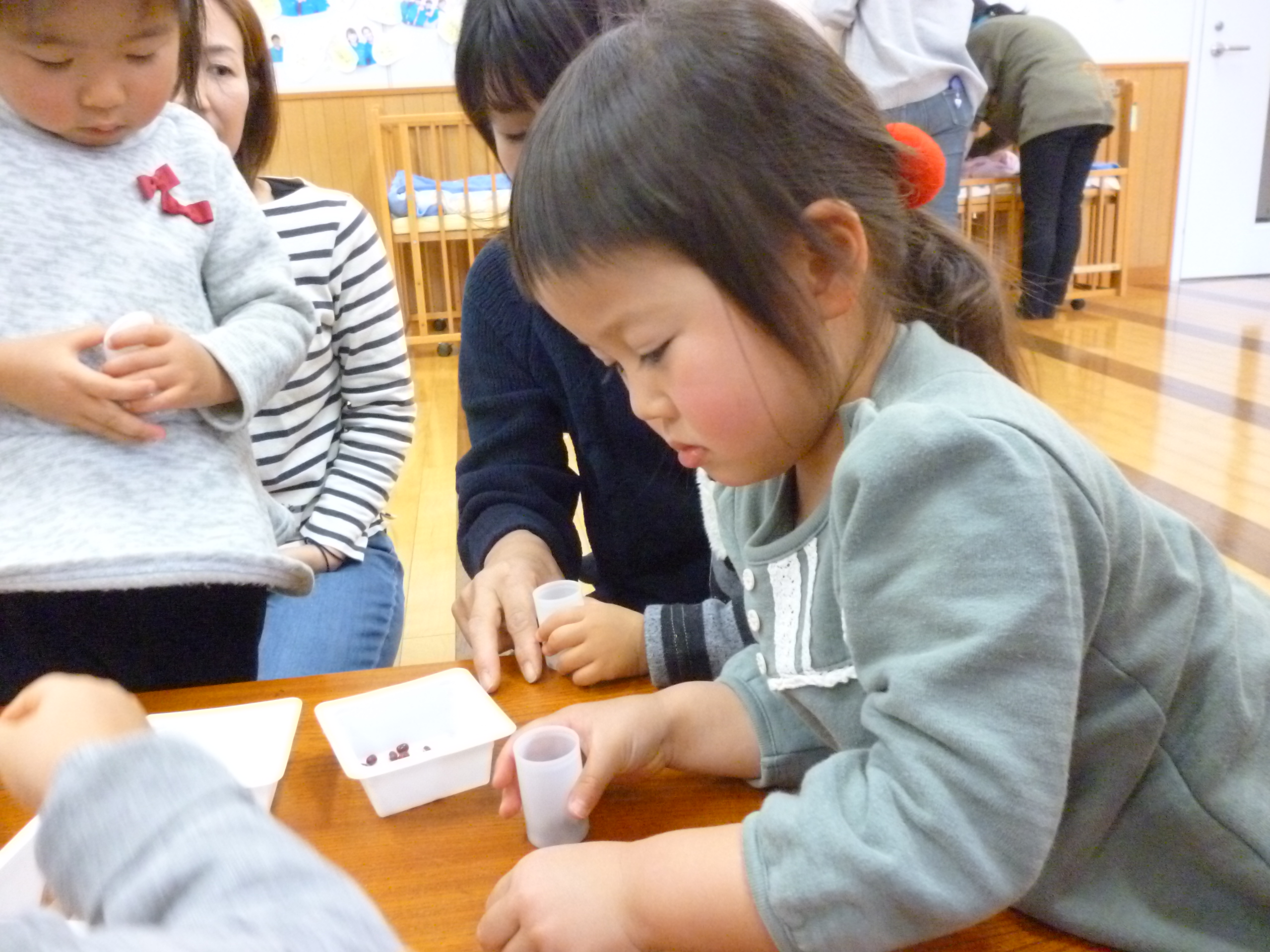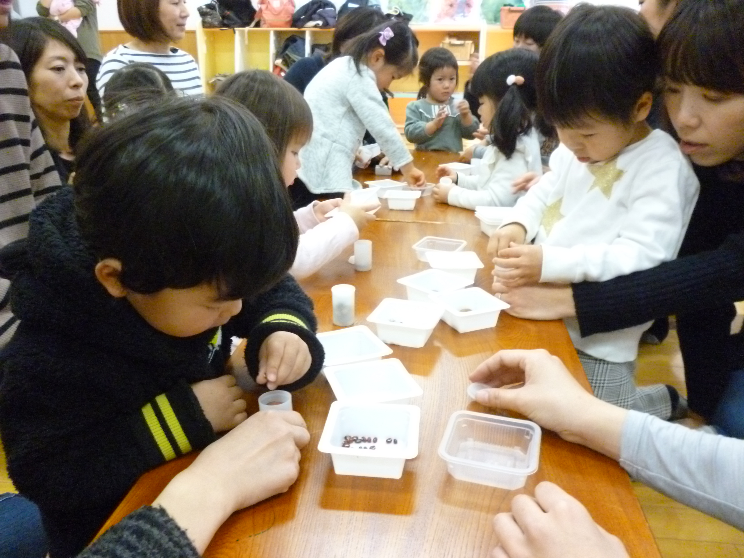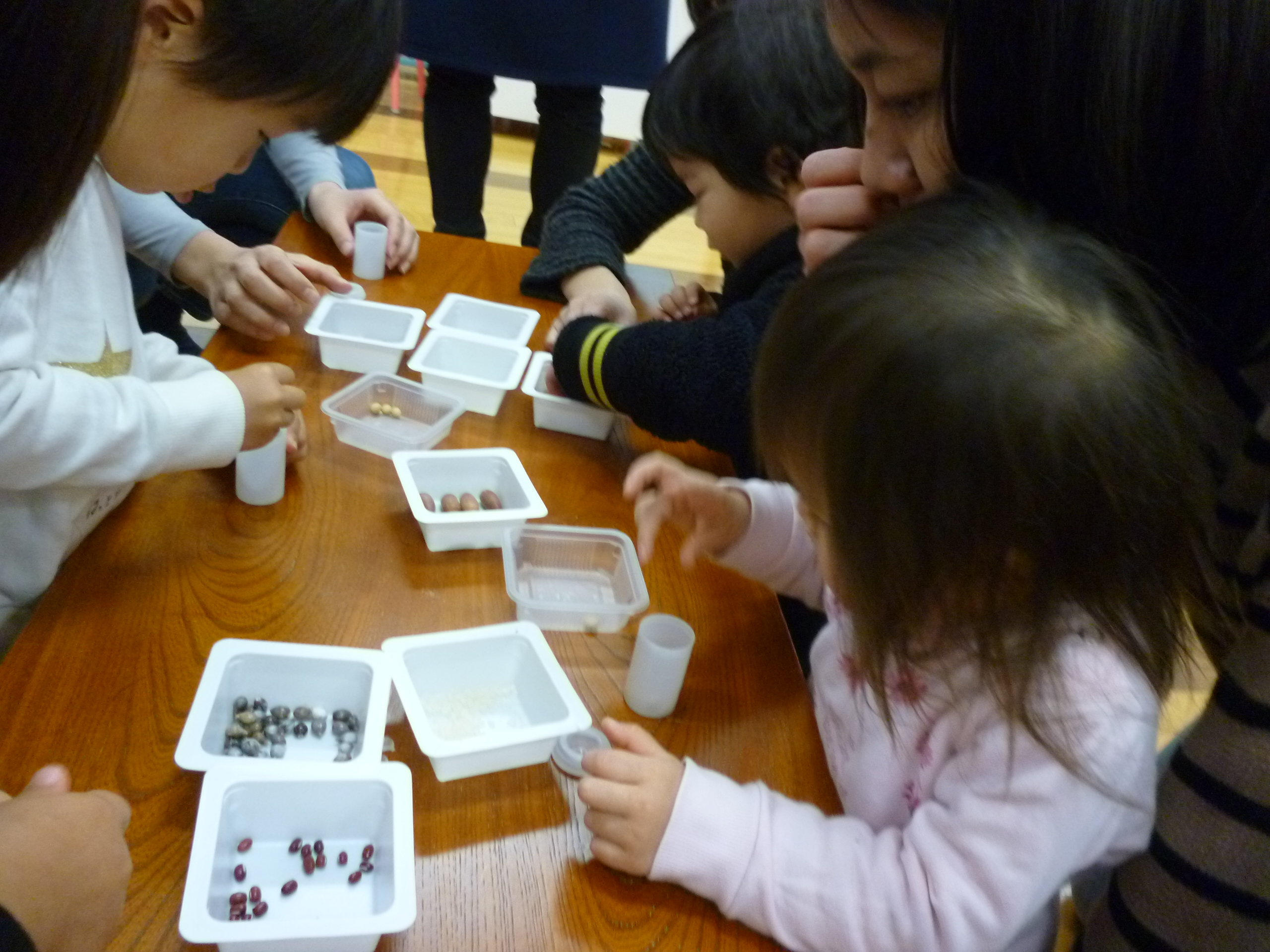 自分の楽器(マラカス)づくり。数珠玉、大豆、どんぐり、米、小豆・・・どれにしようかな~。みんな真剣です。