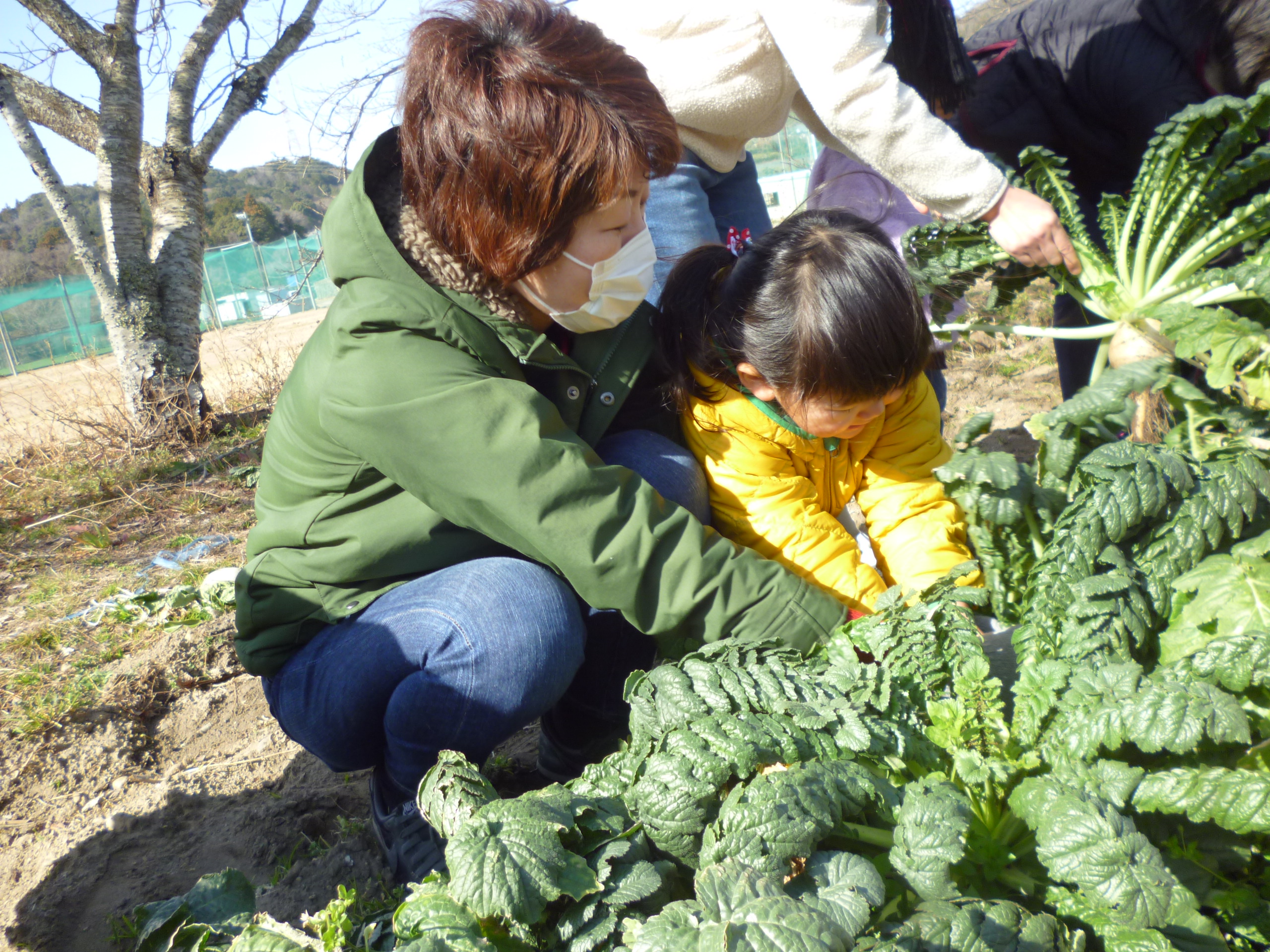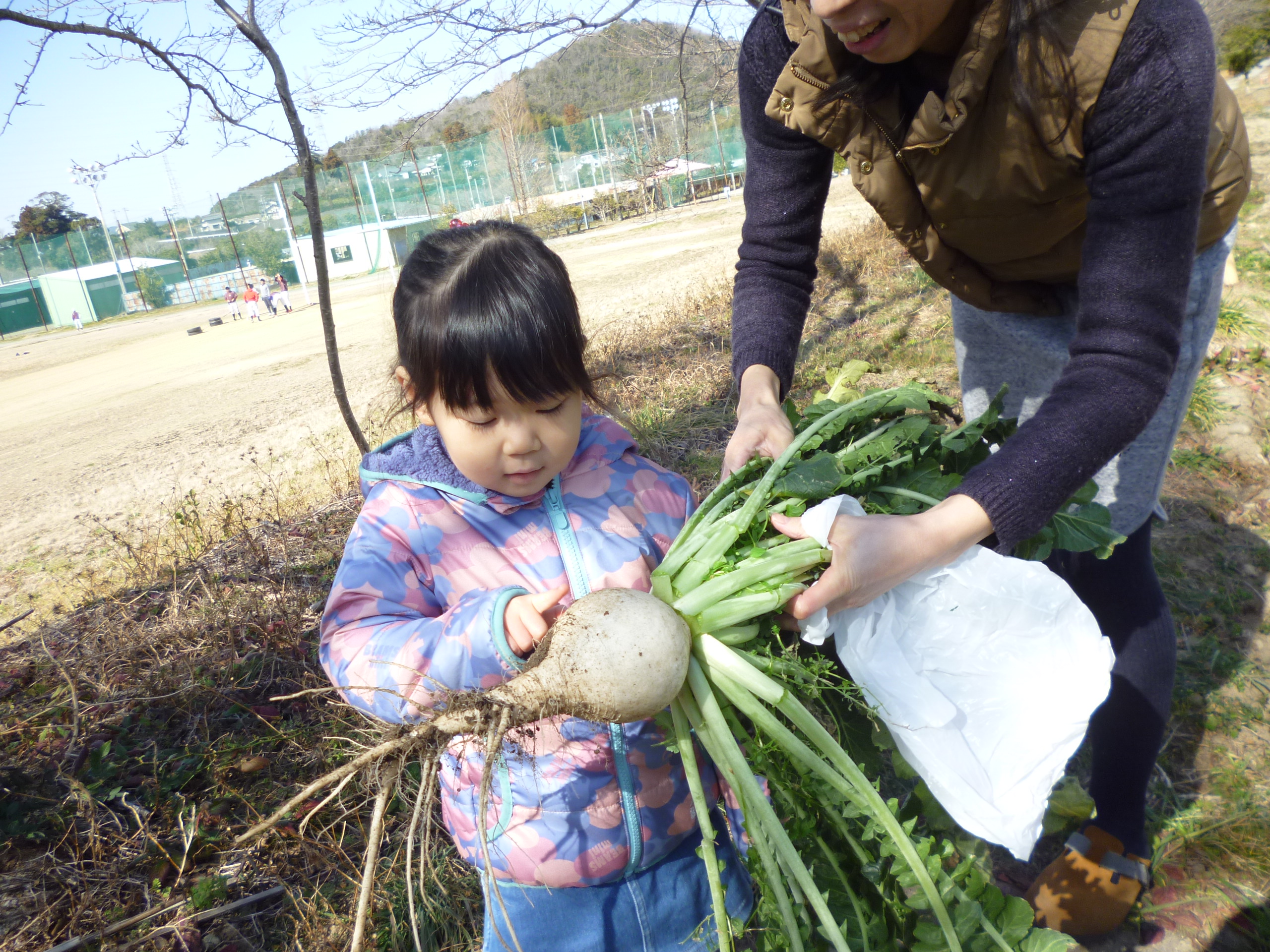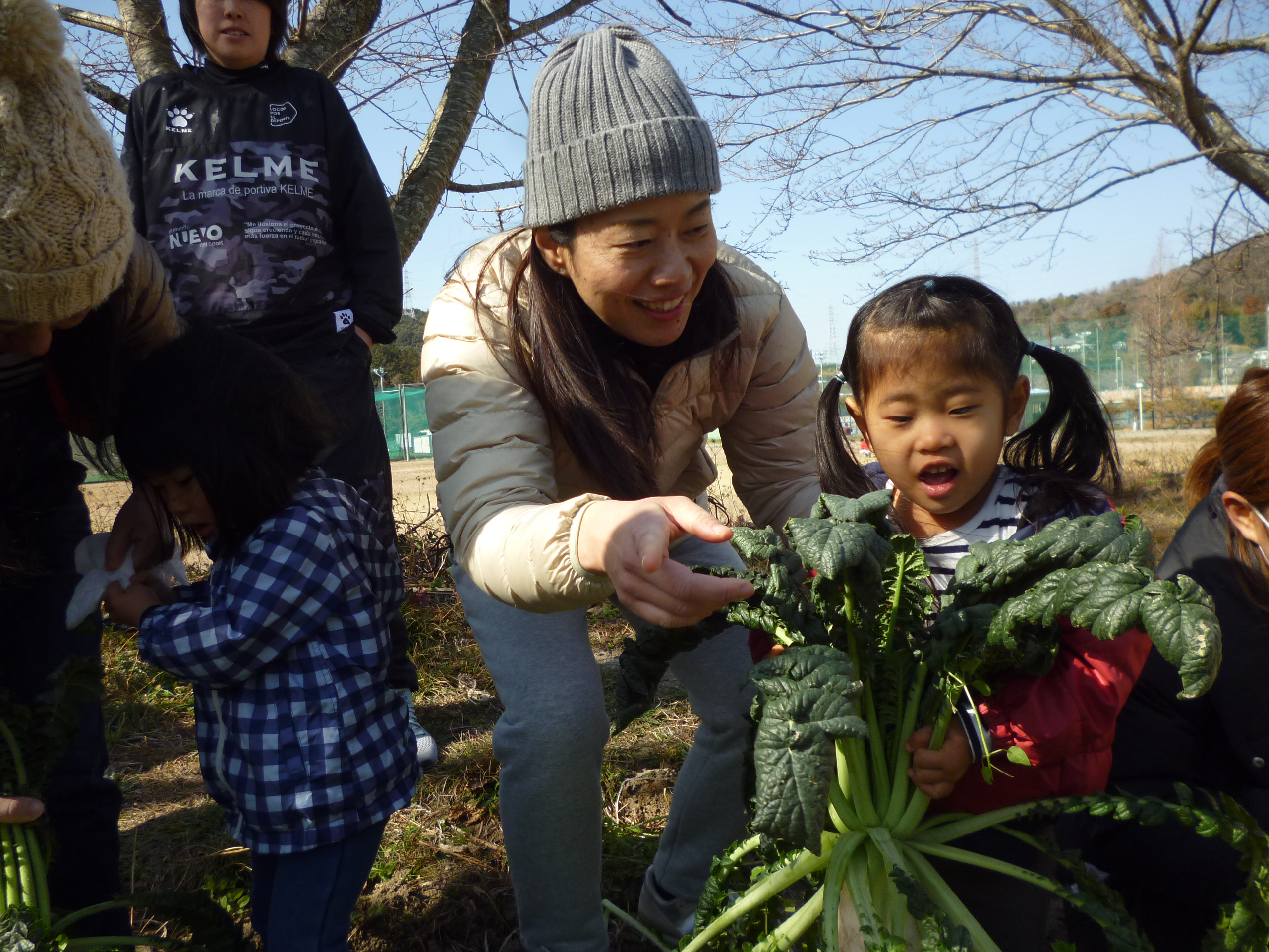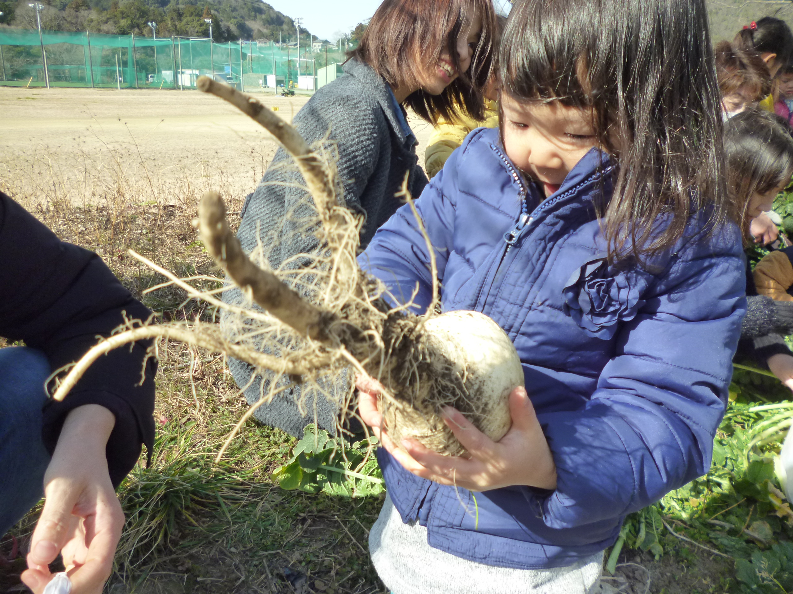 勢いのいい葉が茂っていました。お母様たちは流石です!「ふつうの大根と葉っぱが違うね」「モコモコしてる」といつもの大根との違いを口にしていました。