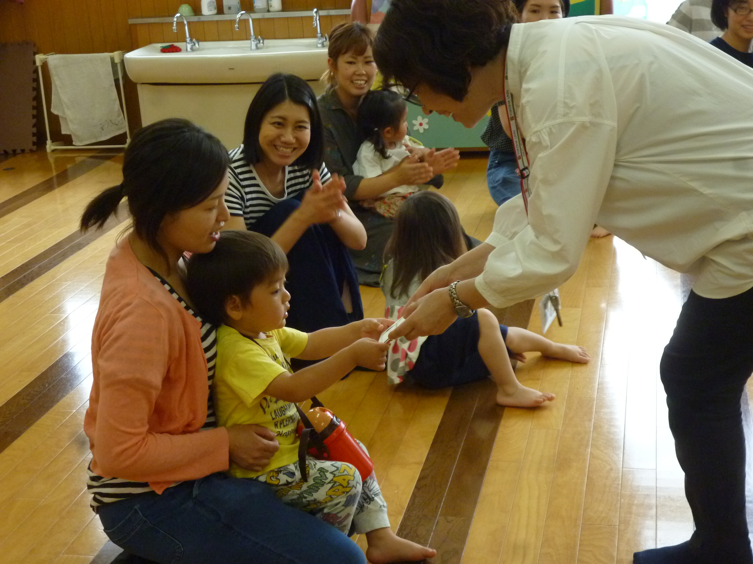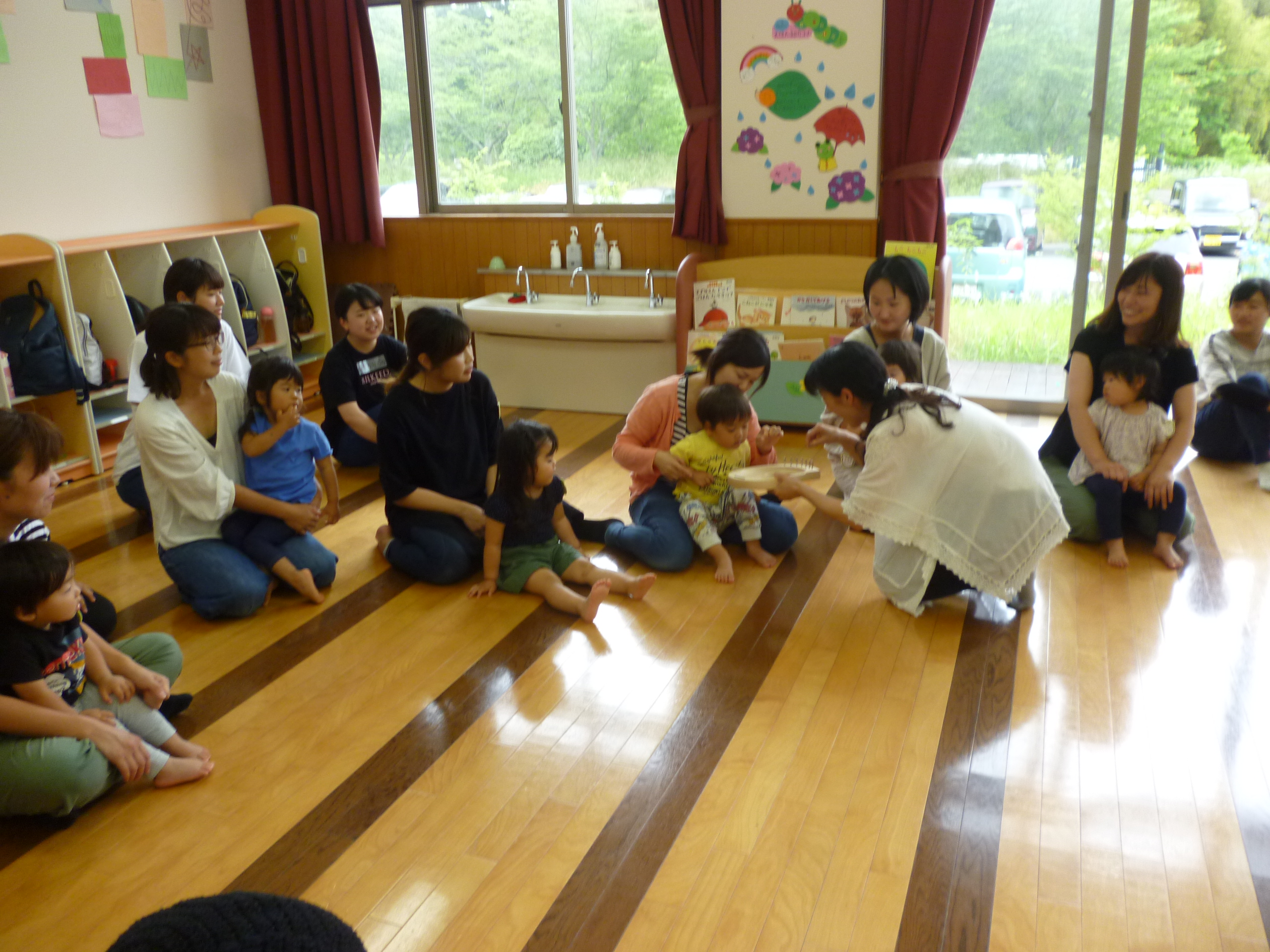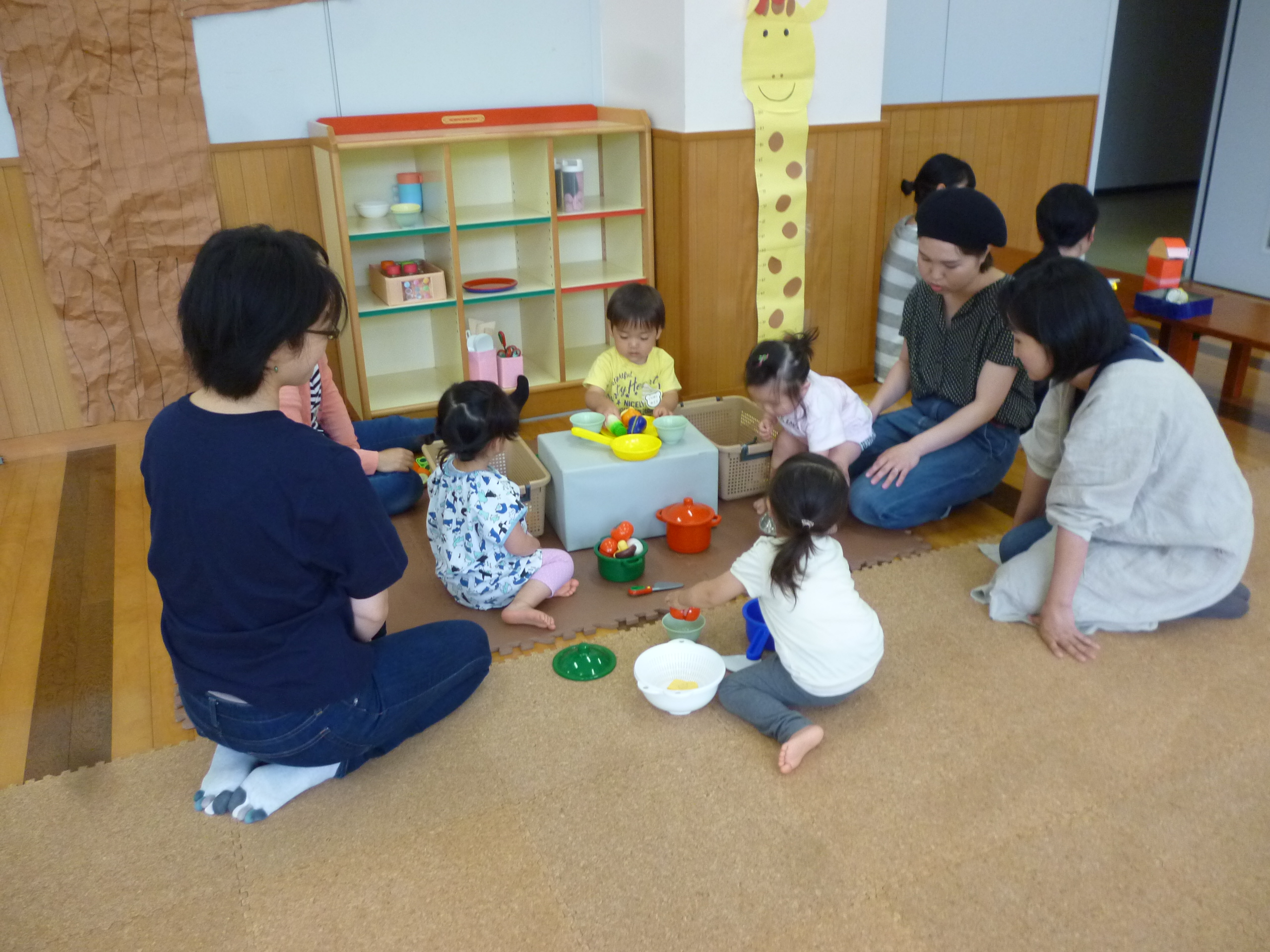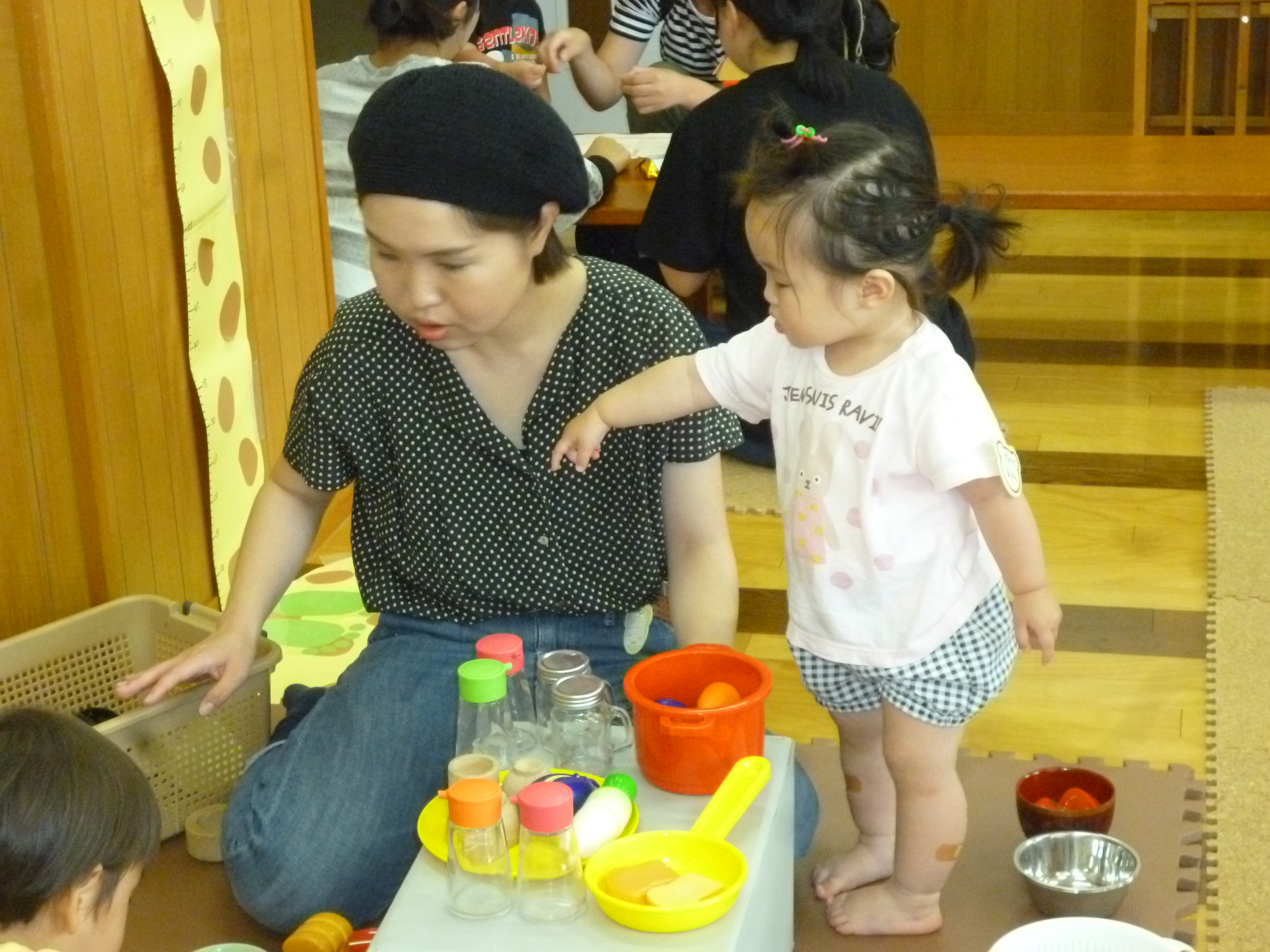 今朝は「ままごとコーナー」が人気。まぜまぜ・・・、はいどうぞ・・・♪遊んでいると自然に周りの子どもや大人の声も耳に入りイメージが広がっていくようです。