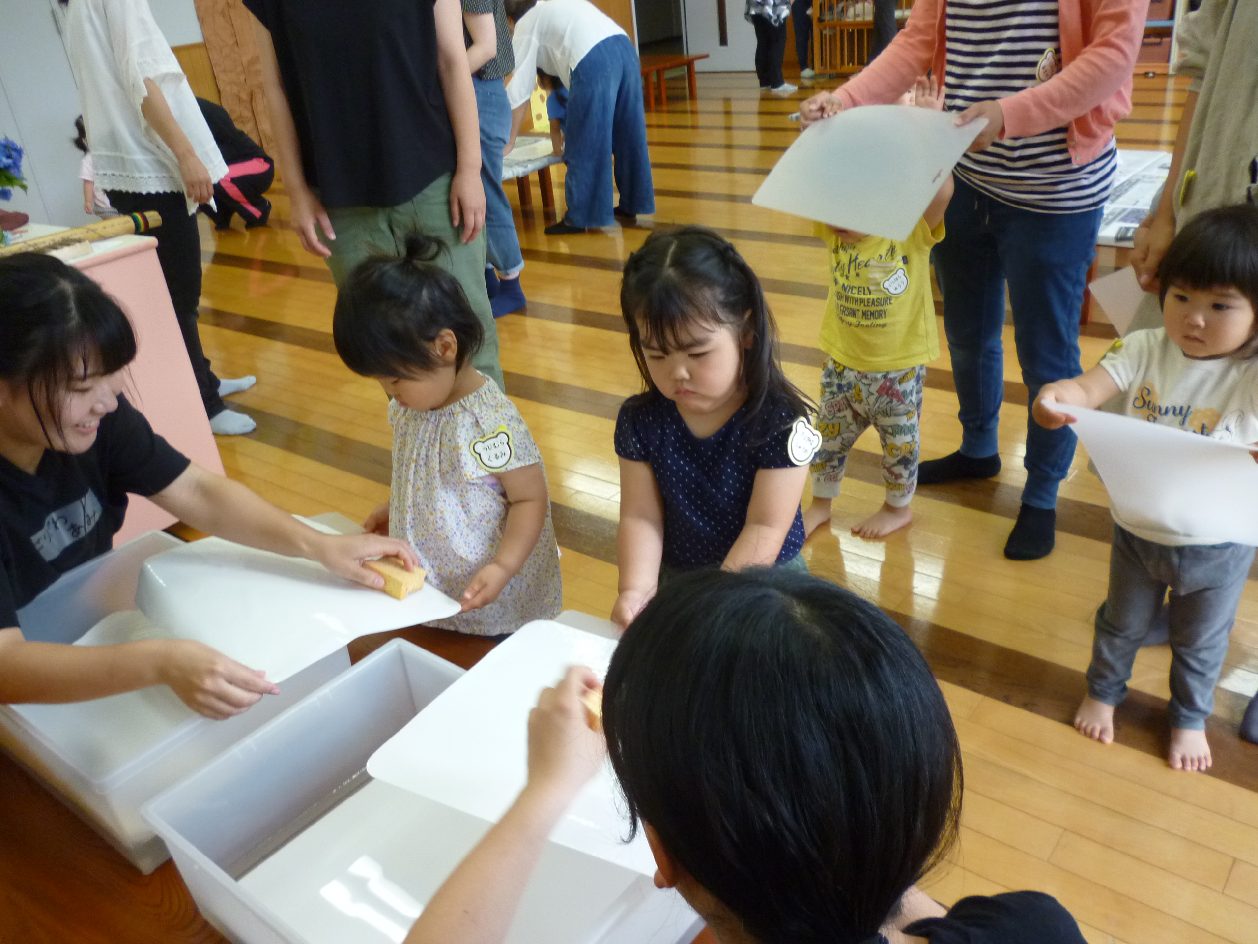 水に浸した画用紙を、チームポッケの学生から受け取ります。