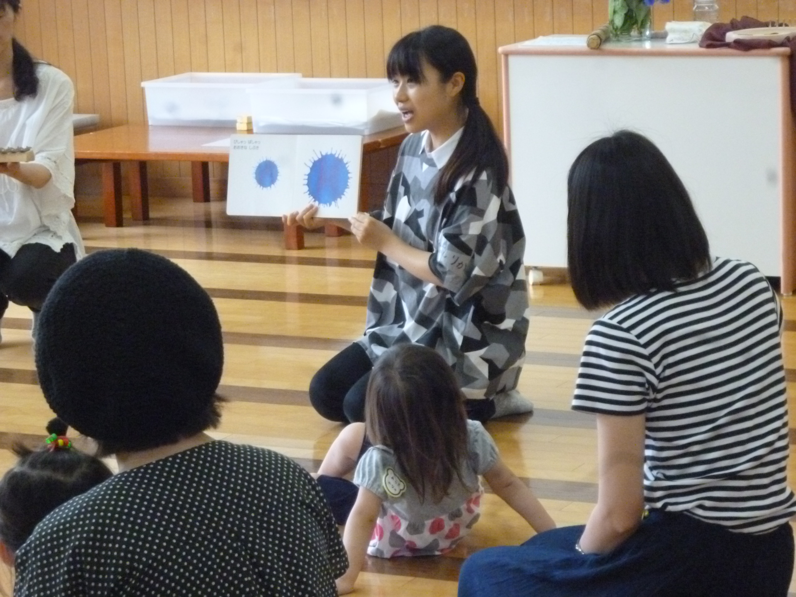お姉さん(学生)が優しい声で読む絵本をじっと見つめ、耳を傾ける親子。色のイメージが広がります。