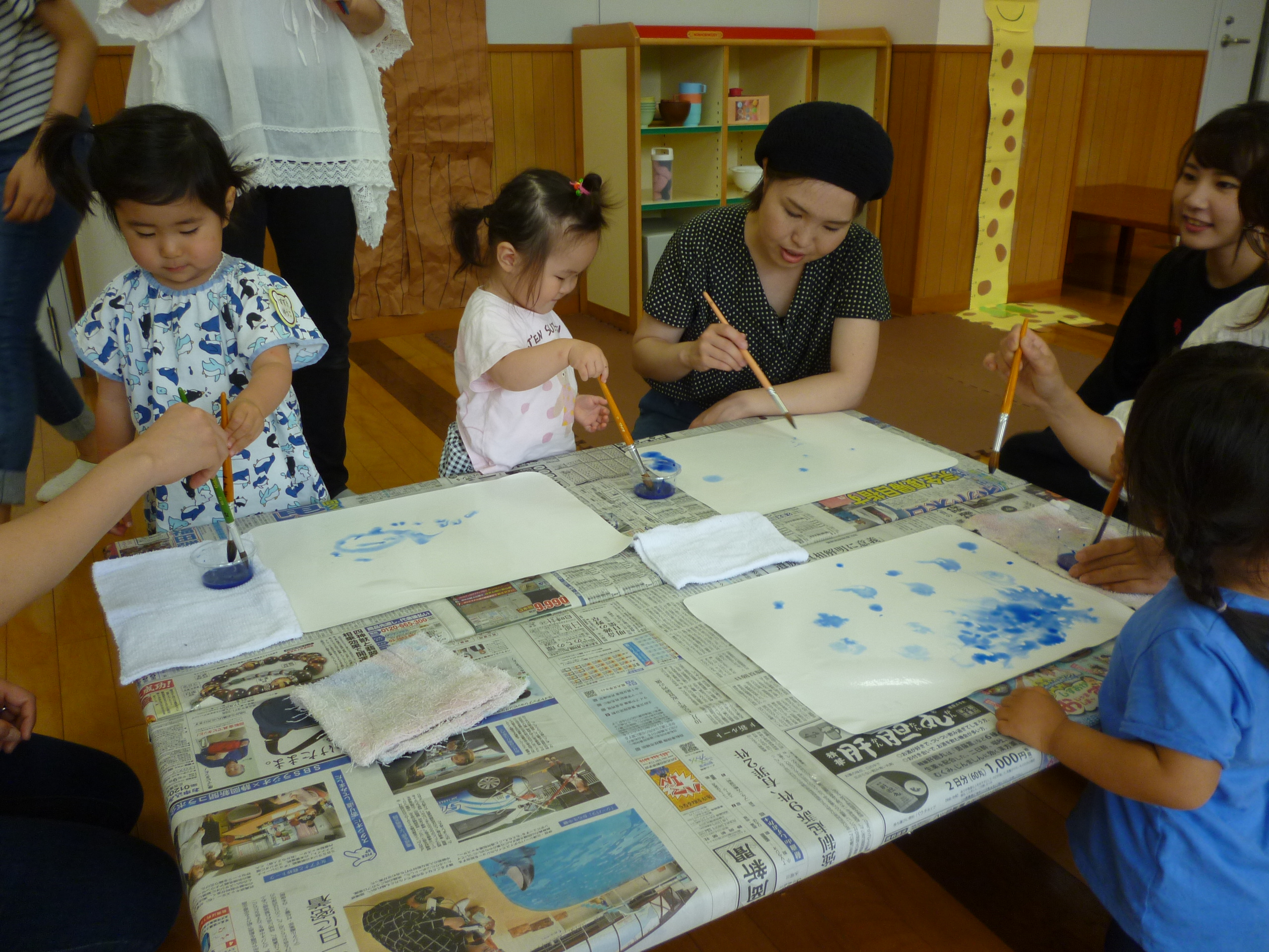 「あお」の世界からそれぞれのペースで楽しみました。同じ画用紙の中で、子は子親は親で楽しんだり親子で同じ筆を持って楽しさを共有したりといろいろでした。