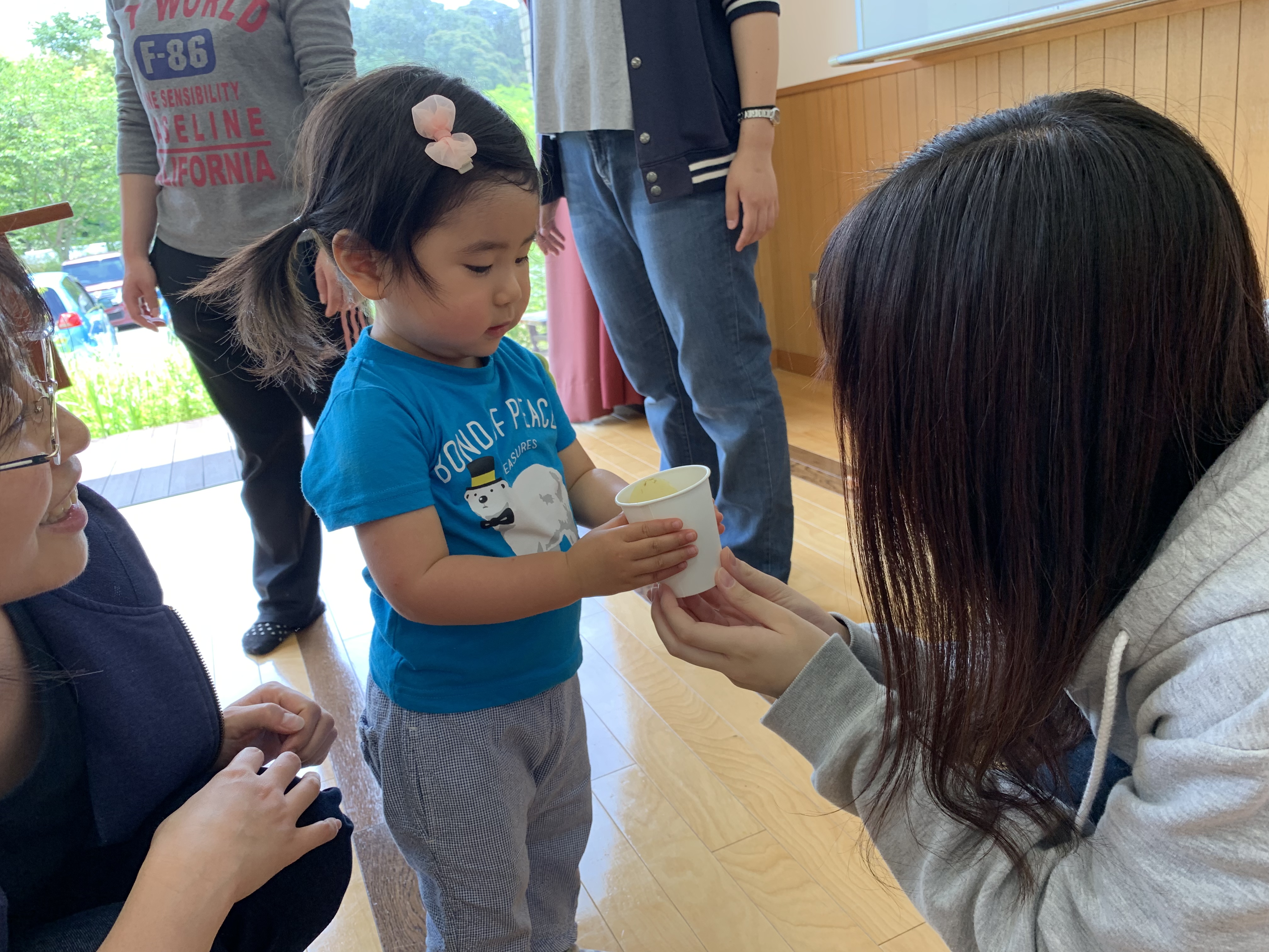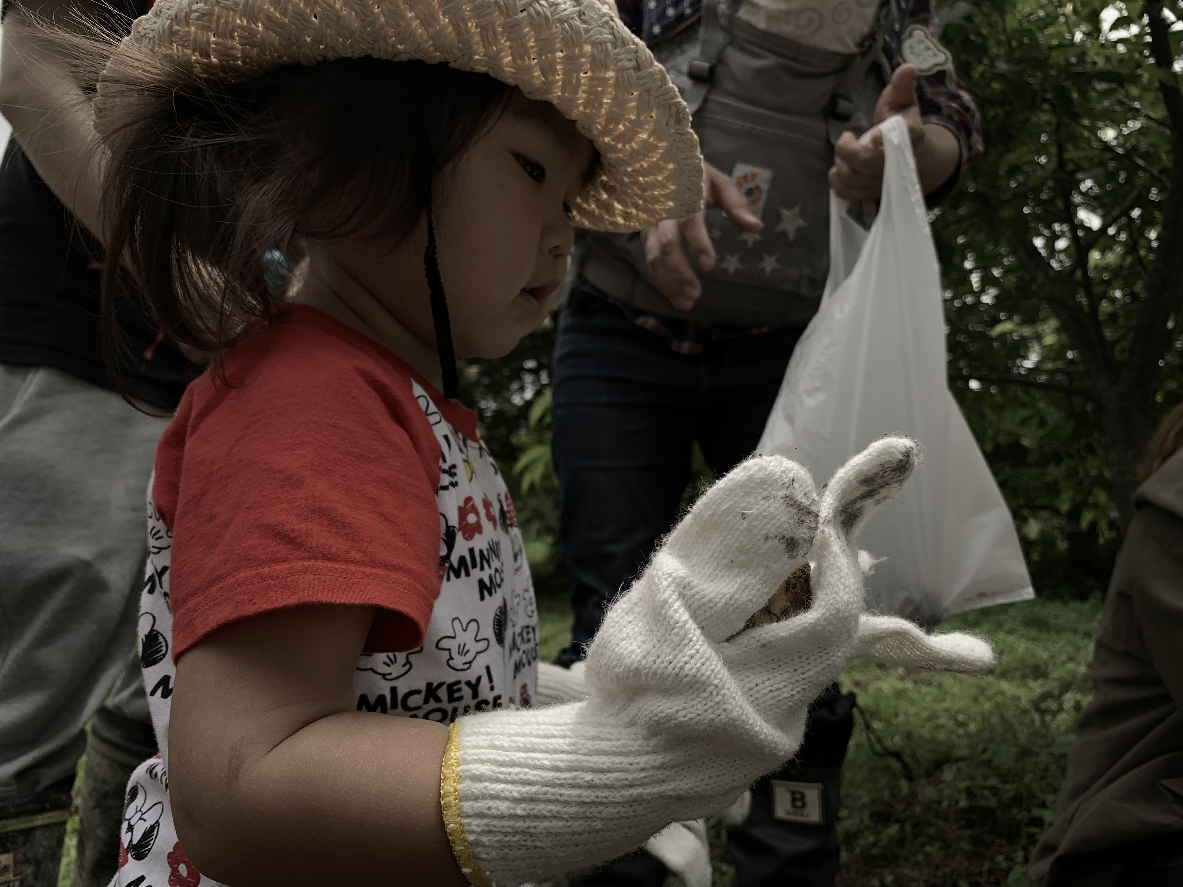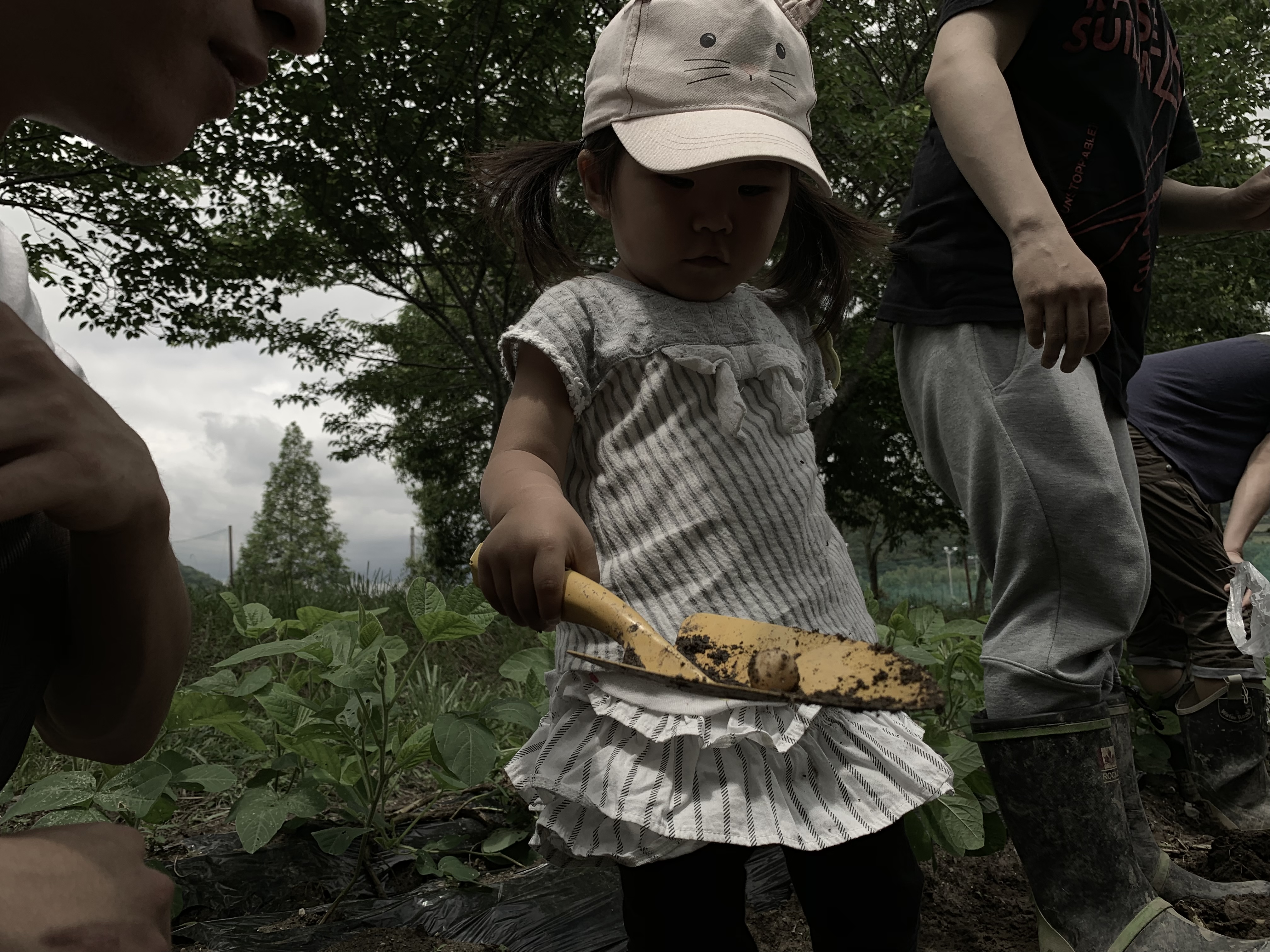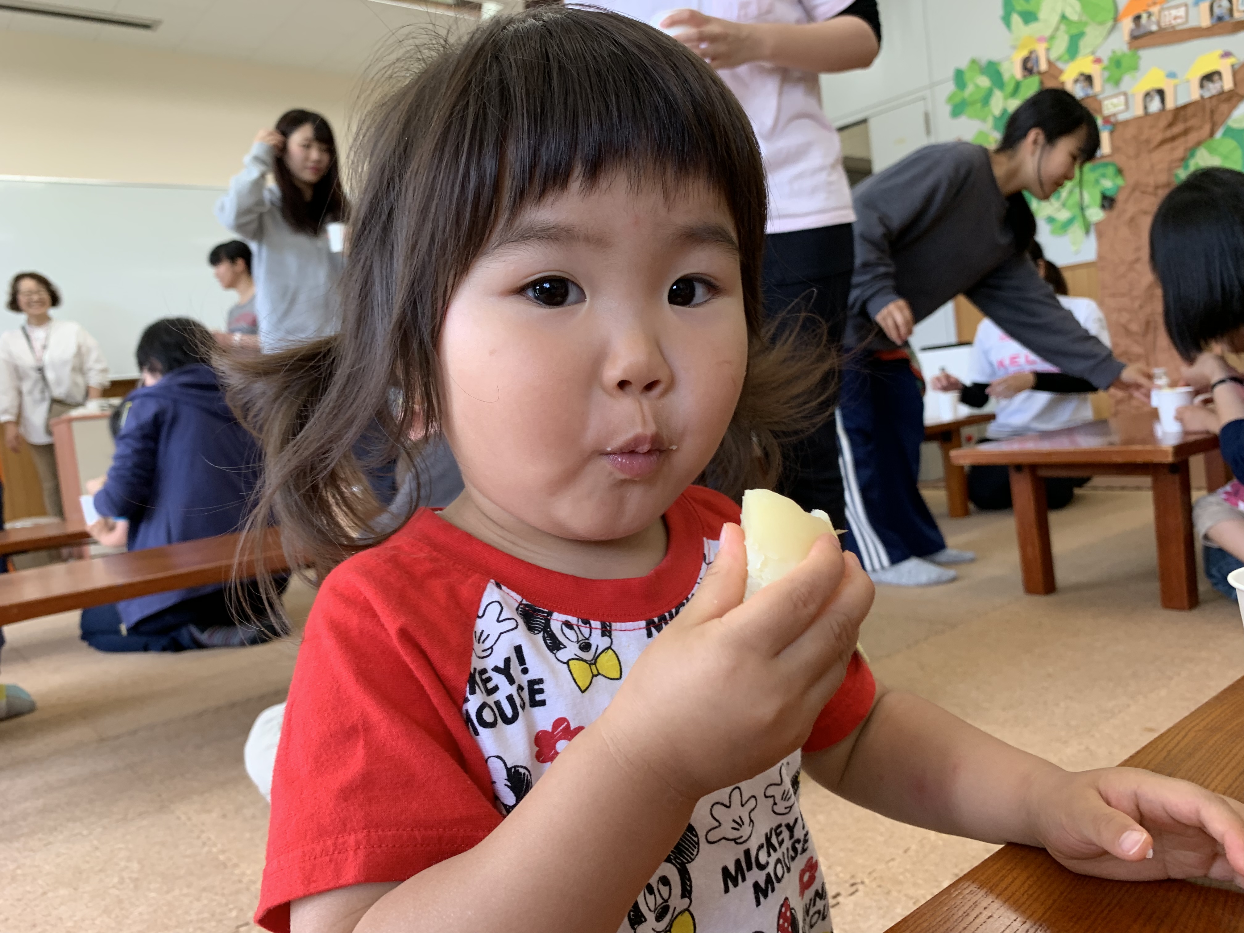 シャベルで土を掘りおこして土の中にかくれているじゃがいもを探します。 皆、袋にいっぱい掘りあげて持ち帰りました。どんな風に料理して食べましょうか~? 掘りあげたじゃがいもをじーっと観察しています。 じゃがいも掘りをしている間に、学生が事前に掘っておいたじゃがいもを蒸し上げておいてくれました! 何も味付けしないで、もぐもぐ・・・。おいもの甘味を味わいました。 おかわり続出です‼