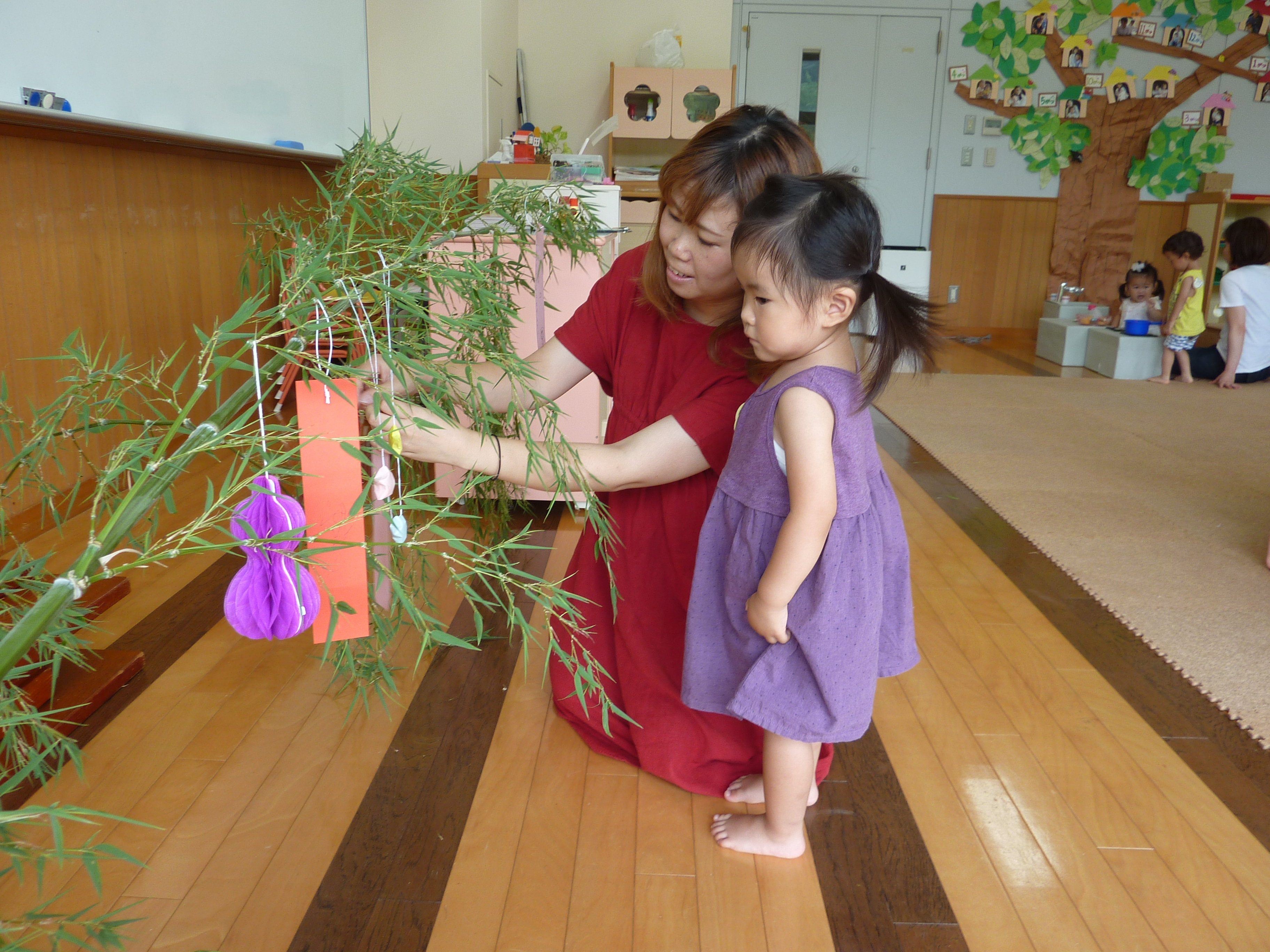 リトミックが始まる前に、短冊にお願いごとを書いたり笹に飾り付けをしたりして楽しみました。一人一枝持ち帰りました。