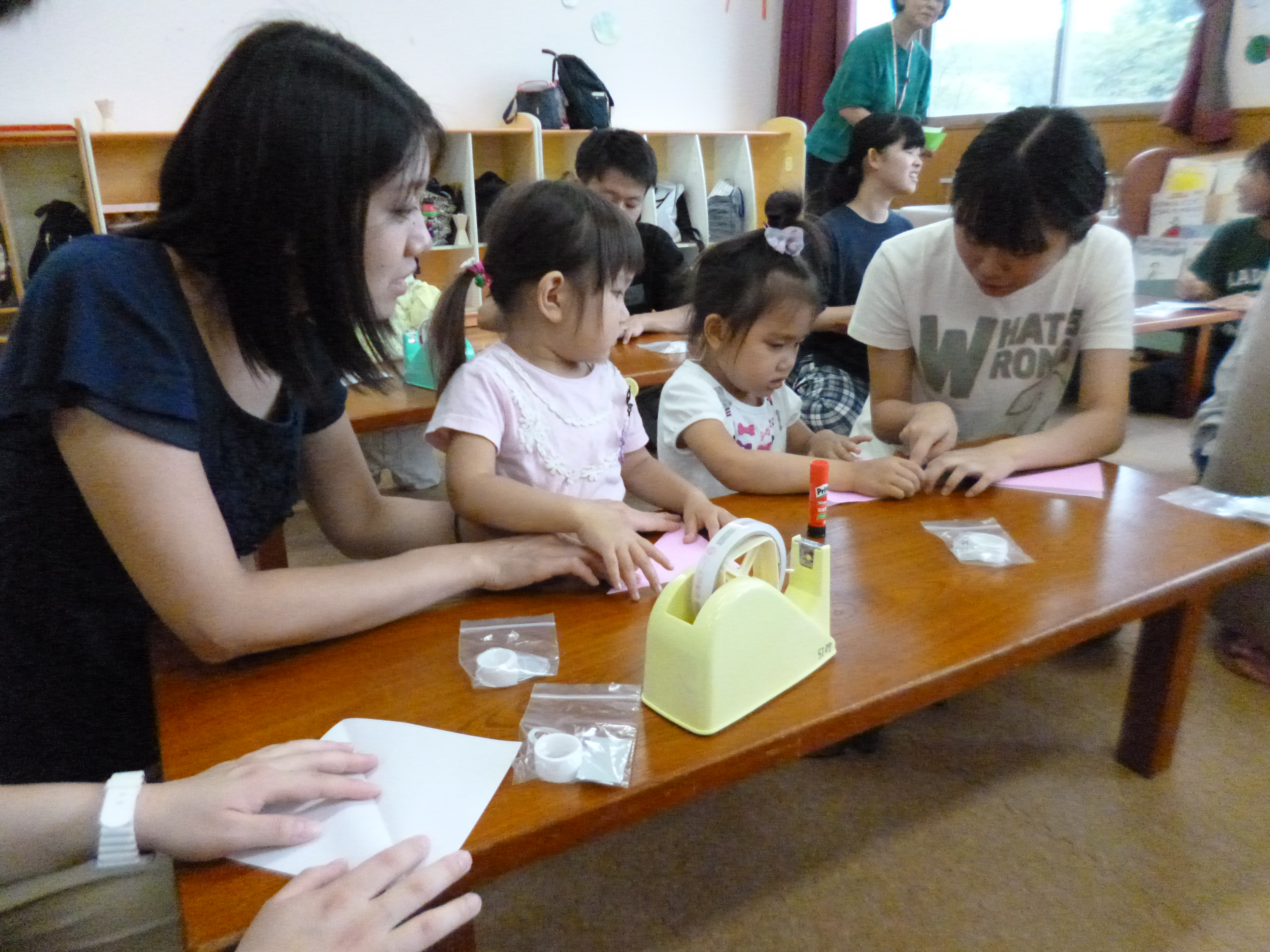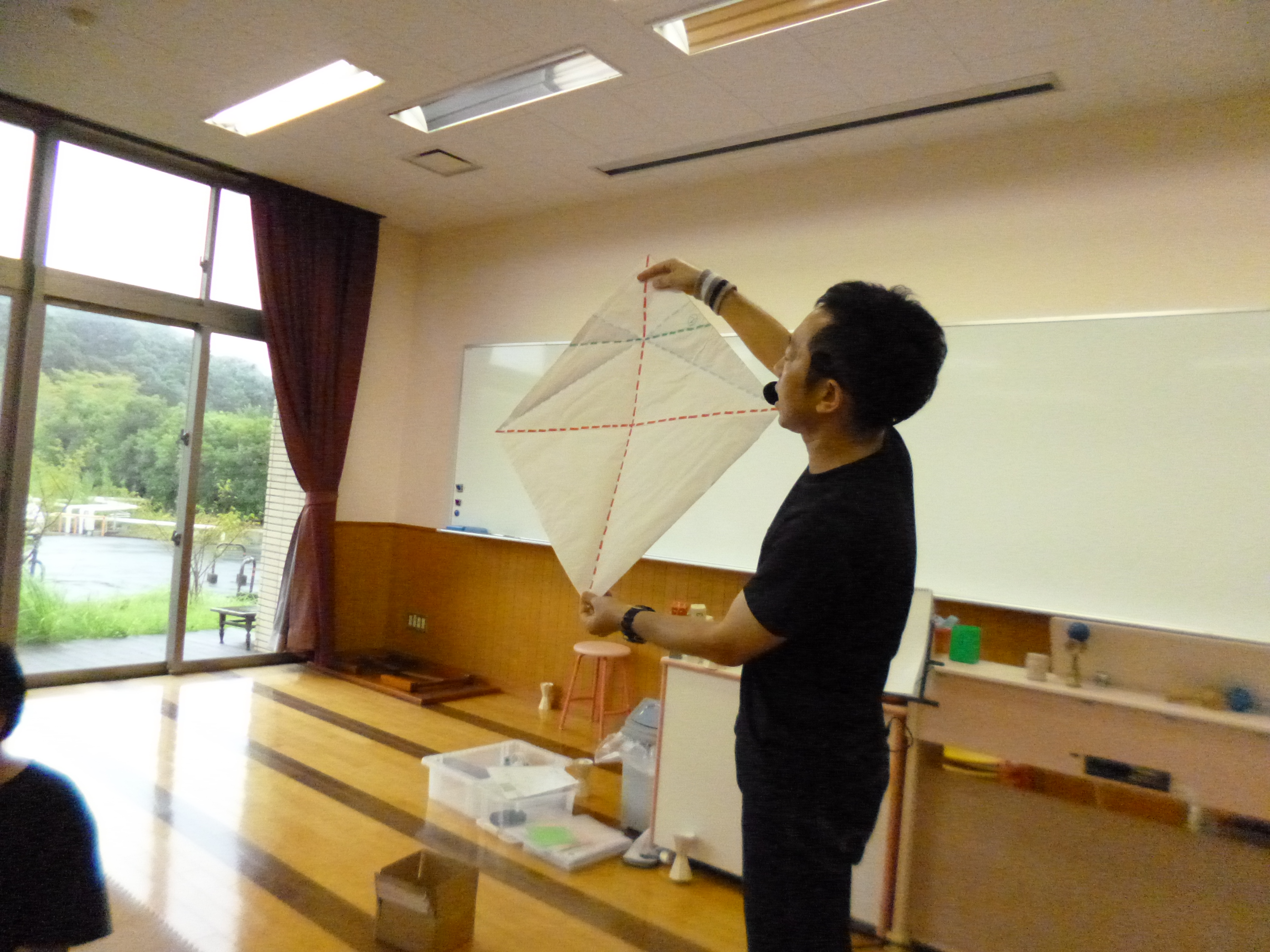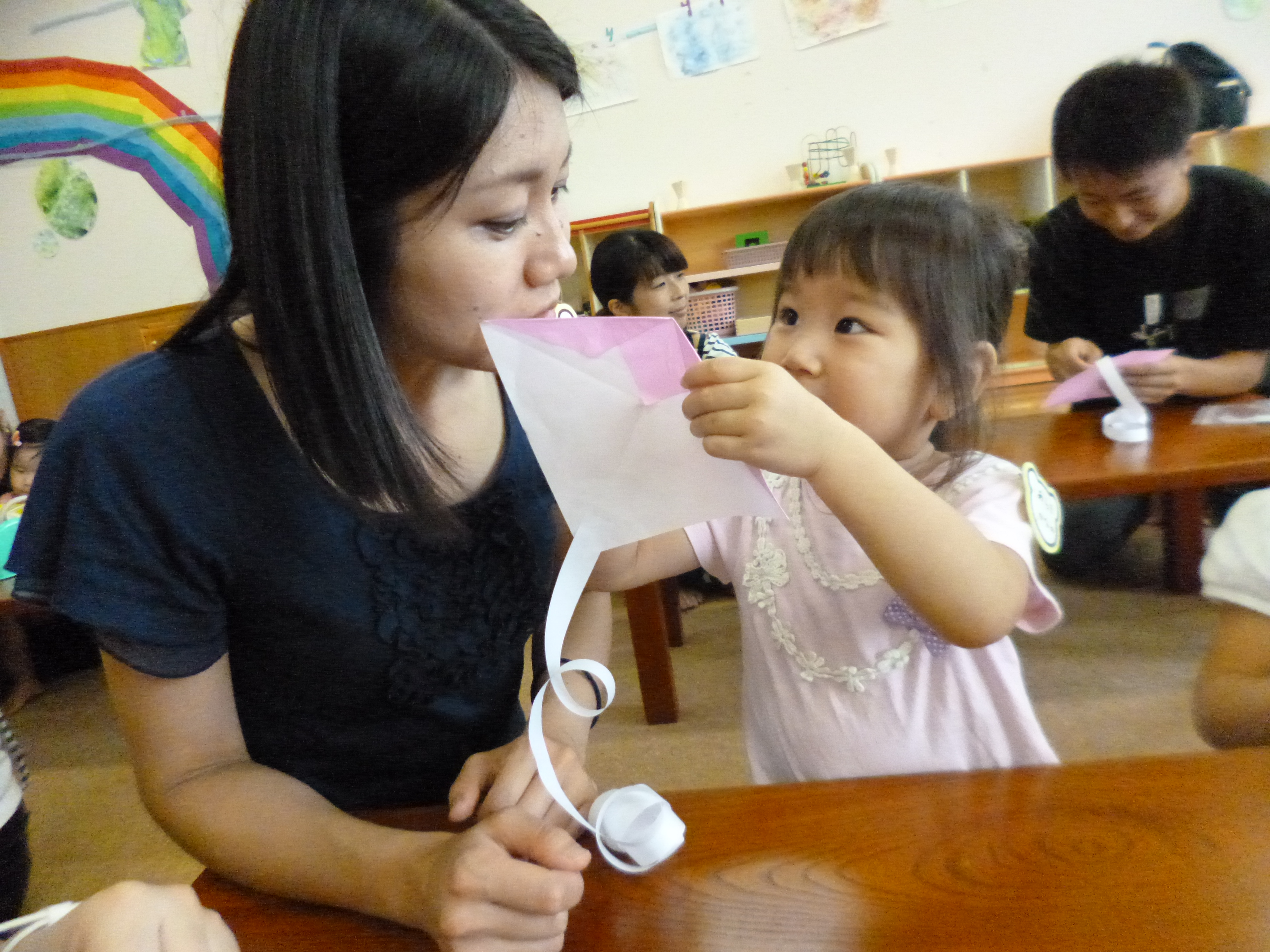 折り紙でも、きちっと折って作ればよく飛ぶ「凧」。大きく見やすい見本でわかりやすく伝えてくださったので、お兄ちゃんお姉ちゃんたちはほぼ一人で作っていました。
