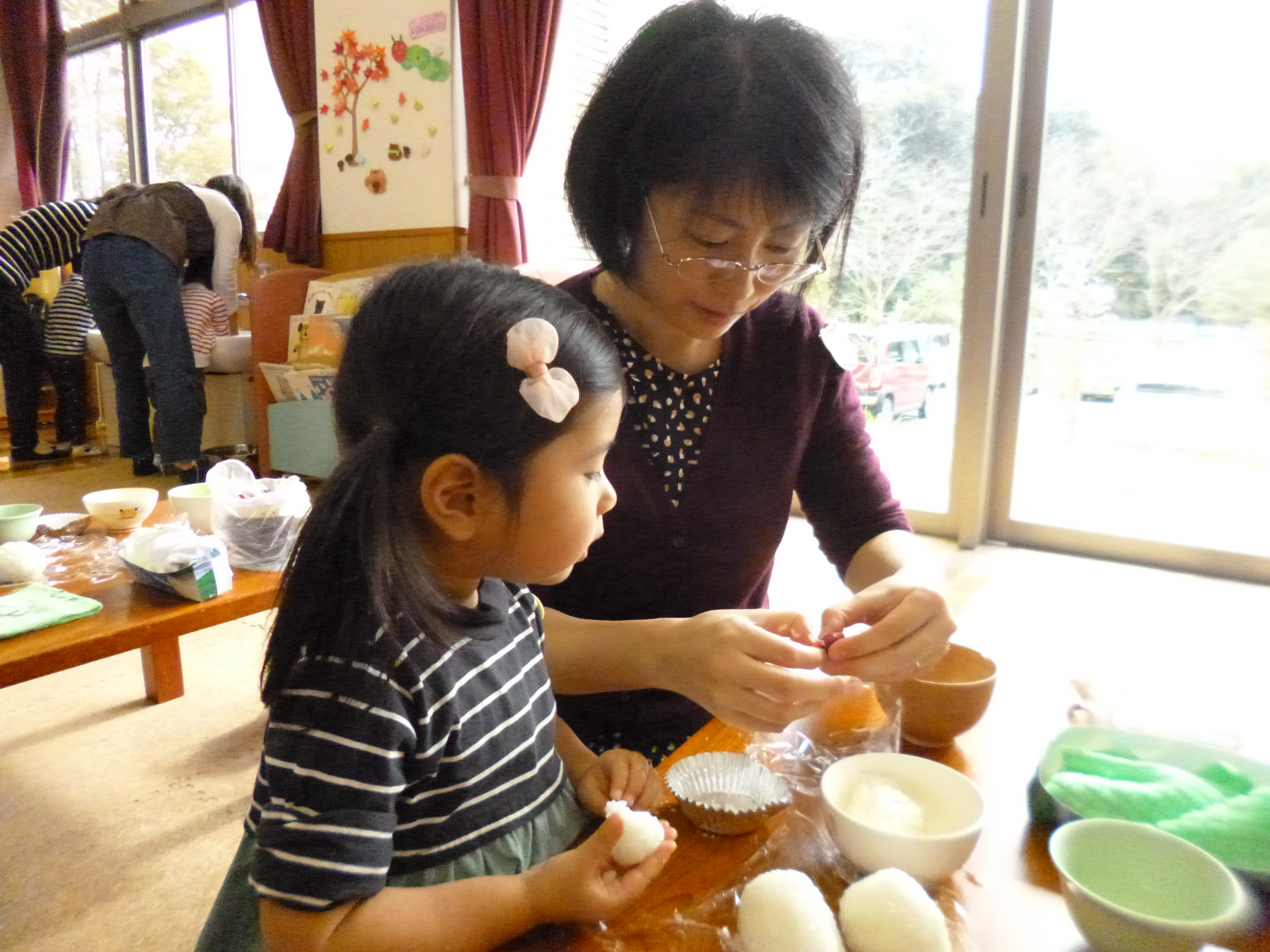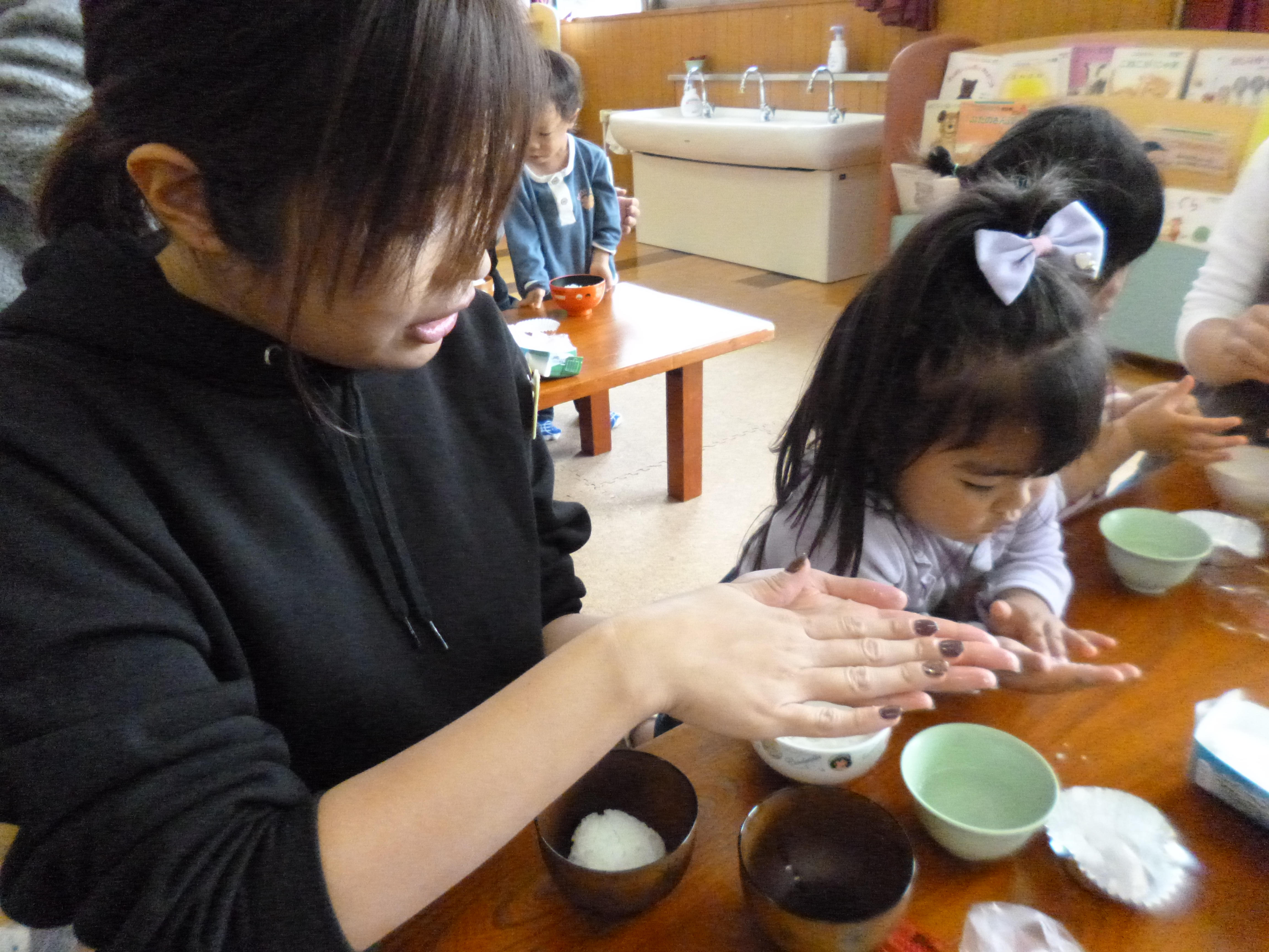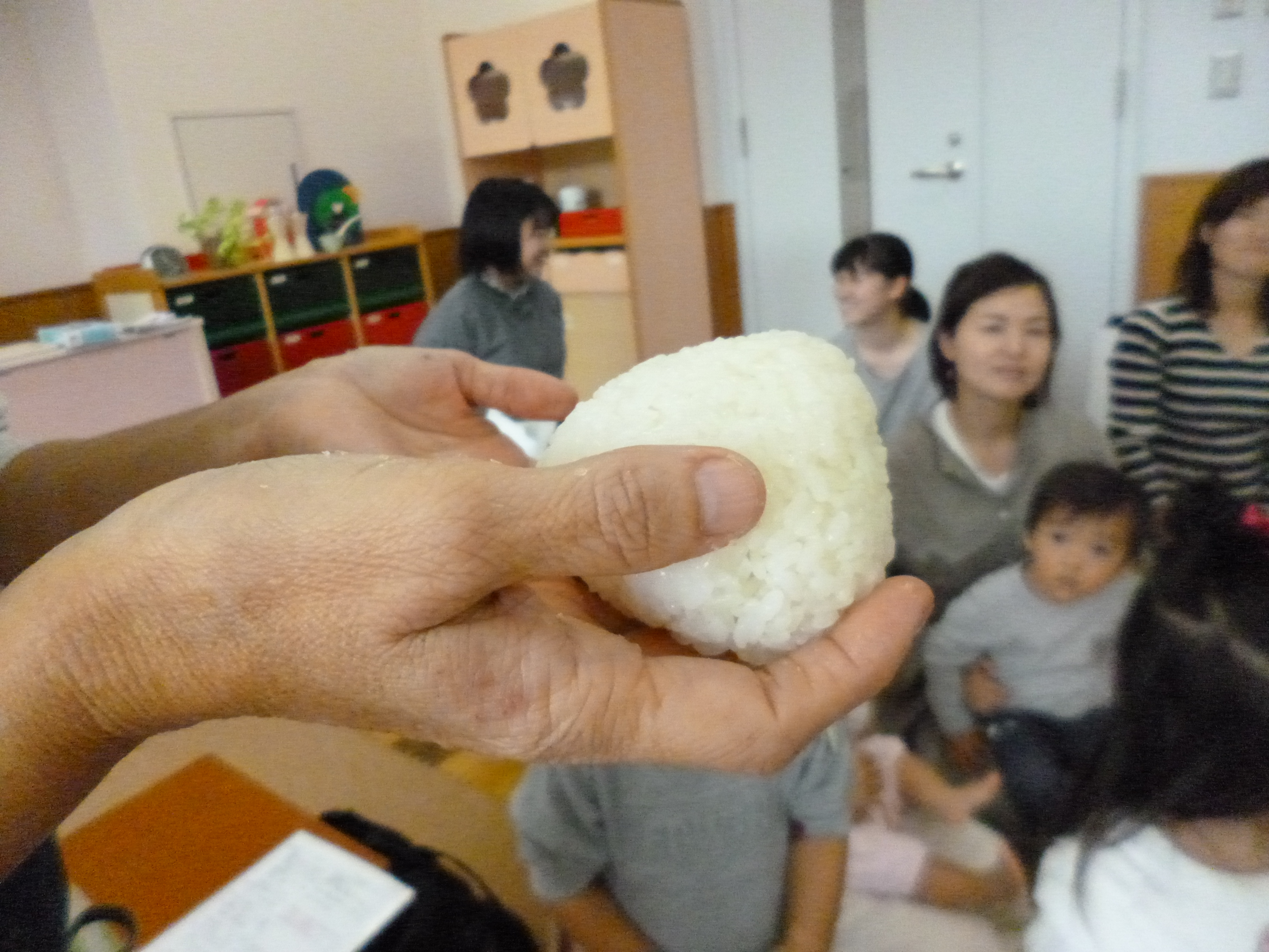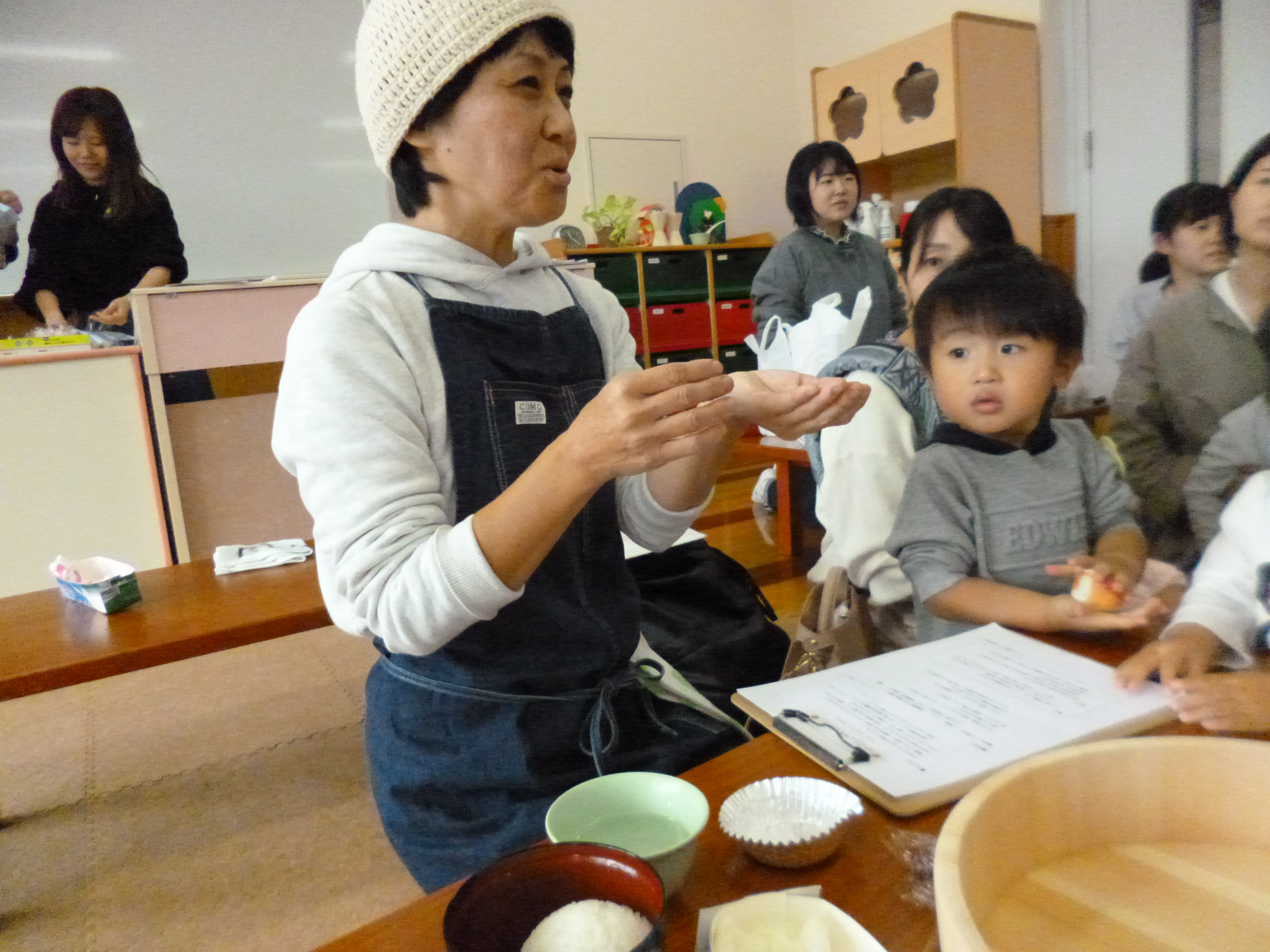 梅干し入りのおにぎり作り。炊き立てのご飯を「飯台」に移すといいことや、是非、家族には『素手で』握るといいことも話してくださり、握って見せてくださる姿からは愛情が伝わりました。