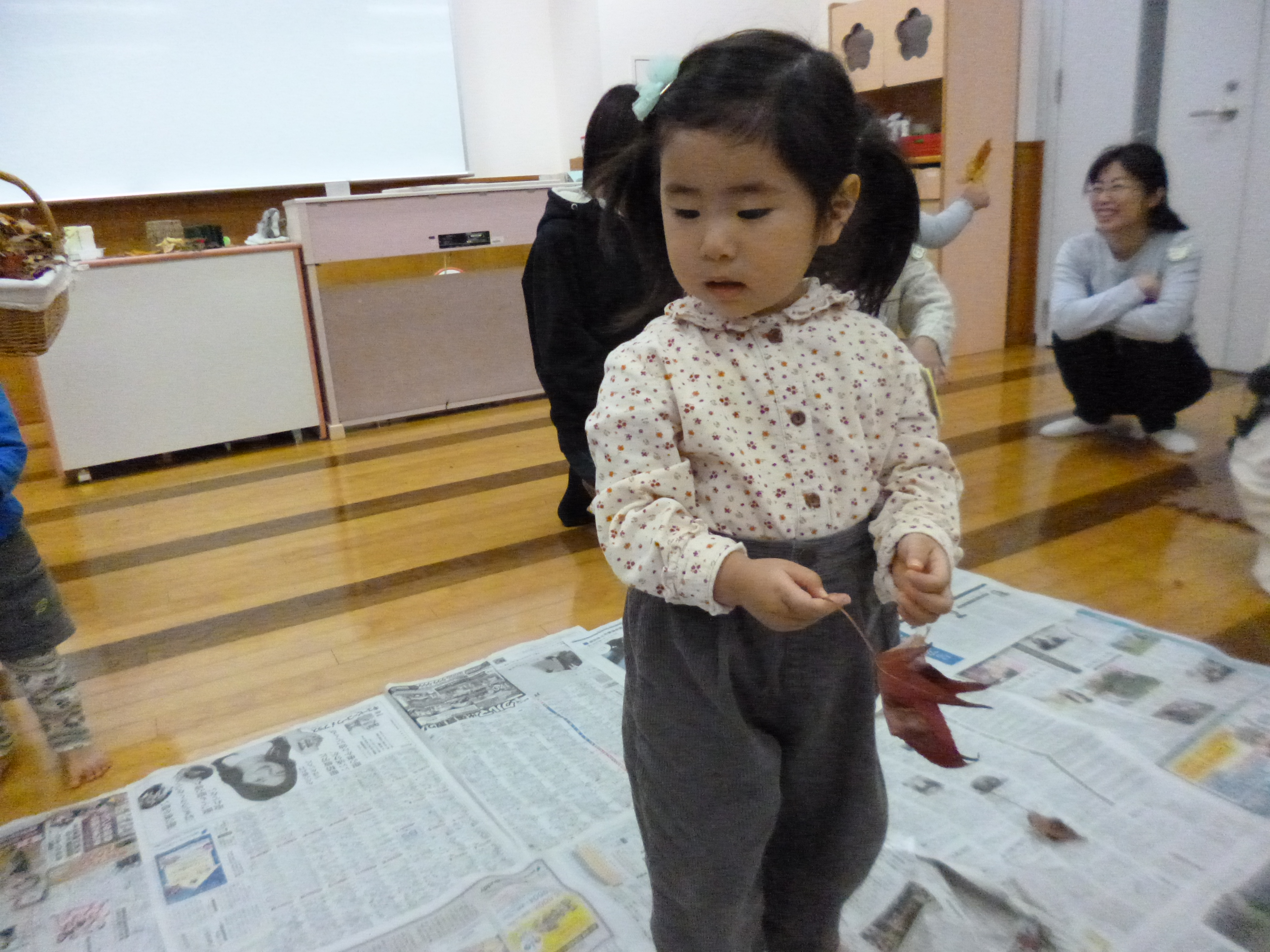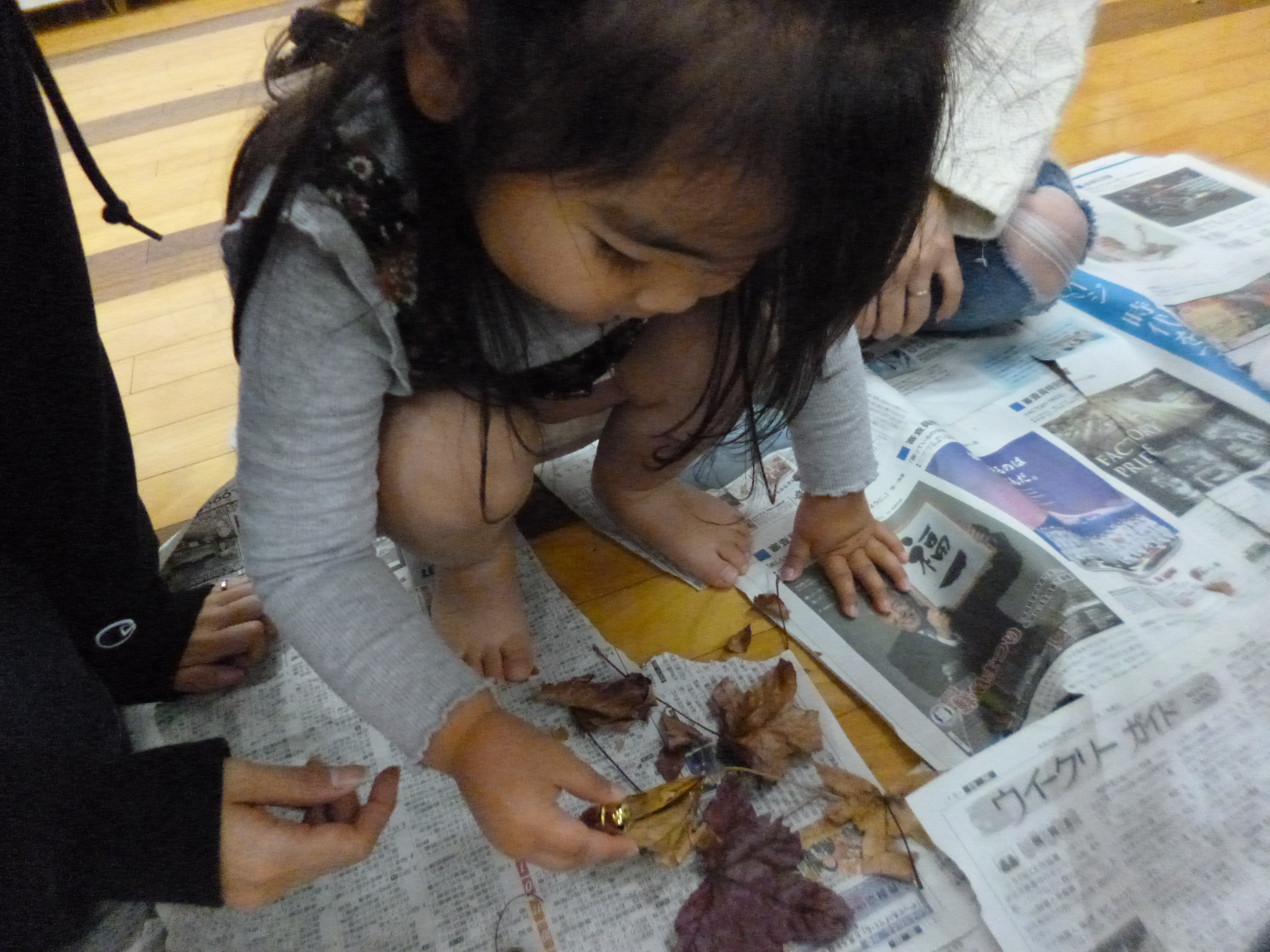 大きな新聞紙のシートの上に、ヒラヒラと落ち葉が・・・。