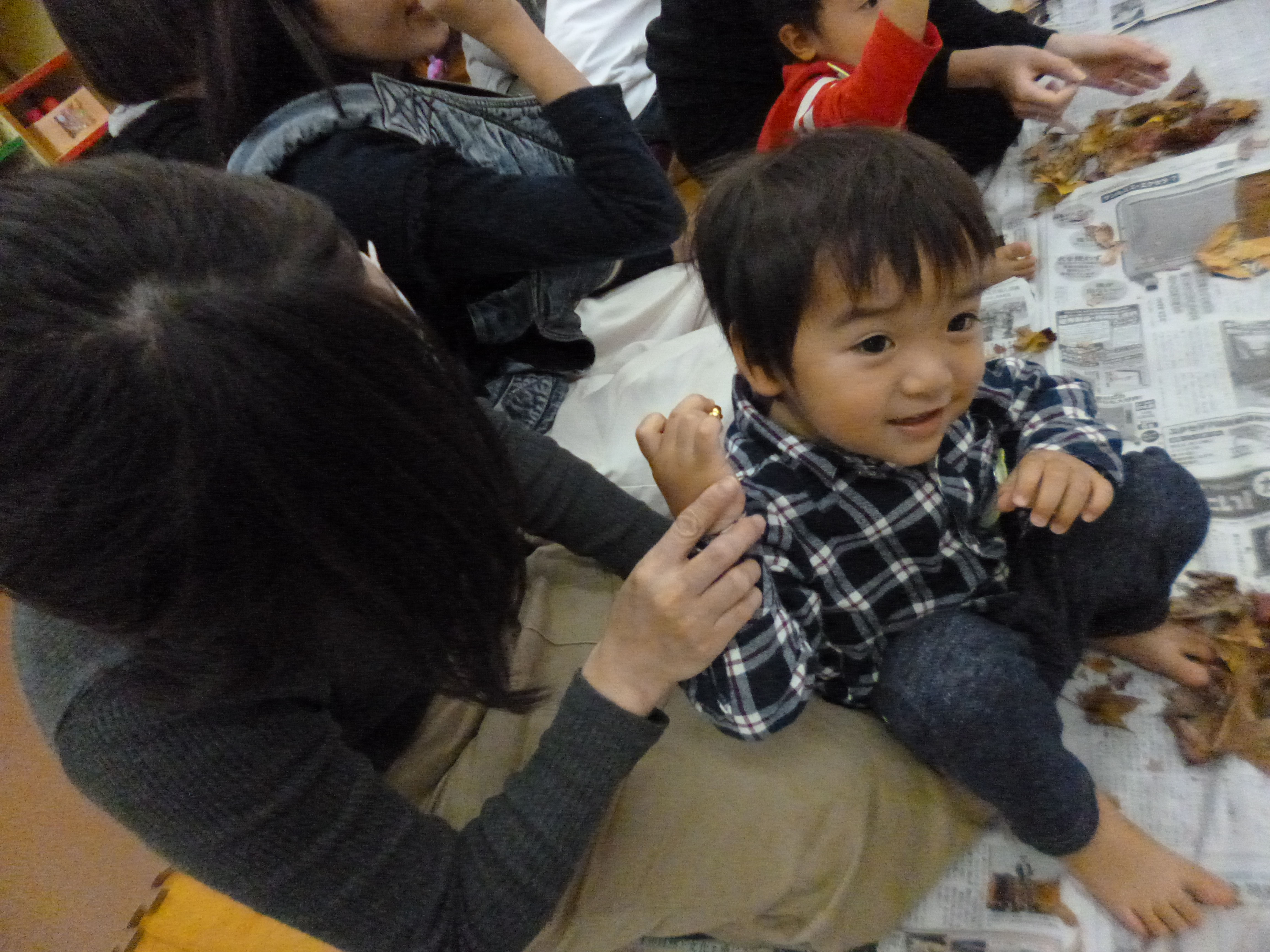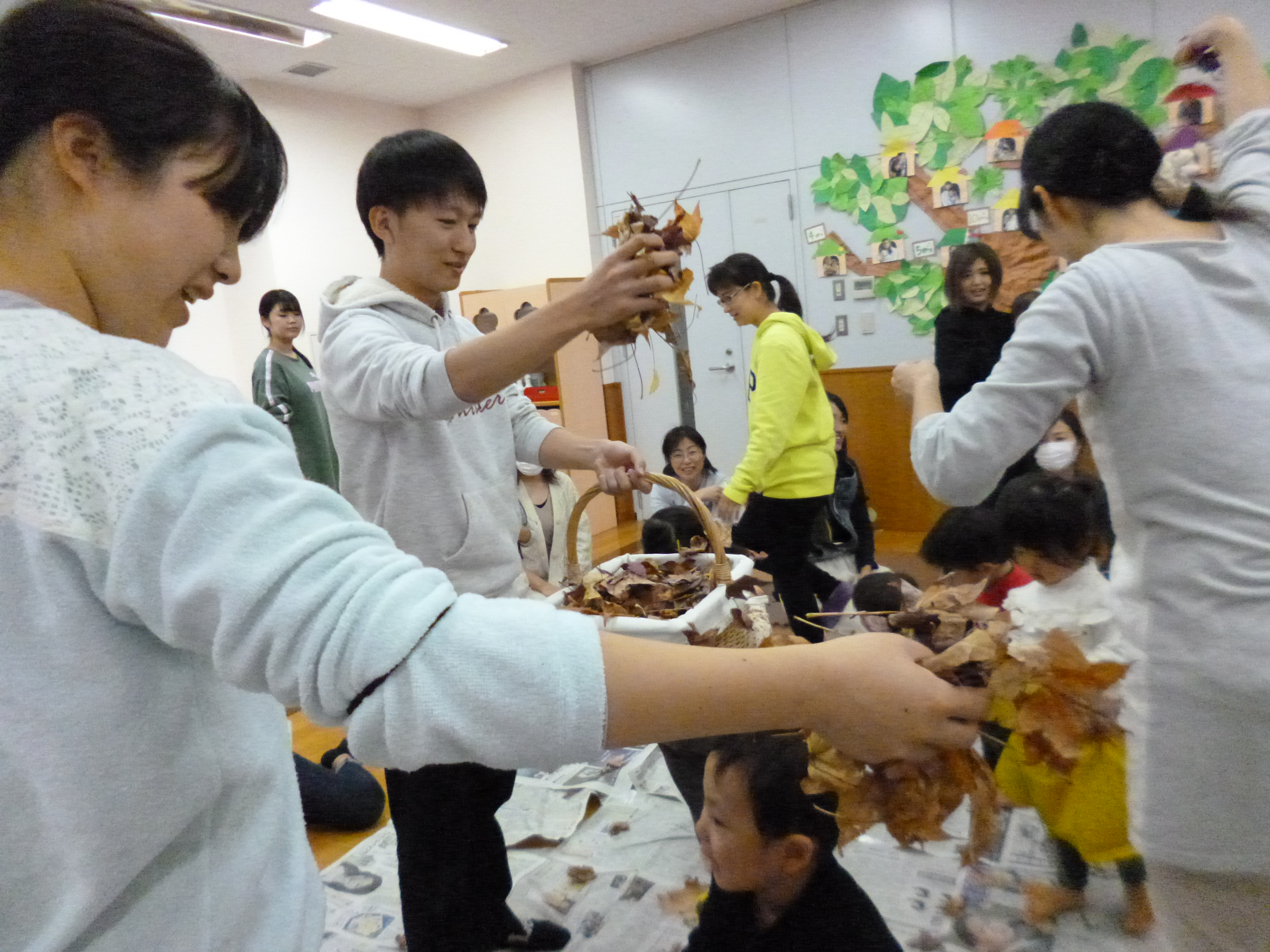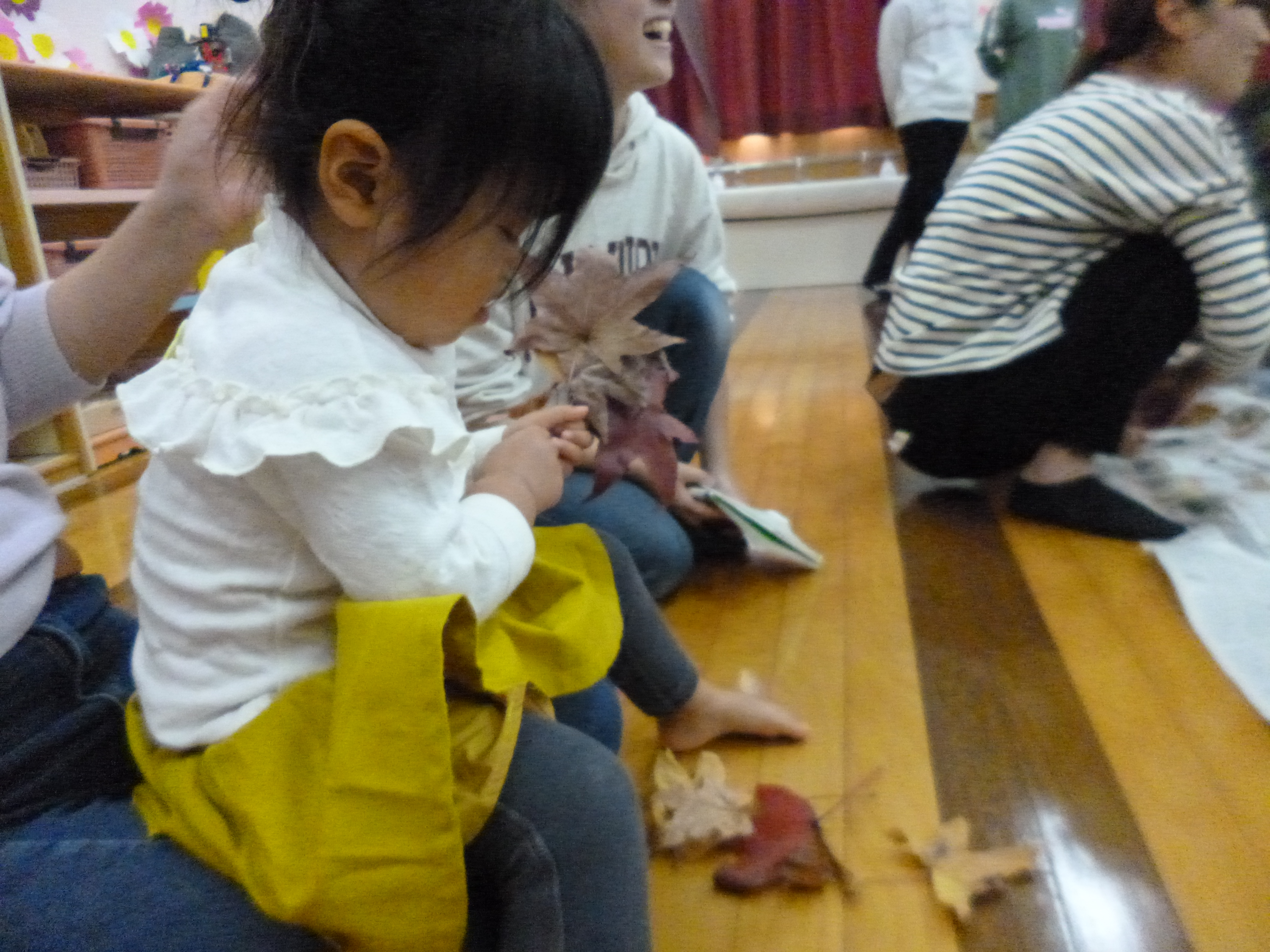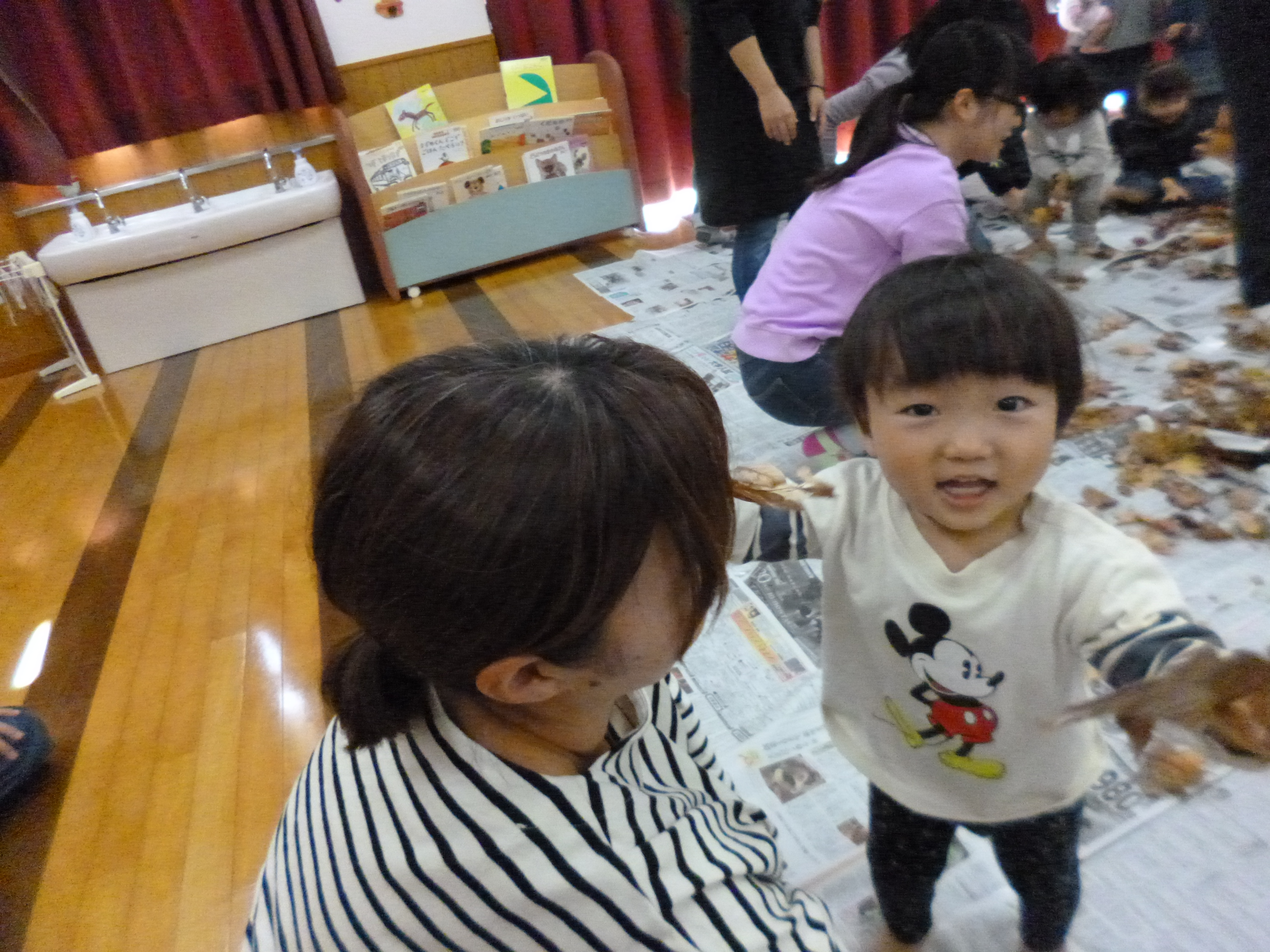 落ち葉を親子でかけあって楽しんでます。