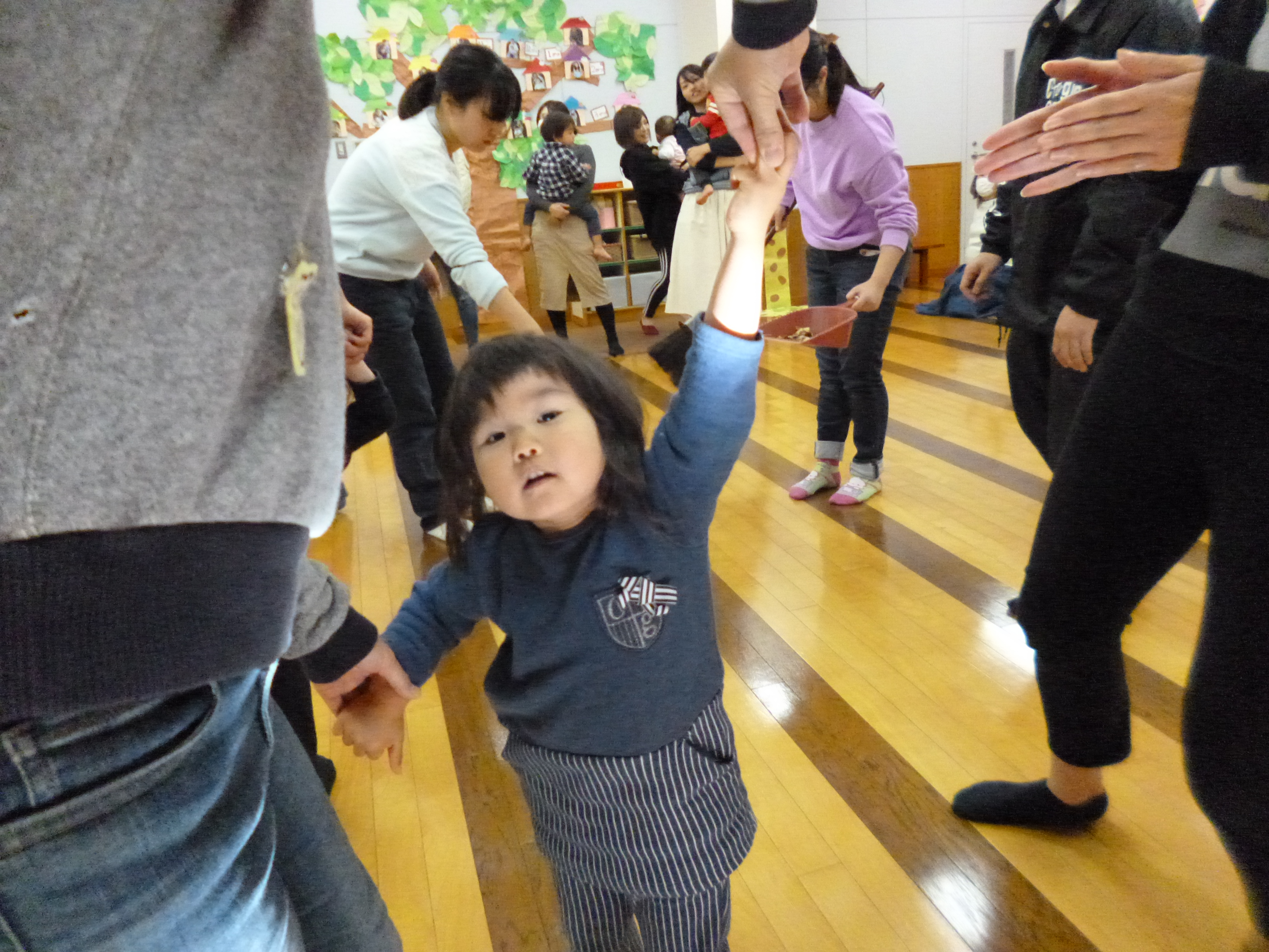 早速、床を手で叩く音で遊びます。これ、みんなでやると実に楽しい!繰り返すうちに、だんだん周りの「音」も聞くようになっていくのがわかります。