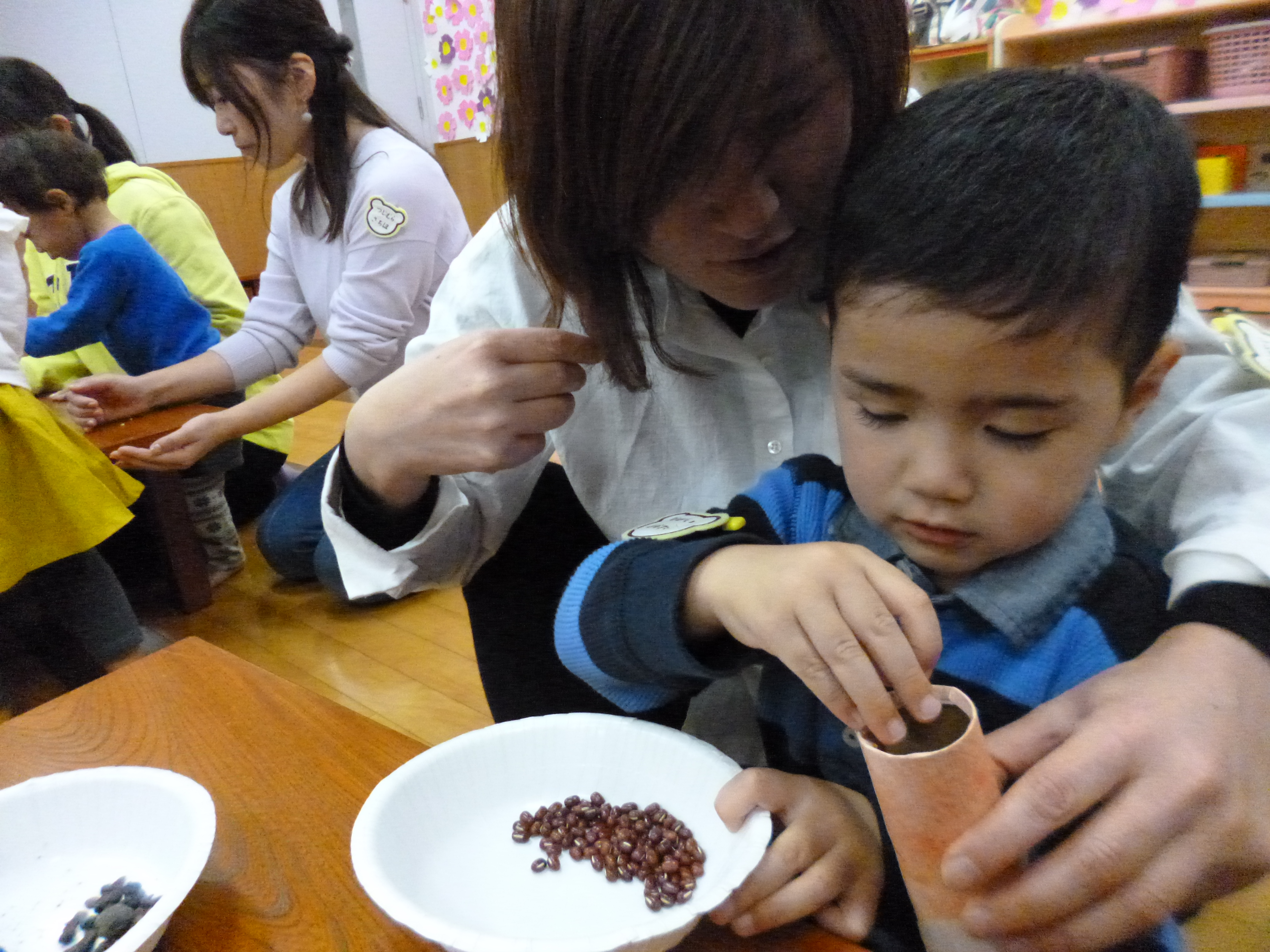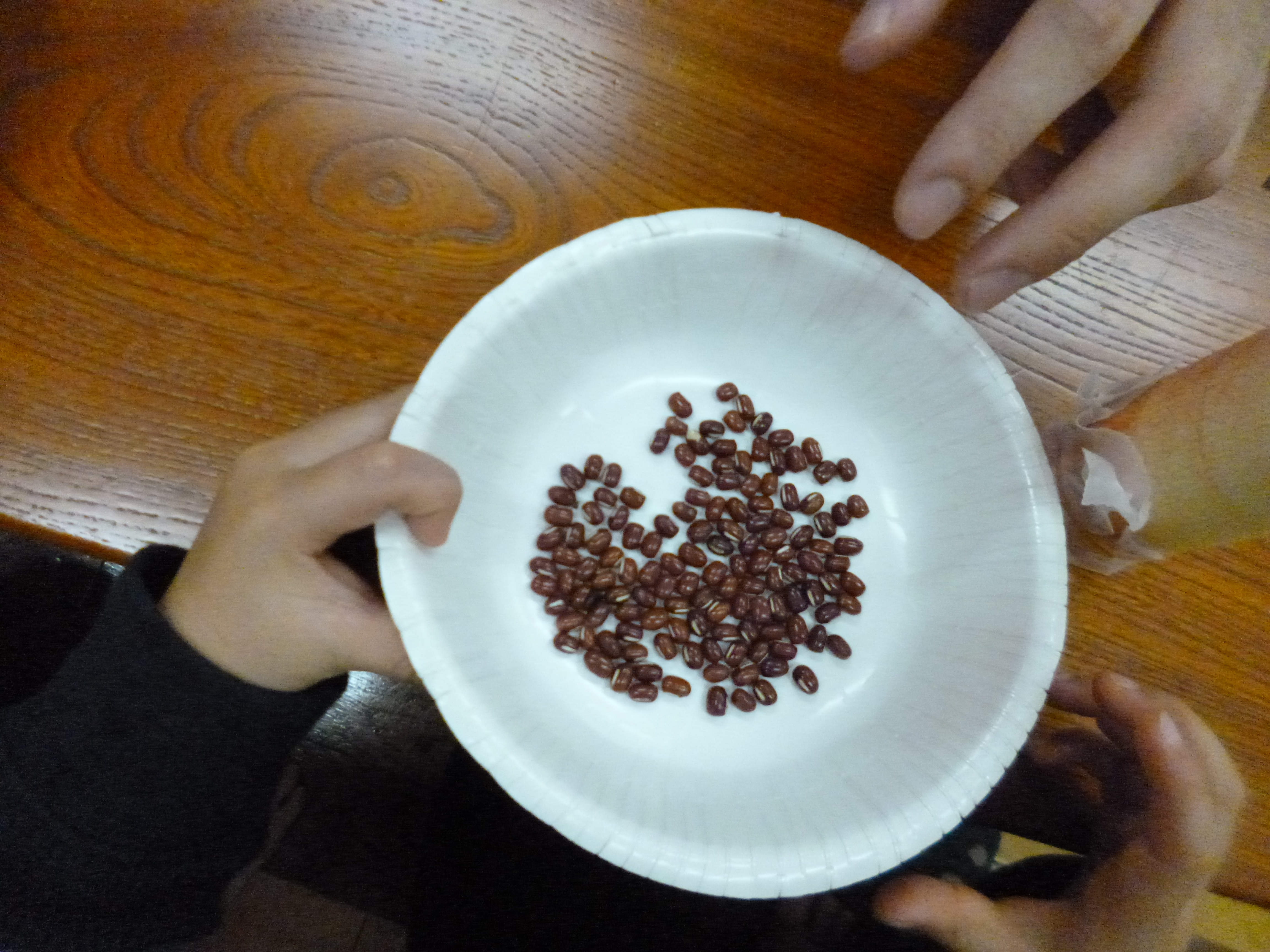 小豆を指でつまんで筒に入れます。