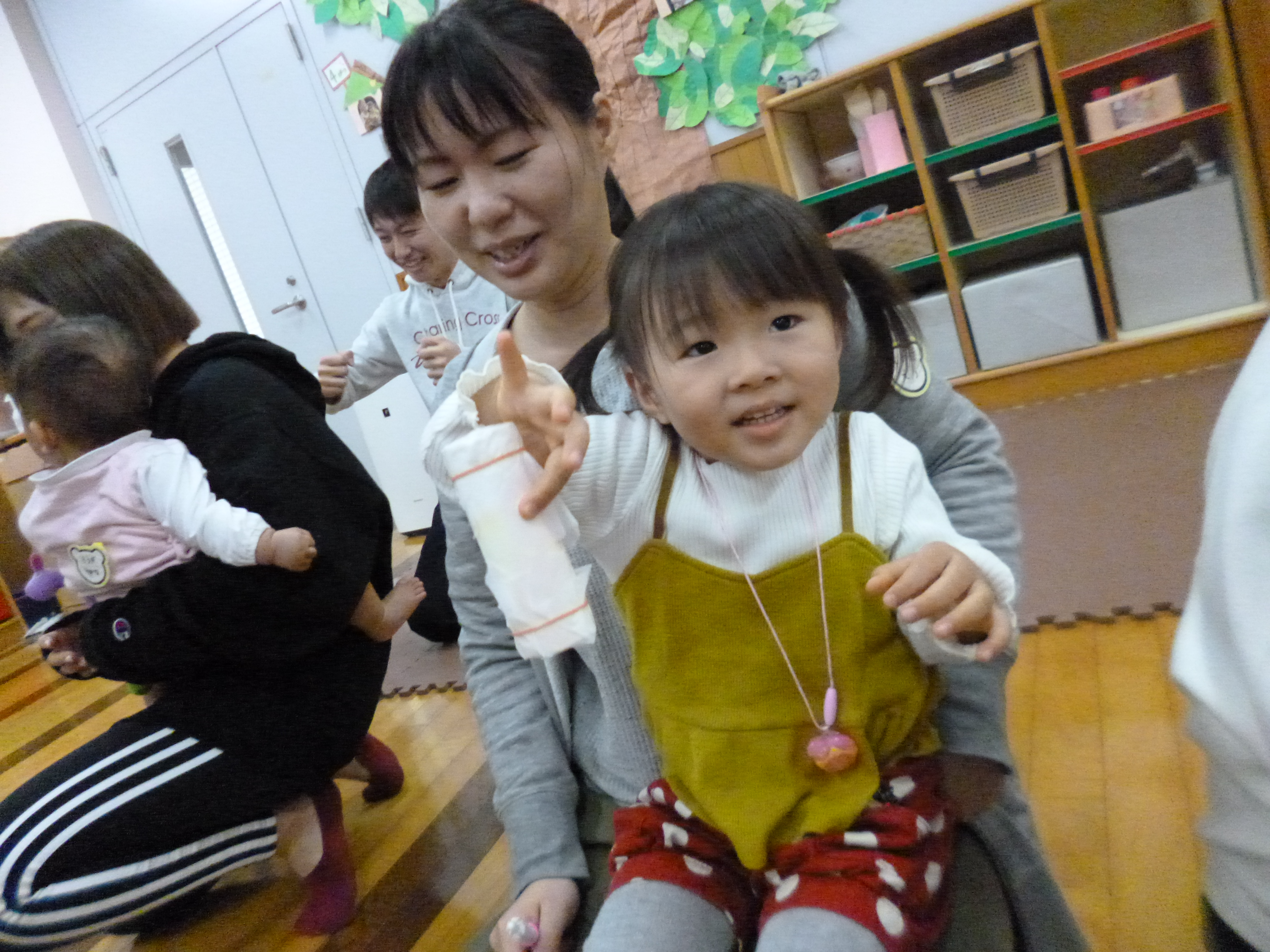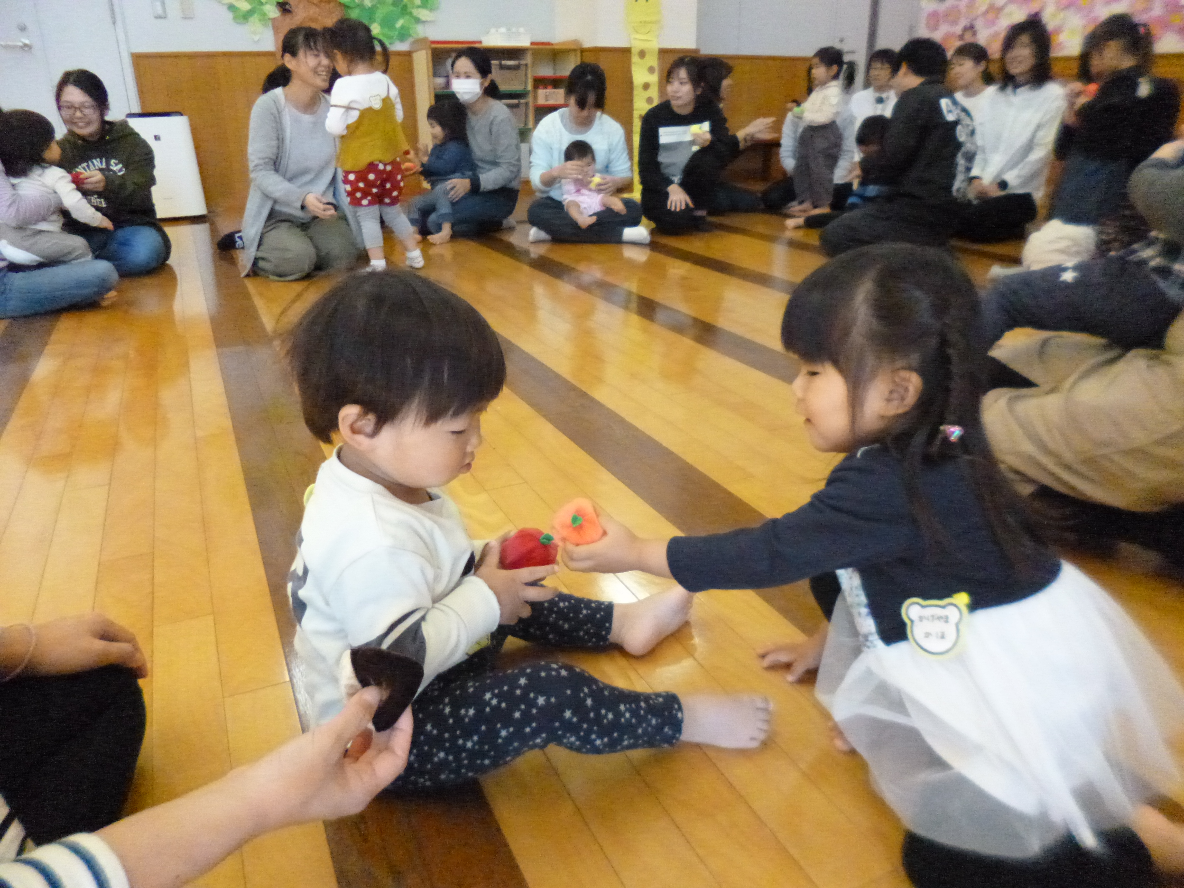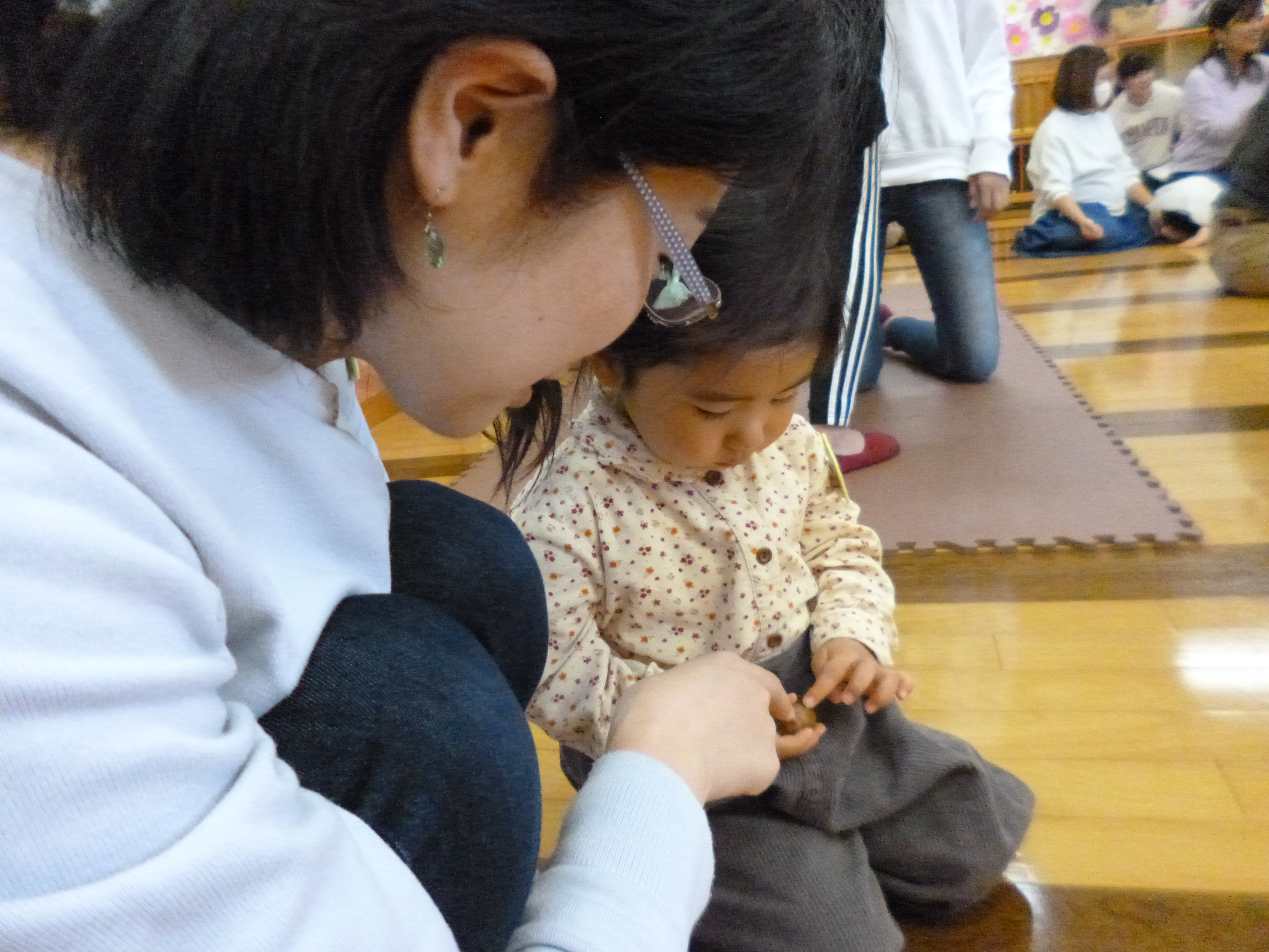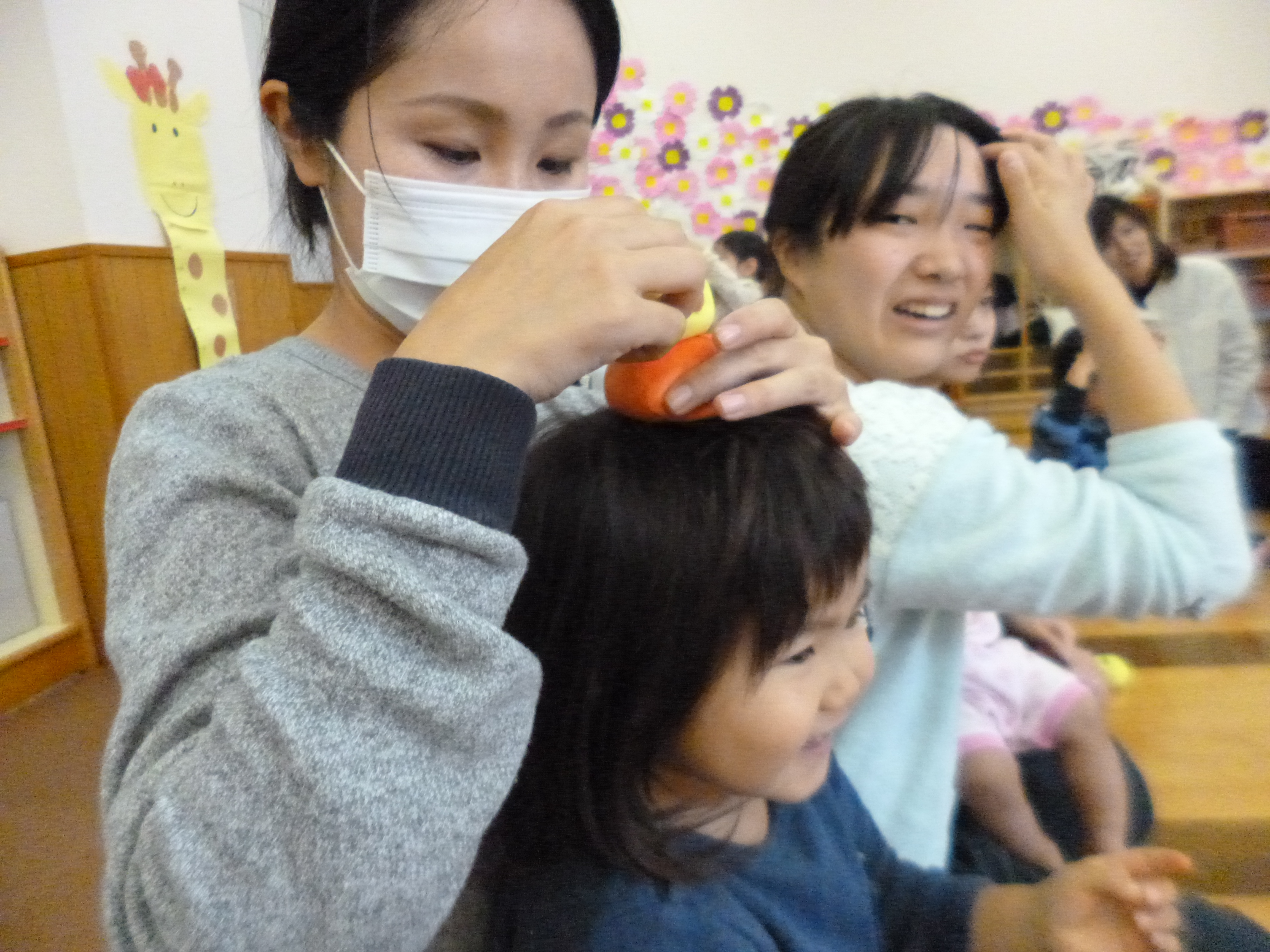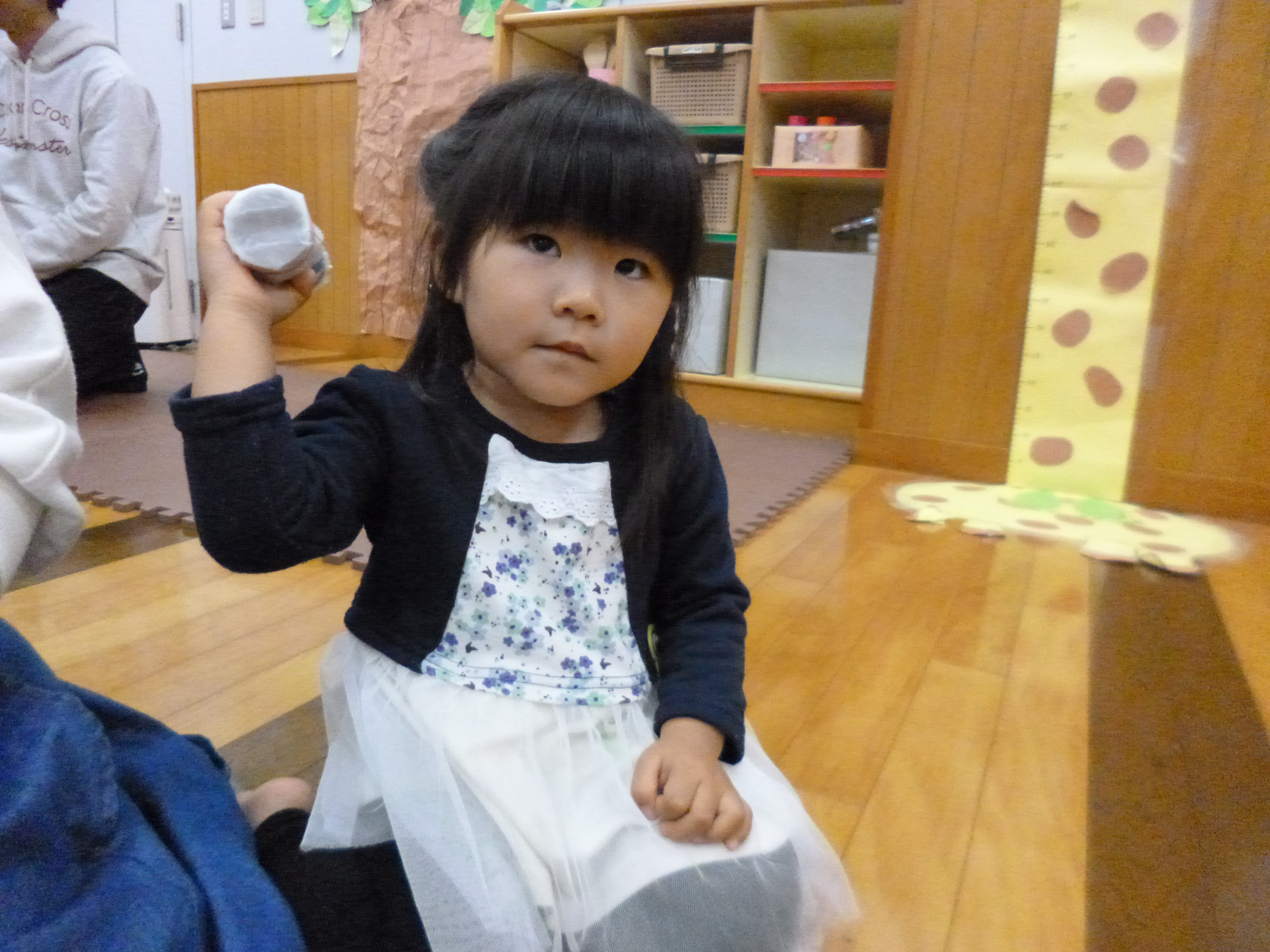 頭にお手玉を乗せて「こんにちは」。・・・この遊び、何度も何度も繰り返し喜んで遊ぶんですね~。