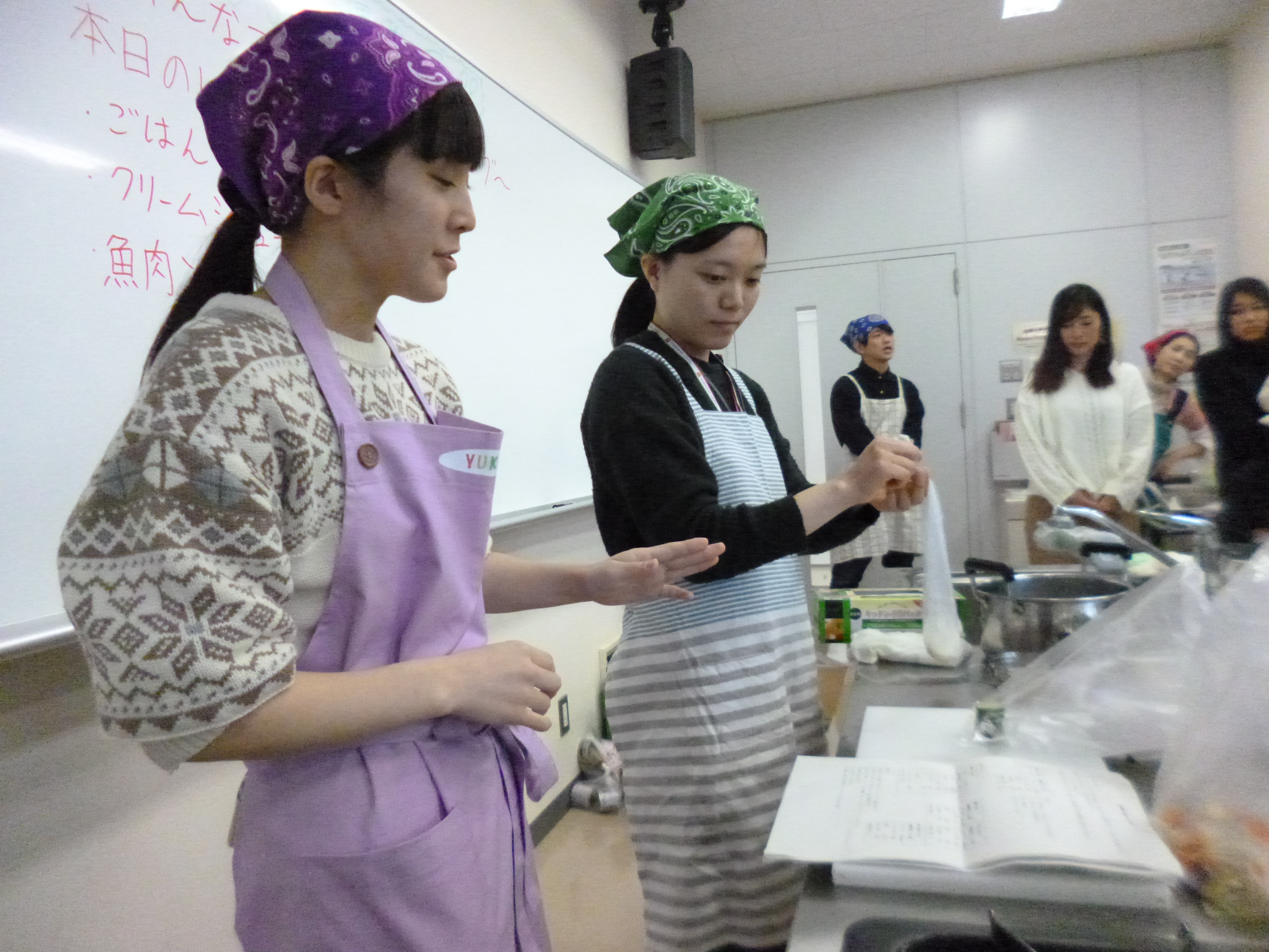 健康栄養学科の先生と学生から、パッククッキングはポリ袋に食材と水を入れて湯せんで火を通す調理法で、1つの鍋でいくつもの調理ができ、貴重な水を何度も使うことができる災害時に便利な方法だとの説明。