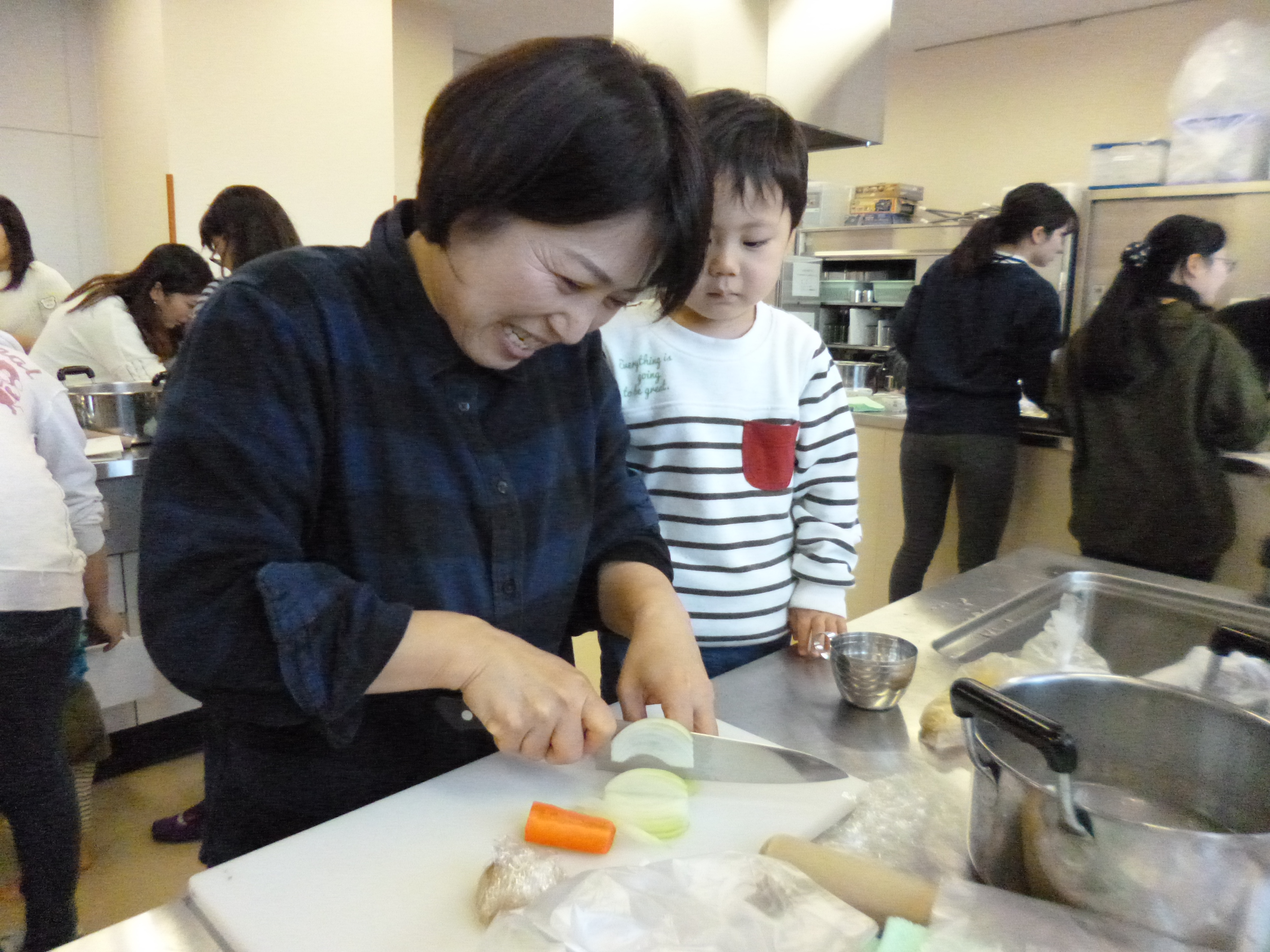 お母さまたち、流石!包丁さばきはお手の物!お子さんも、よ~く見てますね~