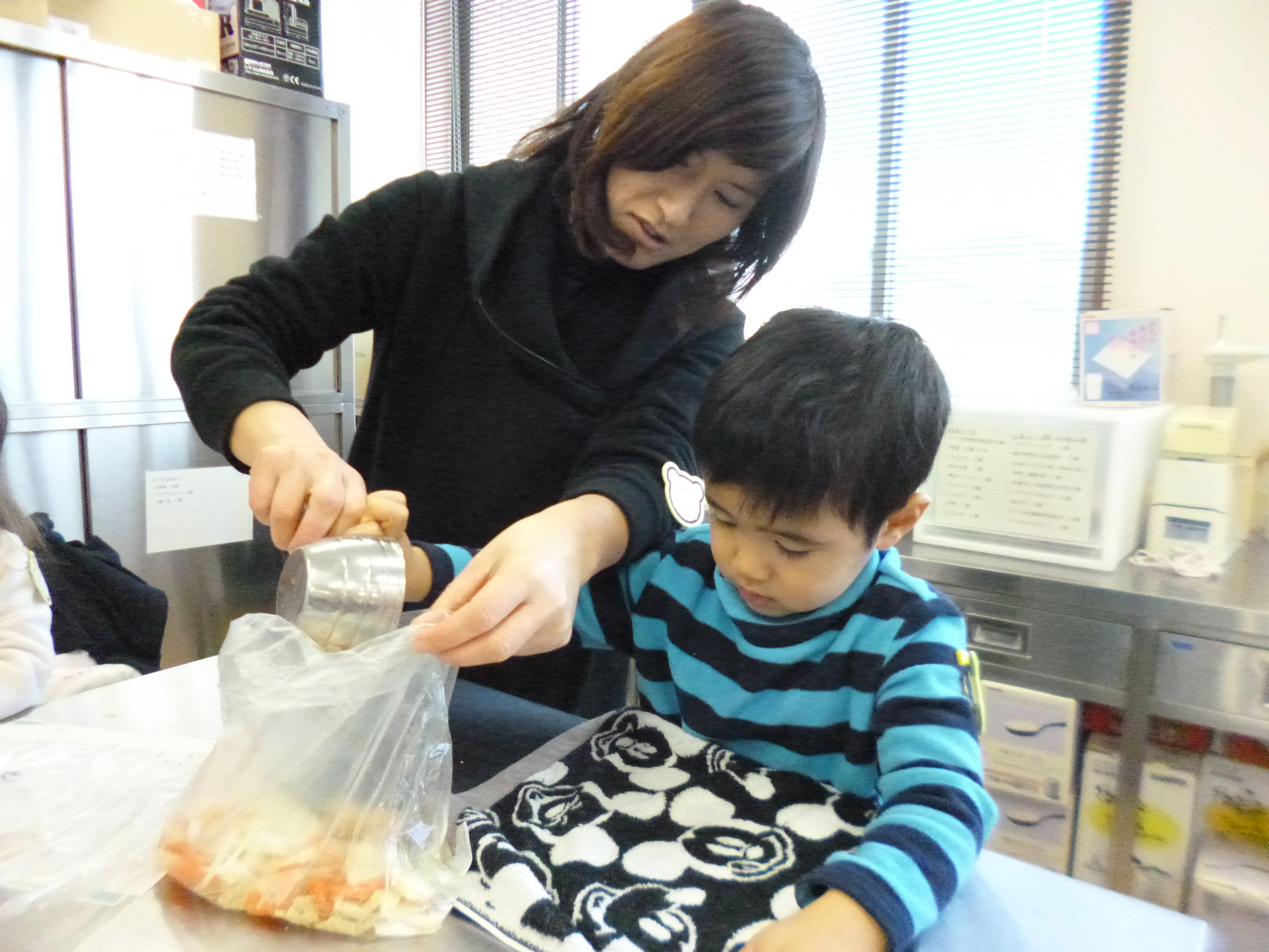 親子で共同作業。切った具材と水を袋に入れて…お湯のお風呂に入れると柔らかくなって…。シチューが楽しみ~♪
