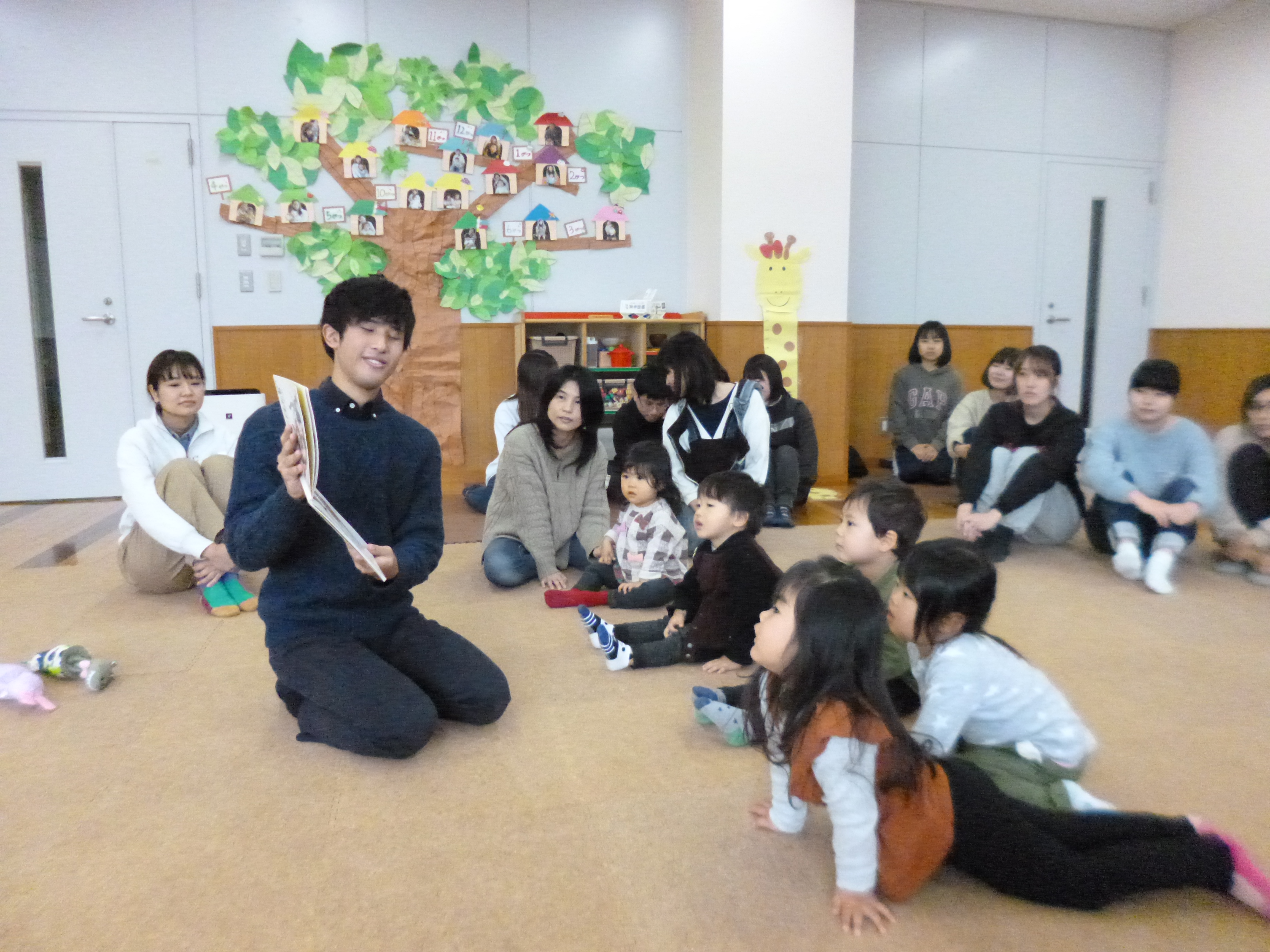 チームポッケの学生たちが、自分で作った手作りおもちゃを使って歌あそび♪ 子どもたちは、人形たちが隠れたり出たりする様子を食い入るように見ていました。