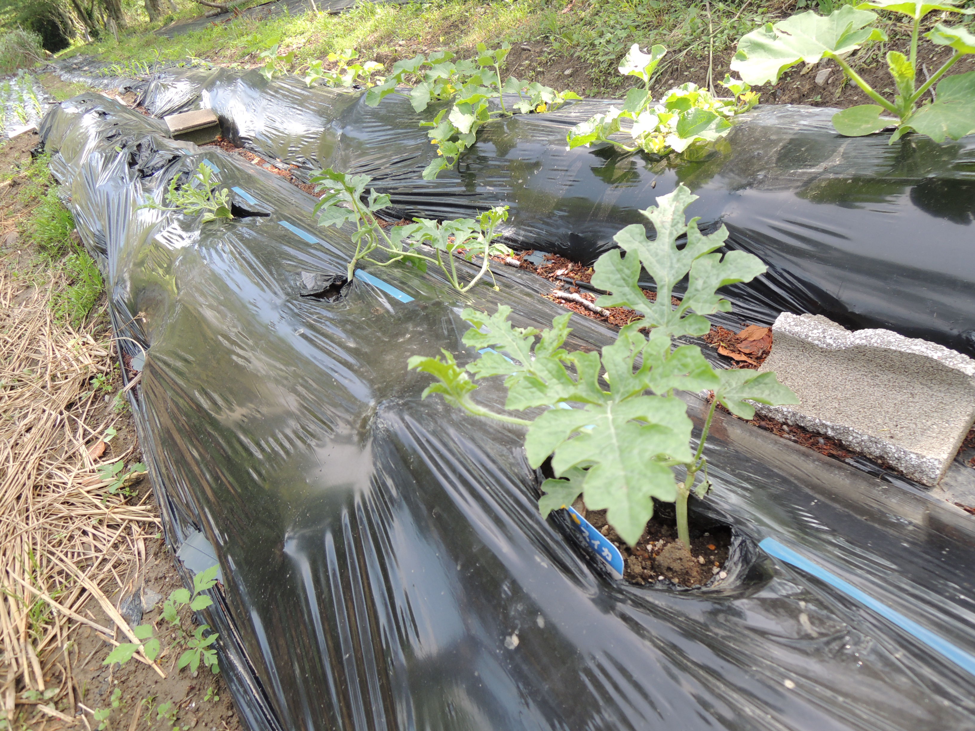 スイカ!その向こうはカボチャだ。トウモロコシもみんな、すくすくと育ってる!