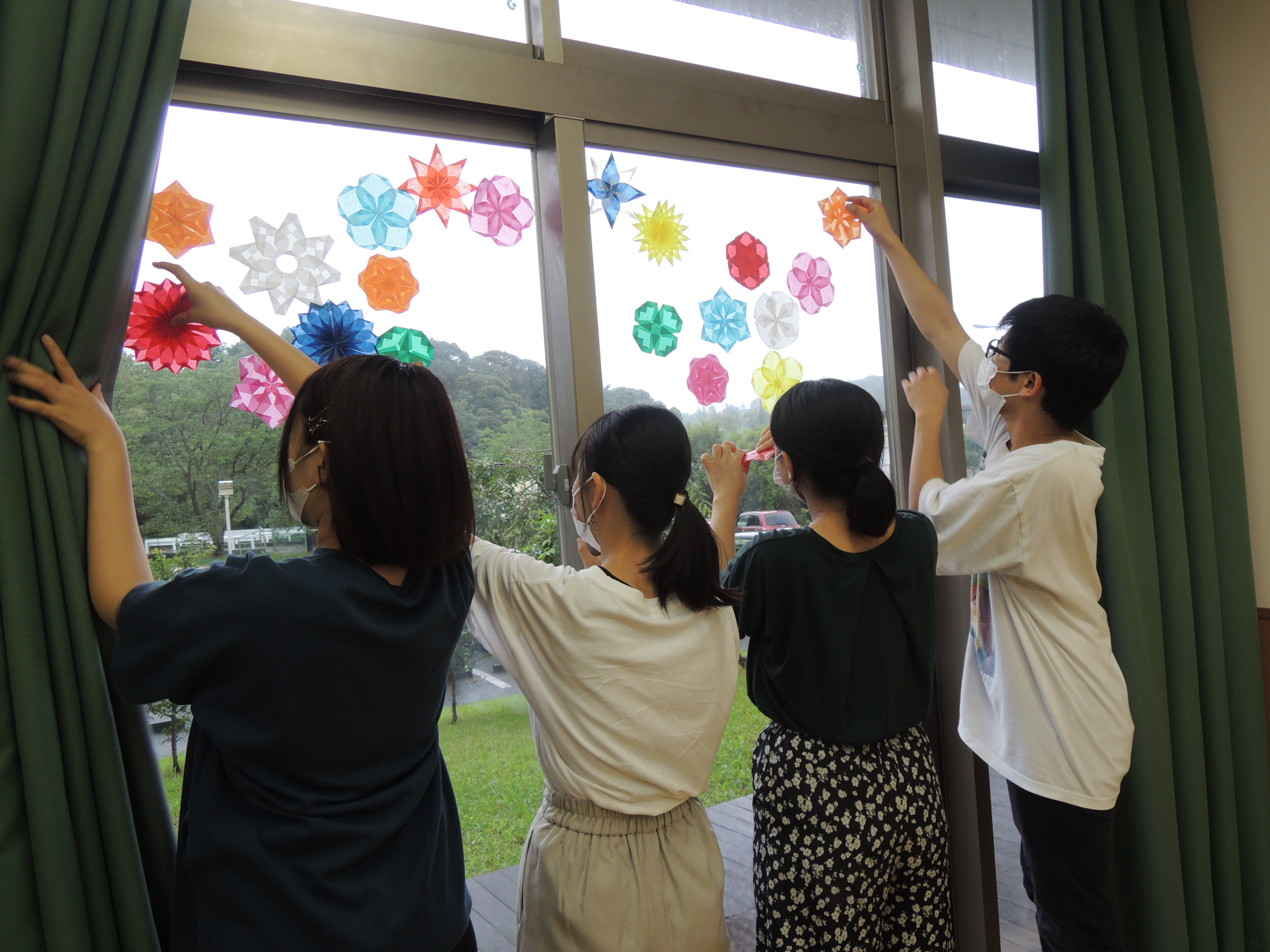 7月9日は、学生から「窓を奇麗にしたい!」の声。窓を掃除した後、ちょうど阿部先生がWEB講座のために作ってあった「トランスパレント」の飾りを窓に貼りました。