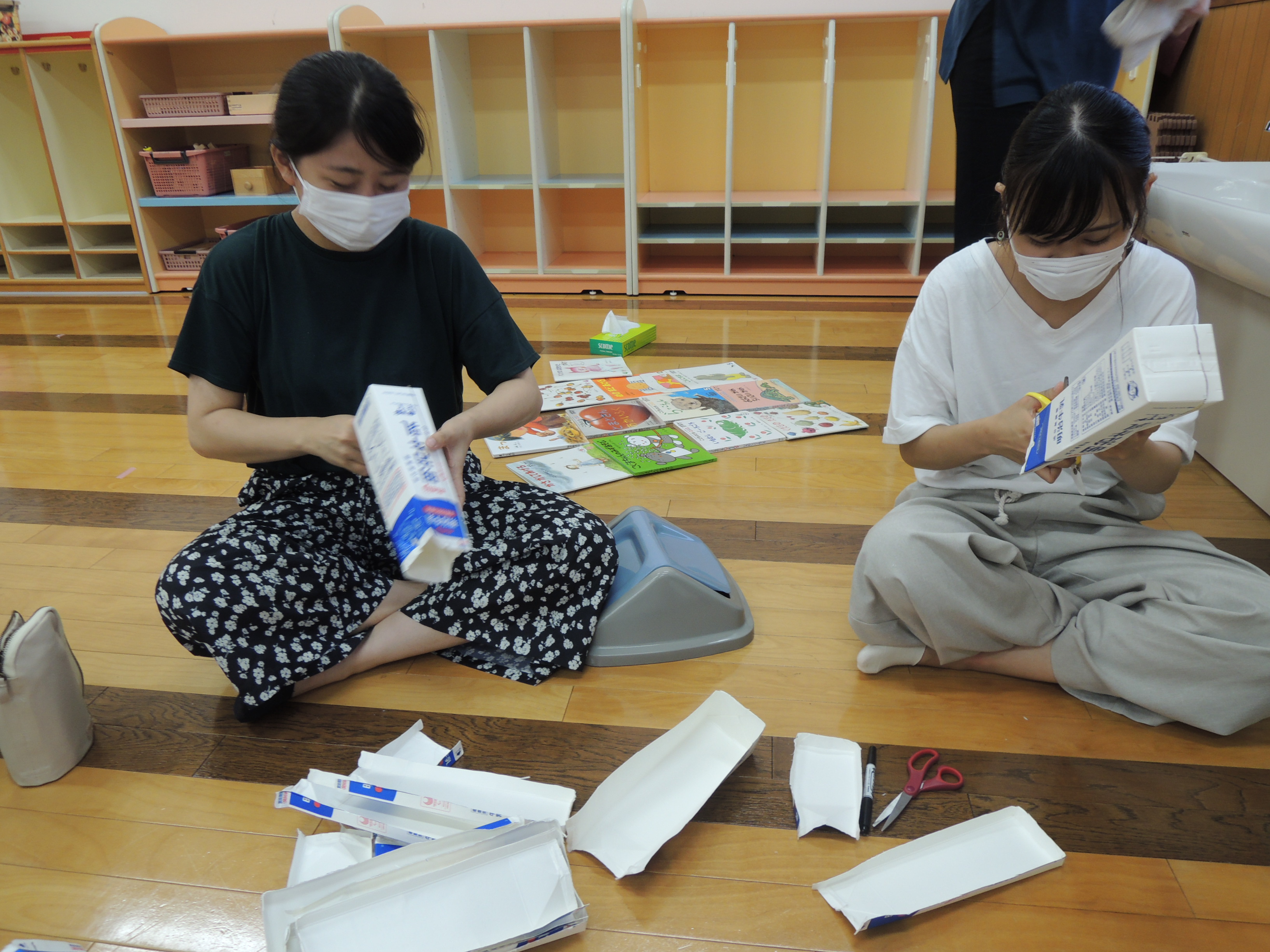 牛乳パックを使って絵本の棚を整えたり、ままごとコーナーつくったりと、ポッケルームの中を奇麗にしました。少人数で短時間でしたが、学生たちの行動力は見事なもの!