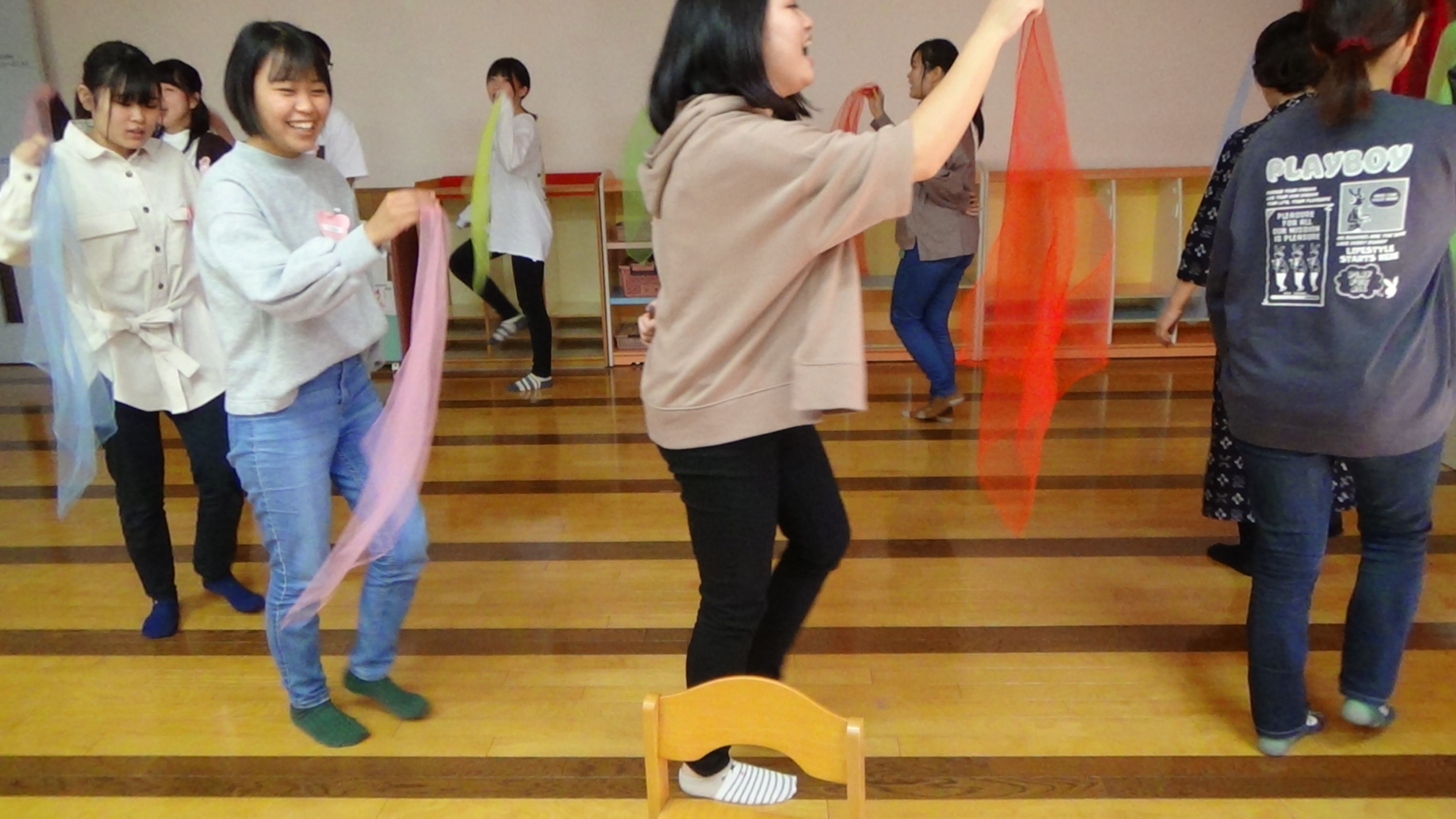 布(スカーフ)を使って・・・。 ♪ももやももや ながれははやい・・・♪
