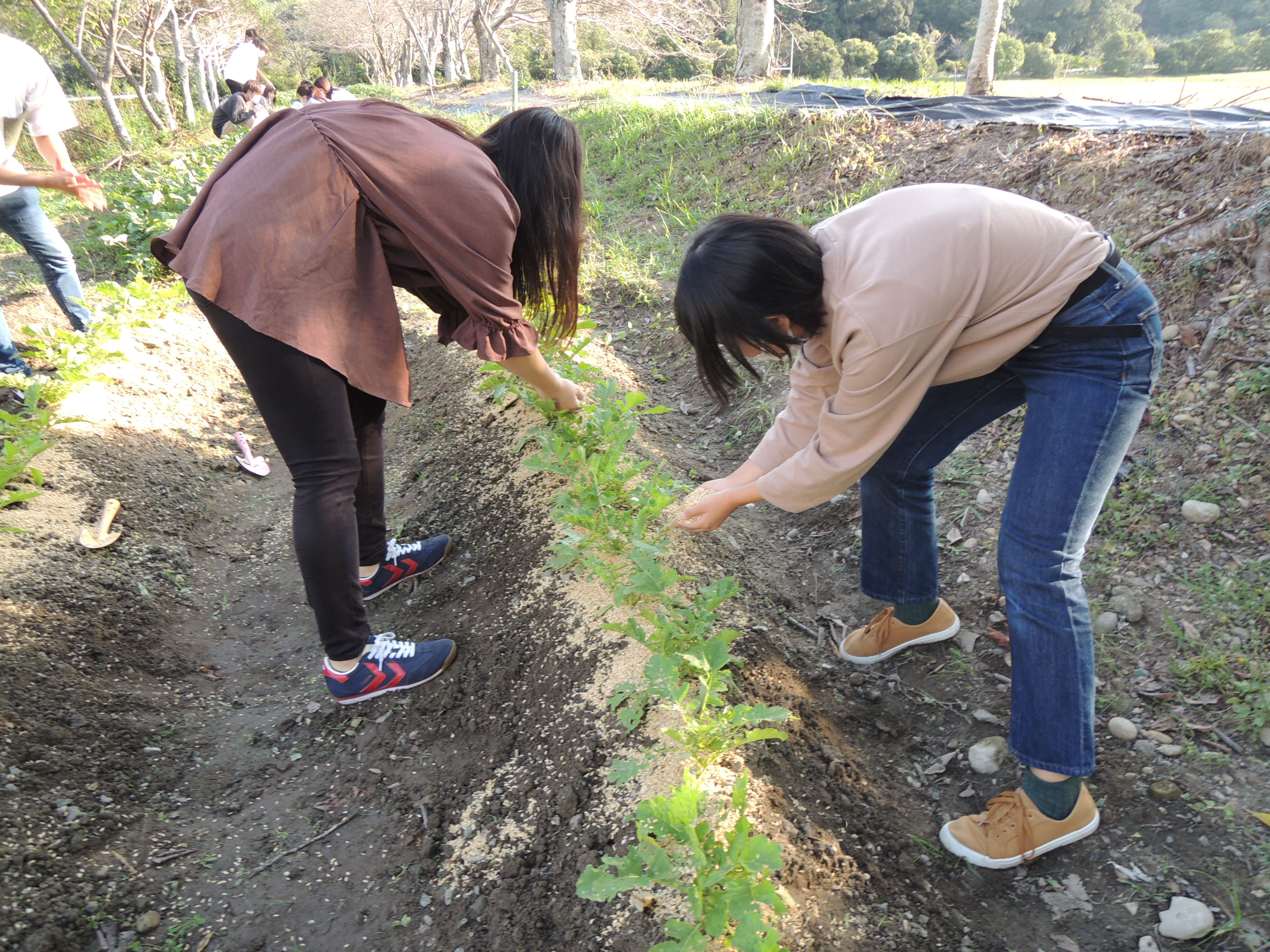 10月15日。もみ殻でマルチング。もみ殻は肥料としても使えるそうです。チームポッケの学生たちが愛情を込めて撒いてくれました。