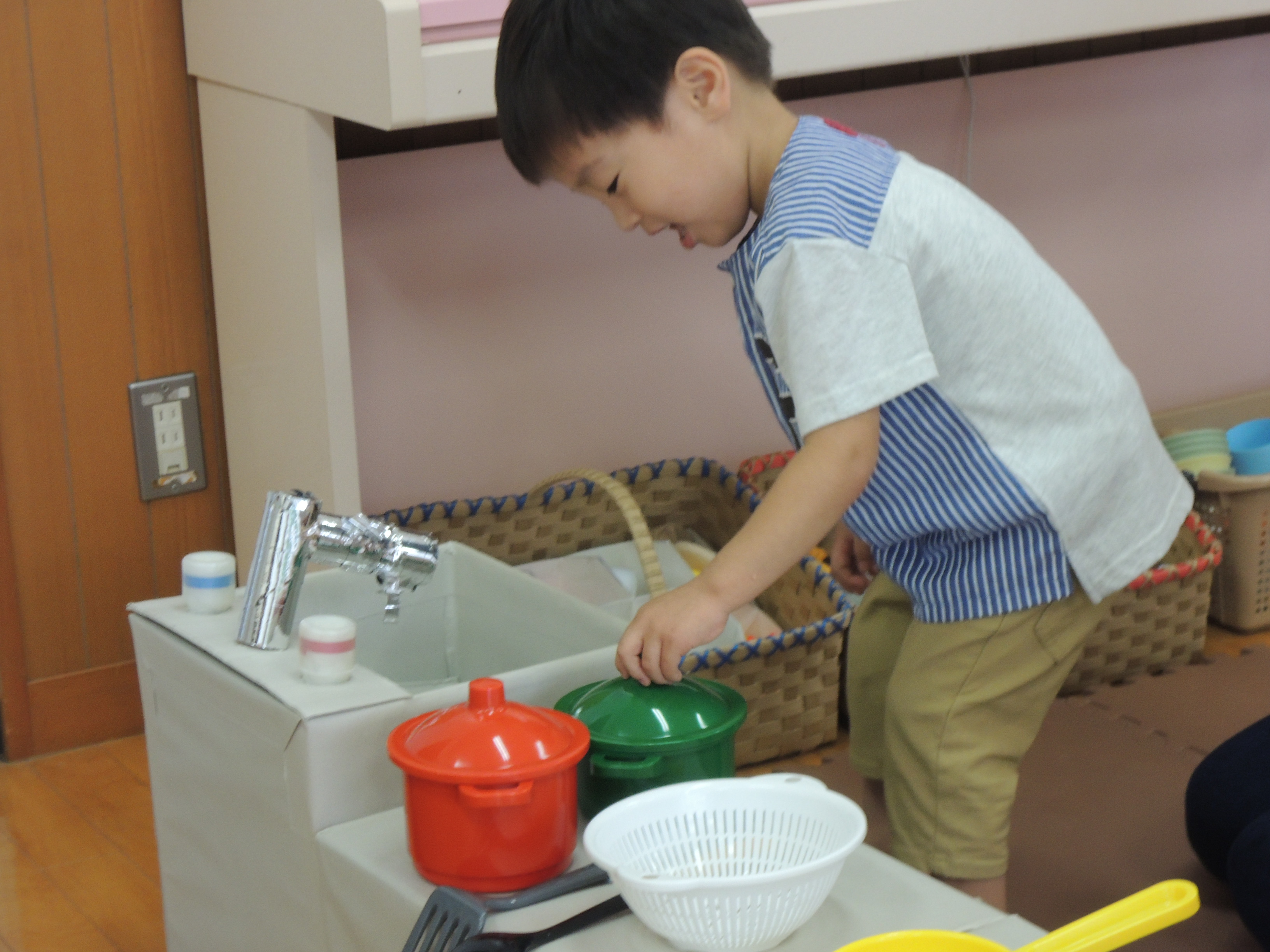 今年度も人気になりつつある、「ままごとコーナー」。朝、ポッケルームに入って思い思いに遊びます。